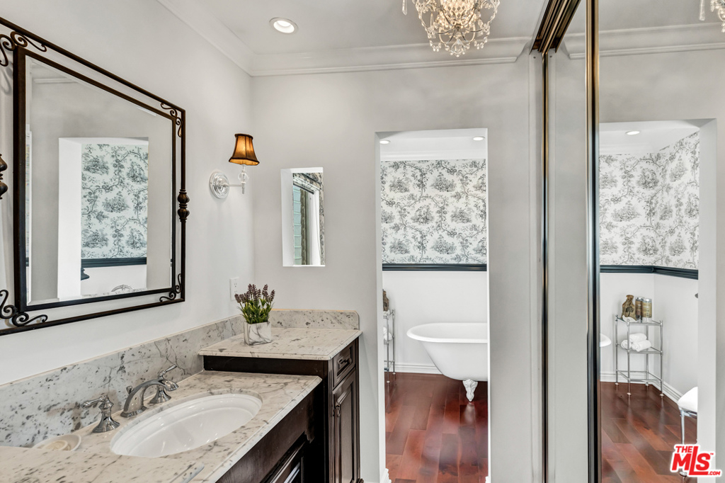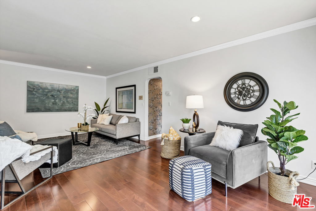 Spectacular, updated two bed, two bath, front-facing Penthouse residence on a quiet cul-de-sac in Westwood. Light and bright spaces with great flow, immaculate designer finishes and dramatic details. This home is the epitome of style and sophistication. Features include a gourmet kitchen w/ farmhouse sink, marble countertops and custom cabinetry. Dining area with gorgeous architectural bay window. Enjoy the spacious great room, with rich, wood flooring, sitting room & sliding glass door to an inviting private balcony. Sensational master suite with gorgeous, renovated bath with Carrera marble counters, rich espresso cabinetry + clawfoot soaking tub + shower. Large second bedroom with room for desk. Luxurious full guest bath with pedestal sink, tub/shower and subway tile wainscoting with accented tile chair rail. SW Corner w/ only 1 common wall. Smaller, well maintained building w/ pool. Earthquake Ins. included. Great location adjacent to Westwood Park, minutes to UCLA and Century City.