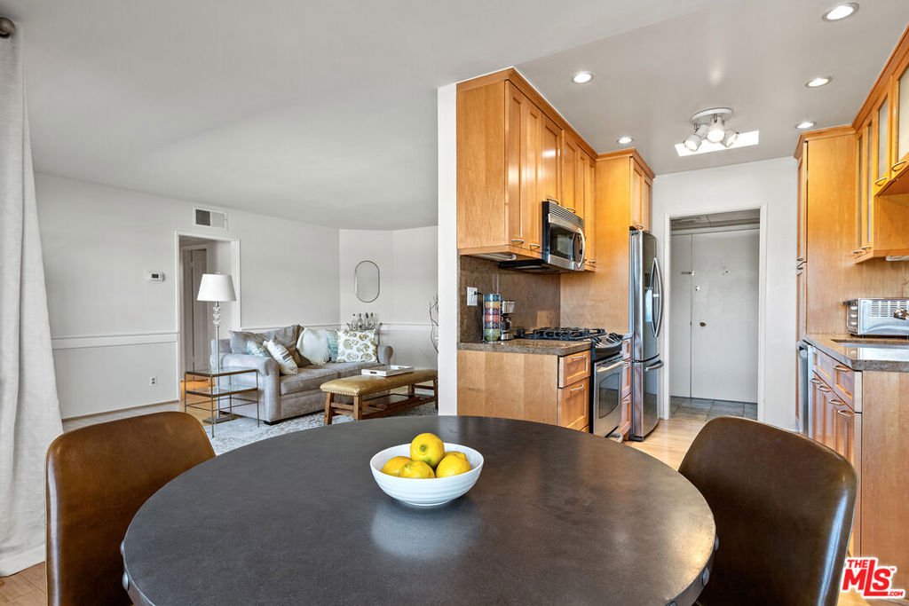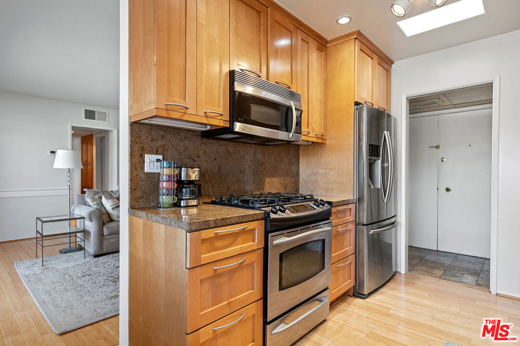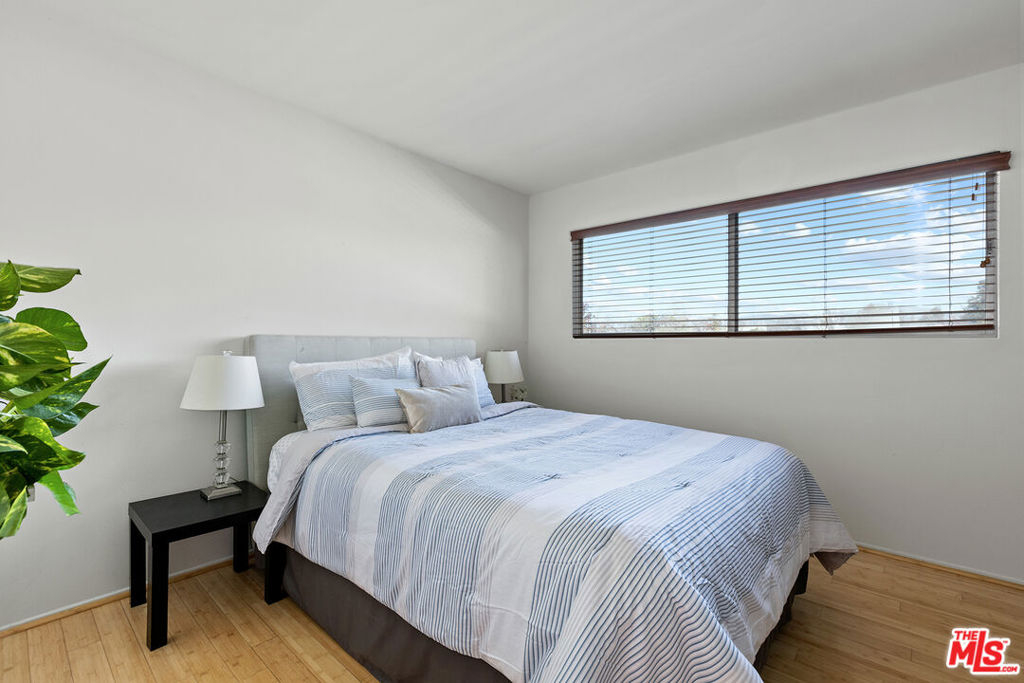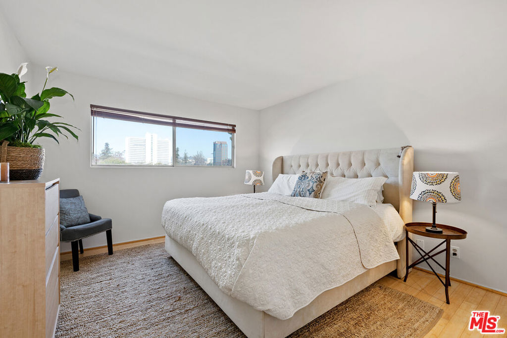 Fantastic two bed, two bath Penthouse on a quiet cul-de-sac in Westwood. This view property has bamboo floors, a generous kitchen with granite countertops and stainless steel appliances, and spectacular views of the sky and mountains. The master bedroom is bright and has a massive walk-in closet. The master bath has beautiful marble countertops, separate shower stall with a bench and skylight. The second bedroom is spacious and bright with a large custom closet. The building has gorgeous landscaping and a sparkling pool. All of this is within walking distance to Westwood Park and UCLA.