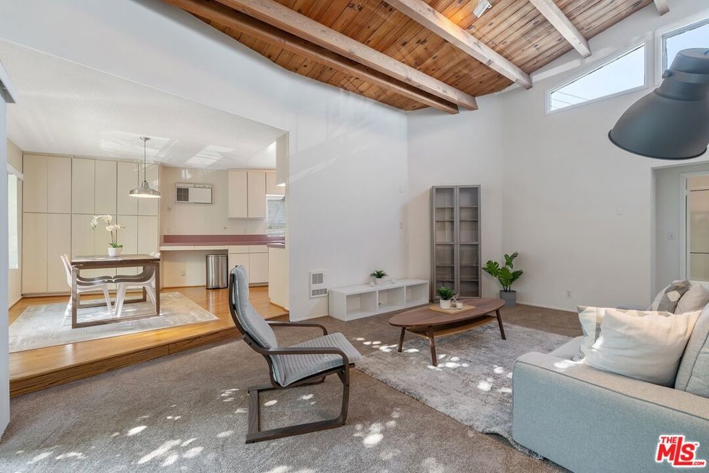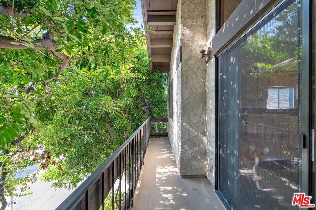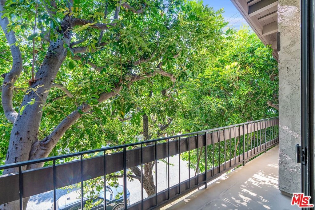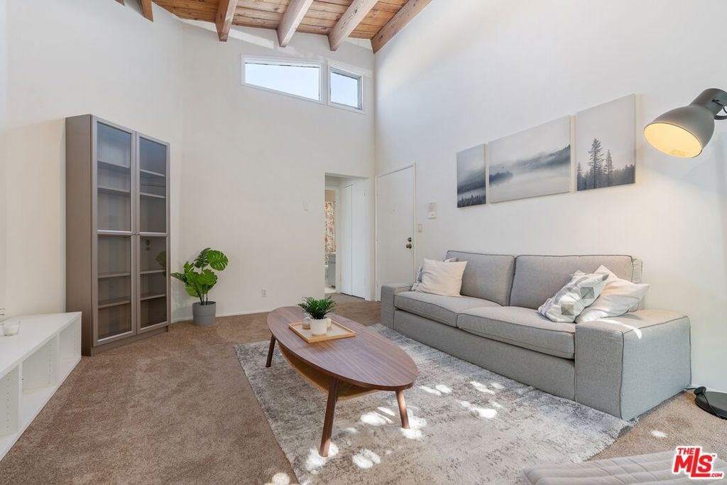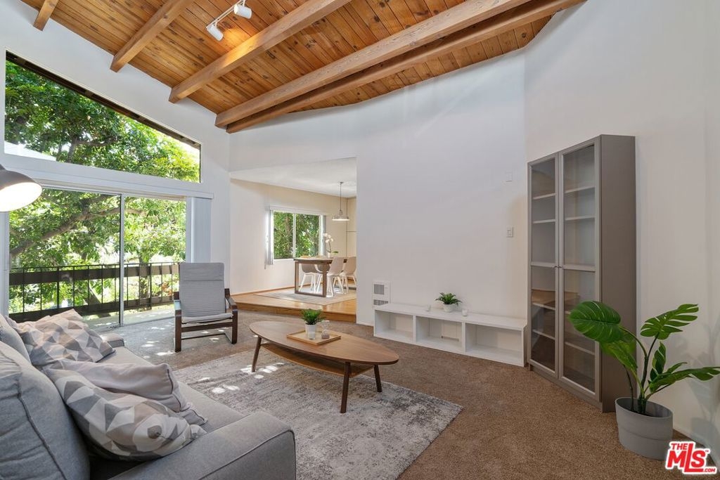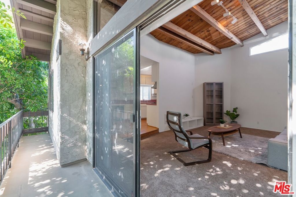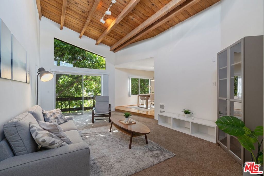 Don't miss this stylish and bright, top floor unit with high ceilings and treetop views. Front facing and surprisingly private, this corner unit is something special! A generous living room with natural wood beamed ceiling flows directly toward a "wall of windows" and sliding door to large balcony. The windows and natural light continue to the dining area and kitchen. The kitchen and dining area feature wood flooring which combined with the beamed ceilings and view give this unit the feel of vacation retreat. It's worth mentioning that the sizable bedroom has 2 closets with built-in dresser and shelving. The full bath and in-unit laundry round out the efficient yet amazingly roomy floor plan. With plenty of storage throughout, plus 2 tandem parking spaces and extra storage in the garage this unit is a must see. Conveniently located to freeway access and all that Westwood and Century City have to offer.