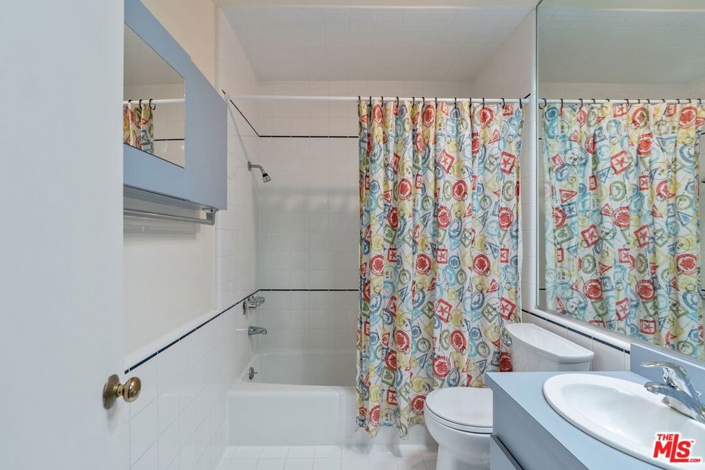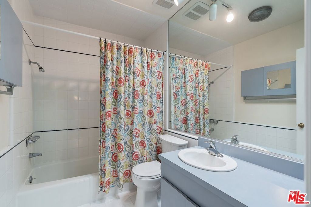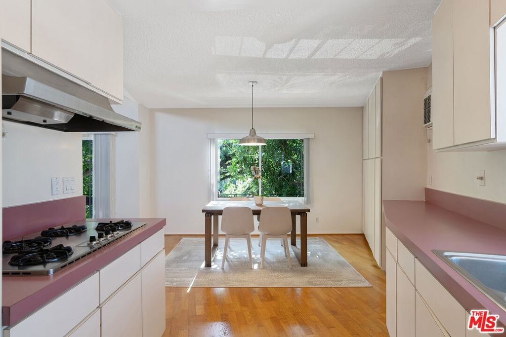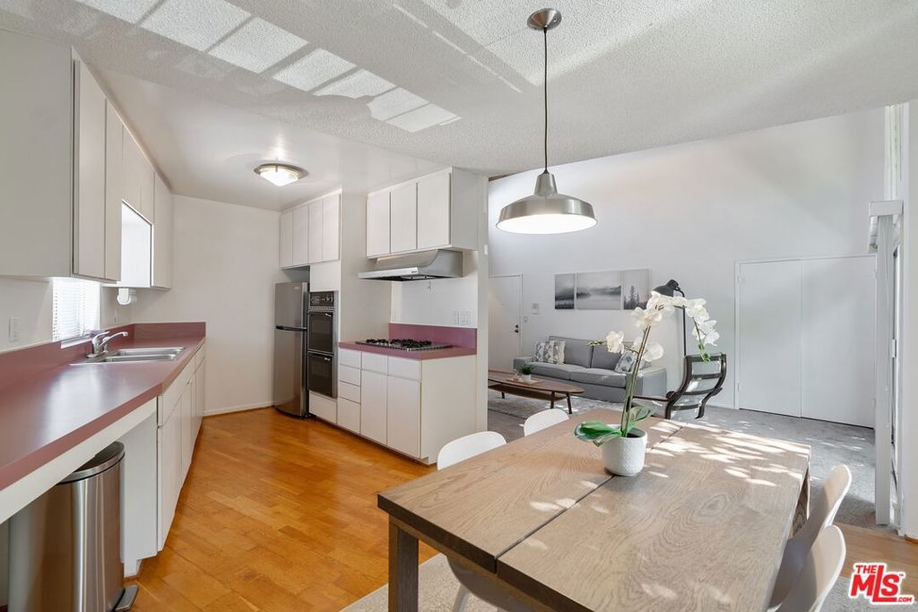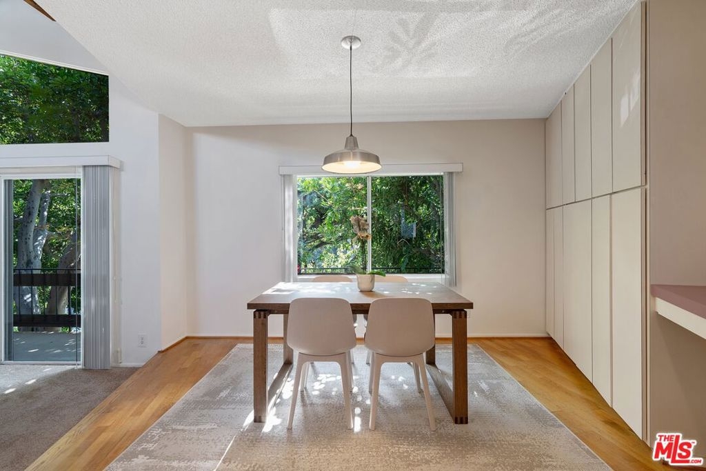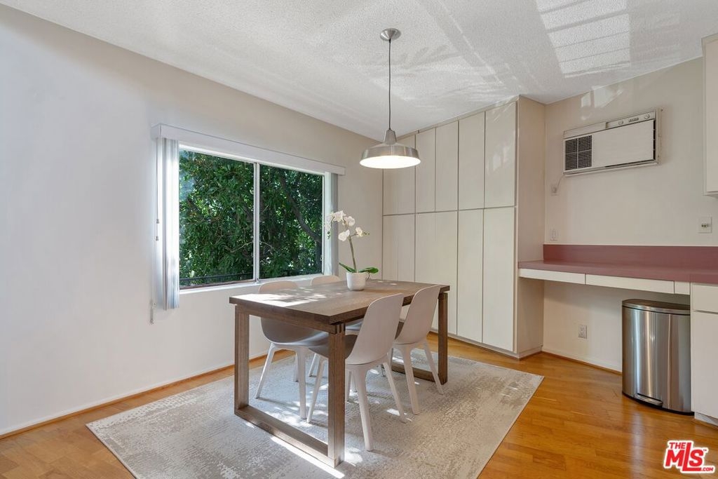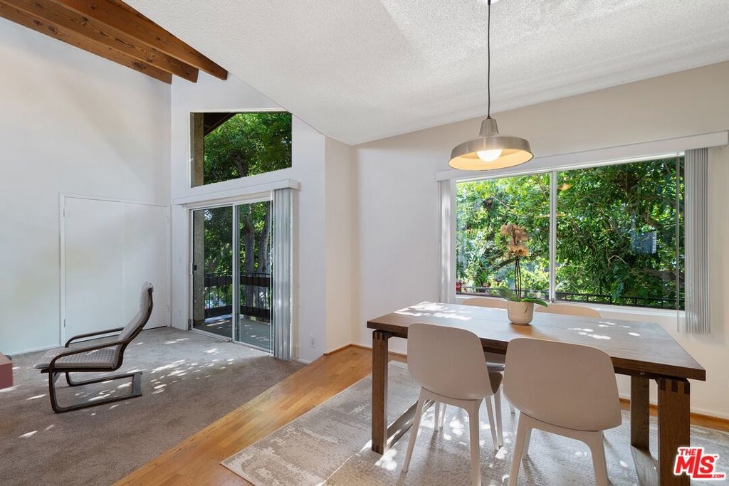 Don't miss this stylish and bright, top floor unit with high ceilings and treetop views. Front facing and surprisingly private, this corner unit is something special! A generous living room with natural wood beamed ceiling flows directly toward a "wall of windows" and sliding door to large balcony. The windows and natural light continue to the dining area and kitchen. The kitchen and dining area feature wood flooring which combined with the beamed ceilings and view give this unit the feel of vacation retreat. It's worth mentioning that the sizable bedroom has 2 closets with built-in dresser and shelving. The full bath and in-unit laundry round out the efficient yet amazingly roomy floor plan. With plenty of storage throughout, plus 2 tandem parking spaces and extra storage in the garage this unit is a must see. Conveniently located to freeway access and all that Westwood and Century City have to offer.