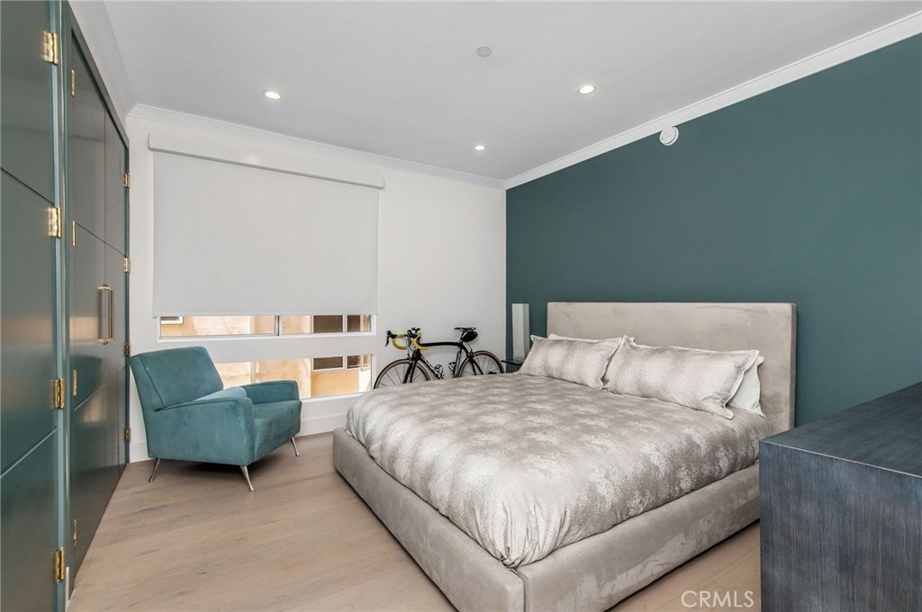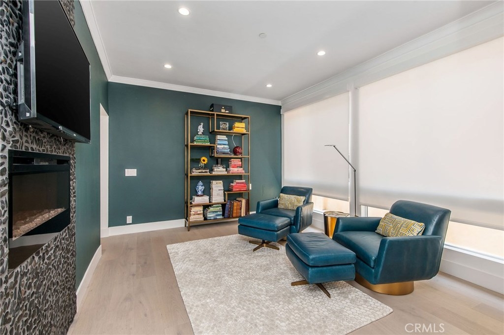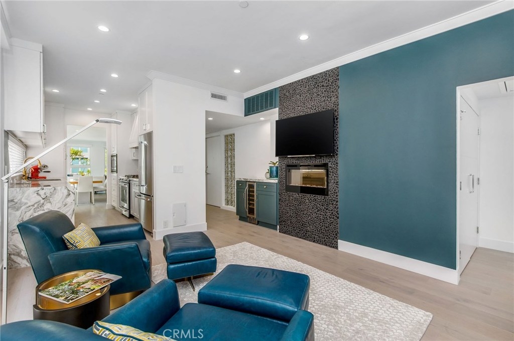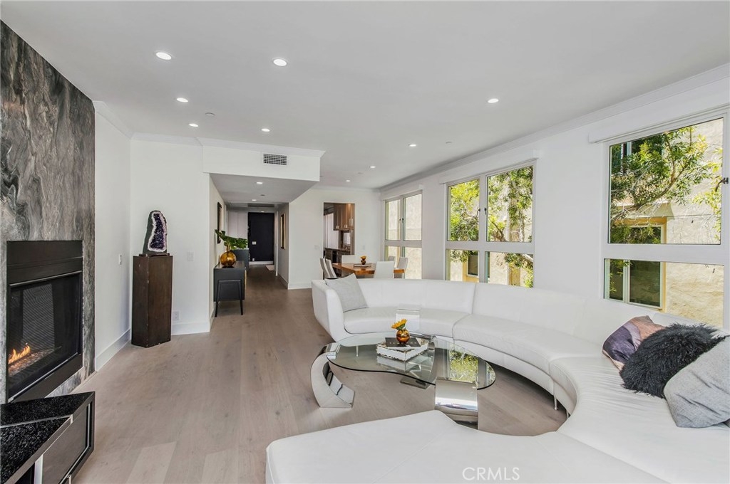 This sophisticated remodel is located on a lovely tree-lined street in prime Westwood. No expenses spared! Upon entering, you are welcomed by the large open living space, high ceilings, floor to ceiling windows with treetop views, Italian engineered wood floors, custom remote-controlled light-filtering blinds, gorgeous fireplace flanked by a stunning single slab of Brazilian stone with leather finishing. The gourmet kitchen offers high-end custom wood cabinets, storage, slow close drawers, and European quartz countertop with elegant waterfall installation. The stunning backsplash is a glass mosaic herringbone pattern. The den offers the second custom fireplace, floor to ceiling windows with remote control blinds. The ensuite bedroom retreat is just that with elegant wood floors, custom-designed wood closet with drawers, plenty of storage, and the third fireplace with European tiles and remote control blackout blinds. The luxurious ensuite bathroom features a free-standing tub, gorgeous European tiles, and stunning hand-done Venetian plaster with a wax finish. The large second bedroom offers automatic remote-control blackout shades, custom-built closets, solid wood doors, built-in drawers, shoe racks, and tons of space. The elegant 2nd bath uses distinctive Herringbone marble tiles. Great location walk to Westwood Charter, close to restaurants, Century City, UCLA, freeways and new Google Campus. See the video and list of improvements attached.