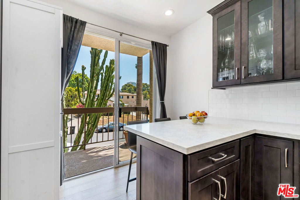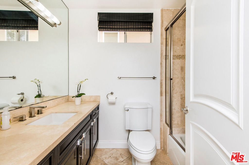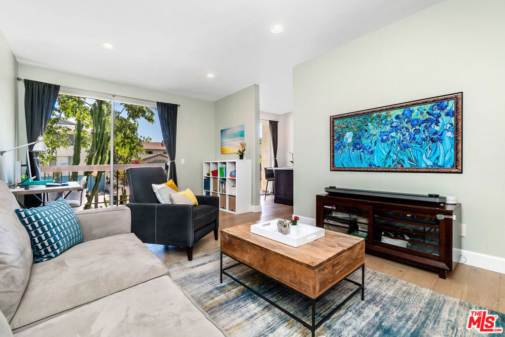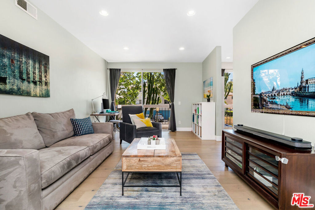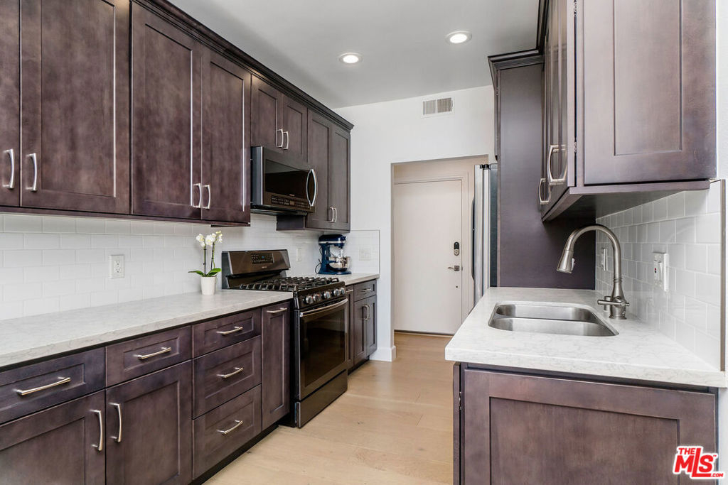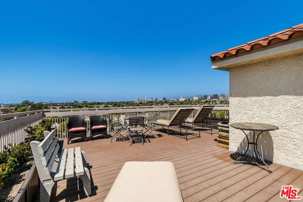 An abundance of natural light creates a feeling of warmth and comfort throughout this beautiful single-level condo featuring an inviting layout with wide oak plank flooring, high ceilings and recessed lights. The recently remodeled gourmet kitchen is a cook's dream with quartz countertops, subway tile backsplash, stainless-steel edge trim, breakfast bar, built-in microwave, striking dark cabinetry with soft closing cabinets/doors and a black stainless-steel large capacity French door-in-door smart Wi-Fi refrigerator with ice maker and water filter. Off the kitchen and spacious living room is an oversized double balcony perfect for al-fresco dining or morning coffee. Two spacious bedrooms with en-suite bathrooms are on opposite sides of the unit, ample closet space and a large walk-in closet in the primary bedroom. Other features include an in-unit laundry closet, Nest thermostat, Yale touchscreen smart keyless door lock, central AC and two parking spaces. This charming private and gated 15-unit building features a courtyard with a soothing fountain and an incredible rooftop terrace with 360 breathtaking views. Located on a tree-lined permit parking street located near Hillcrest Country Club, Rancho Park Golf Course, Cheviot Hills Recreation Center, Westfield Century City, Fox Studios, Google office campus, Beverly Hills and Westwood Charter Schools.