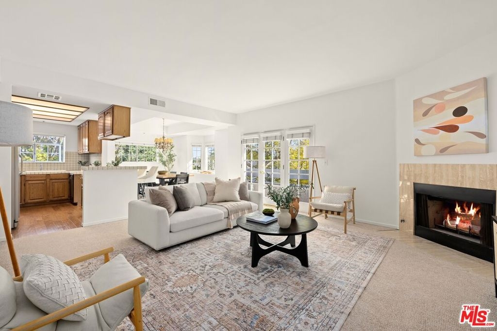 Welcome to this charming corner unit in a desirable Westwood neighborhood, tucked away below the Wilshire Corridor on a desirable street. The light-filled living room features a glossy stone fireplace and French doors that open to a balcony with views of lush treetops and the modern Century City skyline. A wet bar is positioned adjacent to the kitchen which offers abundant cabinet and counter prep space and breakfast bar, perfect for entertaining. The adjacent dining room has an elegant tray ceiling and bay window inviting natural light within. The primary suite features a bathroom with dual-sink vanity and separate tub and shower as well as a walk-in closet with built-ins. Access a private balcony via sliding glass to relax under California skies. The secondary bedroom and bathroom are spacious, and there is in-unit side-by-side laundry. Enjoy the convenience and security of controlled-access subterranean parking with two side-by-side parking spaces, guest parking, and dedicated in-garage storage closet. Experience a comfortable, coveted lifestyle amidst the vibrant social scene of Westwood Village, close to UCLA and the 405 Freeway and just moments to high-end shopping and dining of Beverly Hills and all the Westside offers.