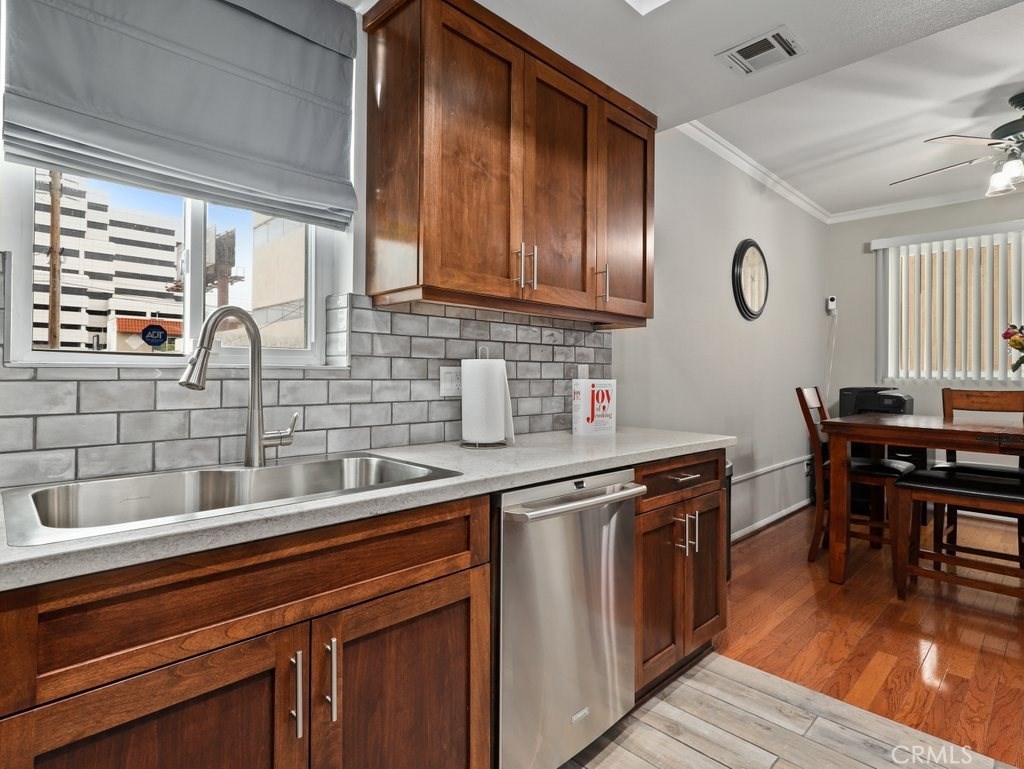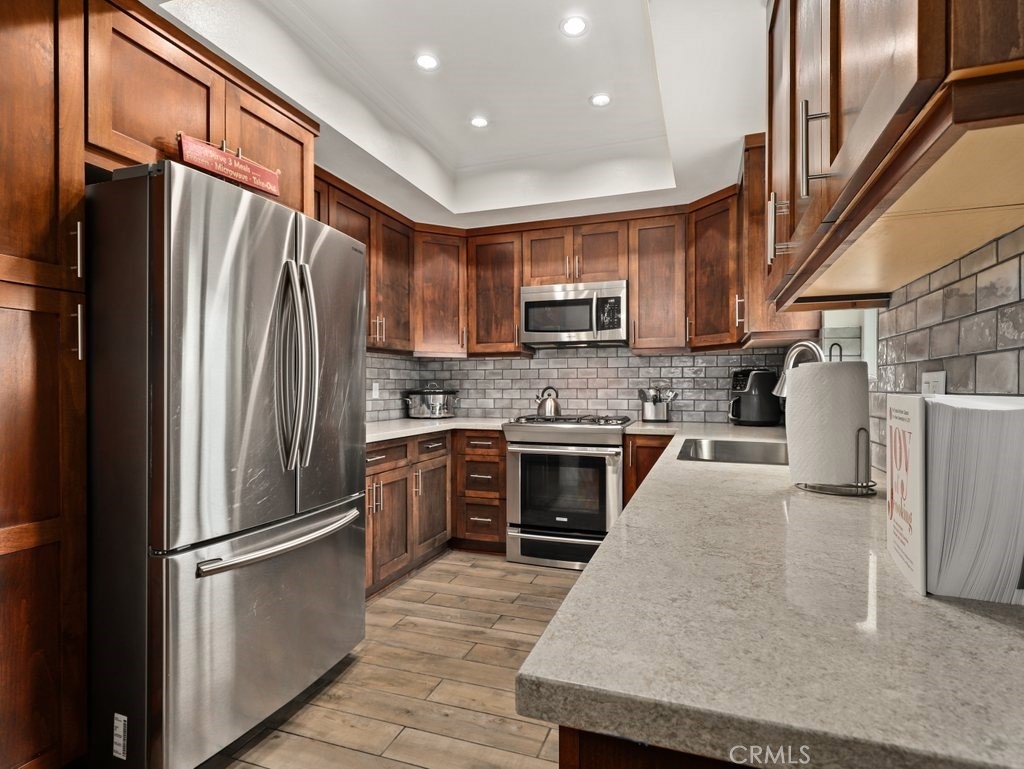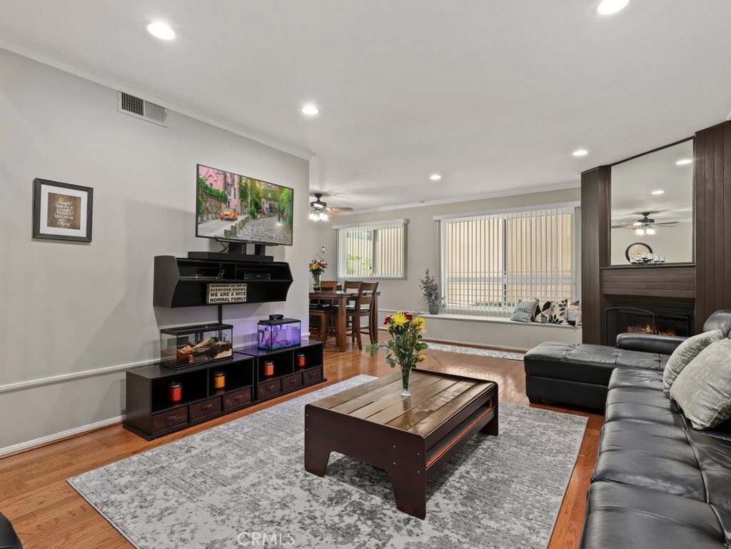 Gorgeous and updated two-level condo home in Westwood, full of light and versatile floor plan that is ideal for any lifestyle. With bedrooms on two levels and a bonus room next to the primary suite, it is ideal for a home office, home school, play room, entertaining room or guest room. This condo is tucked at the back of the building providing privacy and direct garage and street access. The main floor opens with a beautiful living room with hardwood floors that winds around to the dining area and kitchen, making the most out of the space. Large windows flood the room with light and a fireplace adds character. The kitchen was just renovated with contemporary subway tile, quartz counters and stainless steel appliances-- you will want to cook for days! The ground floor also has a spacious bedroom and a stylish bath. The windows and sliding patio door are new and double paned with transferable warranty. Upstairs is a home all on its own with brand new carpet. The primary suite is huge and can easily accommodate a king bed and a sitting area. The room also has a lovely balcony, a large walk in closet, and an updated bathroom with a granite double sink vanity and step in shower. This unit has two parking spots and AC, The community offers basic cable. Ideally located near the 10 and the 405 freeways for convenient access to UCLA, Downtown LA, Century City and more!