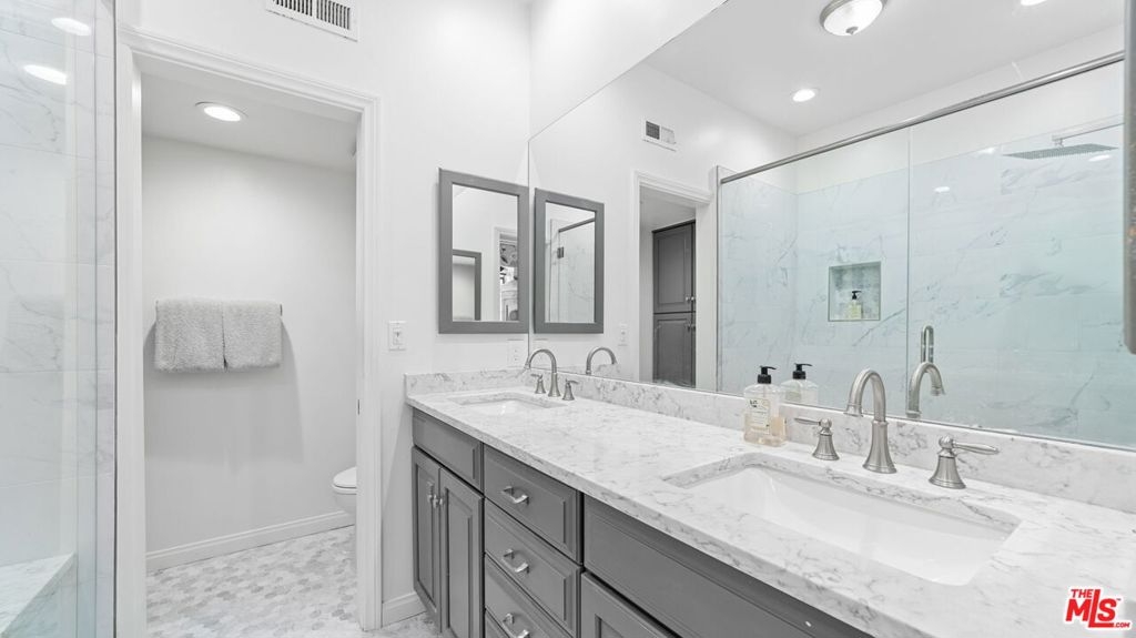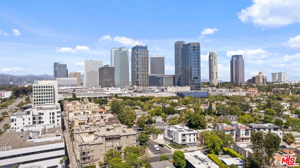 Phenomenal Century City Adjacent front-facing corner unit PENTHOUSE 2 bed/3 bath + Office + Loft/Guest Room in one of the most desired neighborhoods within a few blocks of Westfield Century City Mall. Designer finished and beautiful updates throughout. Open floor plan with double-story ceiling in living room with decorative fireplace and dining room, and beautiful large windows overlooking mature trees and greenery and french doors opening to spacious balcony. Newly remodeled open kitchen with contemporary finishes including Quartz countertops with breakfast bar, stainless steel appliances including 5 burner gas range/oven, newer cabinetry with pull-out drawers, glass-tiled backsplash and walk-in pantry. Office with wall of built-in bookshelves and large picture window overlooking greenery. 2 bedrooms including spacious primary suite with 2 windows, large custom-built walk-in closet and newly remodeled luxurious primary bathroom with dual basins, marble finishes throughout including glass-enclosed shower. 2nd bedroom with large closet and crown molding. Updated full bath in hallway with skylight. Additional loft space upstairs with built-ins and updated full bath, ideal for guest suite/family room. Additional features include hardwood flooring, newer central ac/heat, newer electrical, in-unit laundry area with storage, SIDE X SIDE parking with storage, extra large storage closet in unit, pets ok. Prime proximity to Century City, UCLA, Westwood Blvd. retail and restaurants. Westwood Charter School. Move-in ready!
