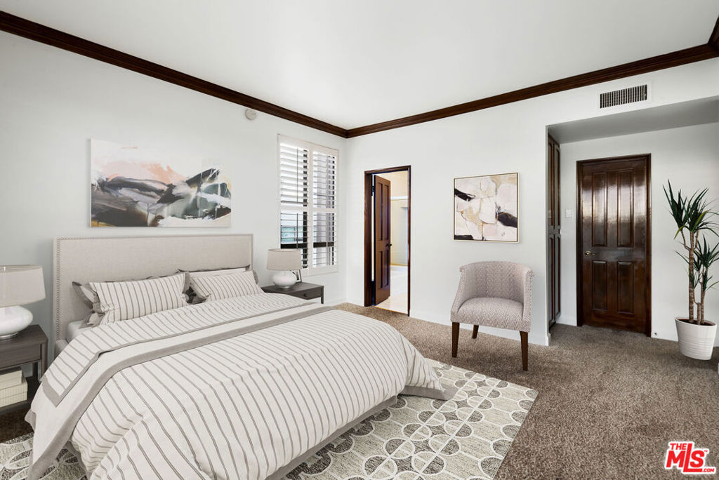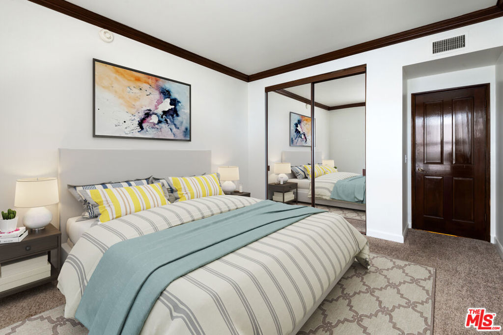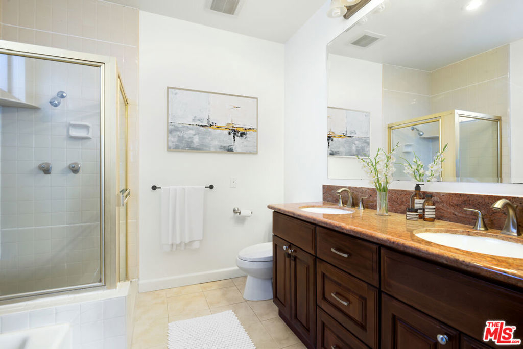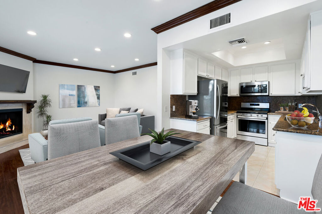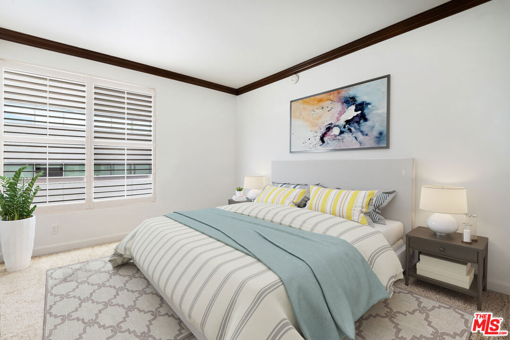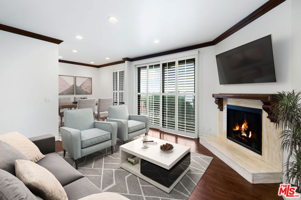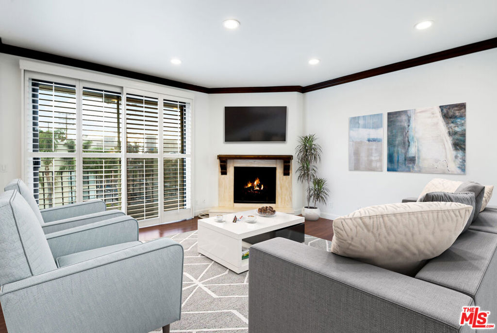 Rare TOP FLOOR, FRONT FACING, CORNER unit! Very bright and spacious with hardwood floors in living areas. Open living room and dining area with marble finished fireplace and sliding door to walk-out balcony. Renovated kitchen with granite countertops and stainless steel 5-burner gas range, microwave, refrigerator, and dishwasher. Huge master suite with walk-in closet, updated full bath, double vanities and separate bath and shower. Large 2nd bedroom with closet organizers already installed. In-unit laundry room with full-sized washer and dryer. Crown moldings, recessed lighting, and expensive Plantation Shutters add to the luxurious feel of the unit. New flooring and fresh paint adds the "finished" look of the unit. 2 tandem parking spaces in a secure garage with additional street parking in front of building. All appliances are new or recently purchased, including refrigerator, washer, dryer and brand new central heating and air conditioning system. Great Central Location: Minutes to 10 and 405 freeways, Century City, Santa Monica, Beverly Hills and Brentwood. Ideal proximity to UCLA and Westwood Village and less than 15 minutes from beautiful Santa Monica beaches. Located within the coveted Westside Charter Elementary School boundaries.