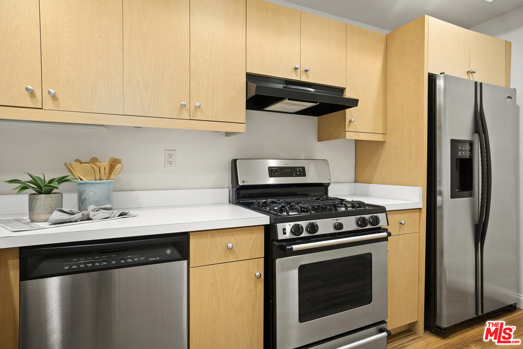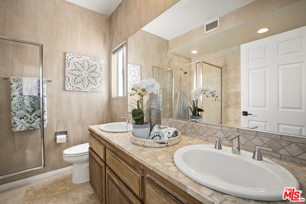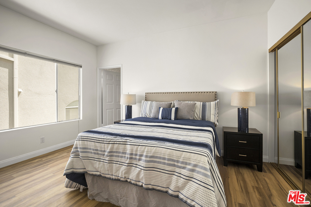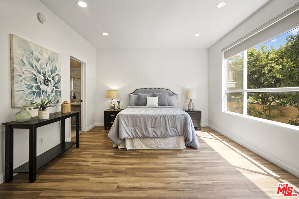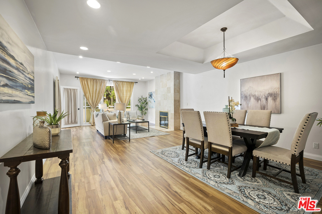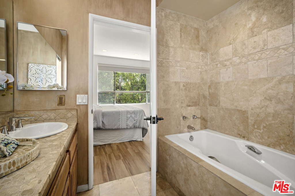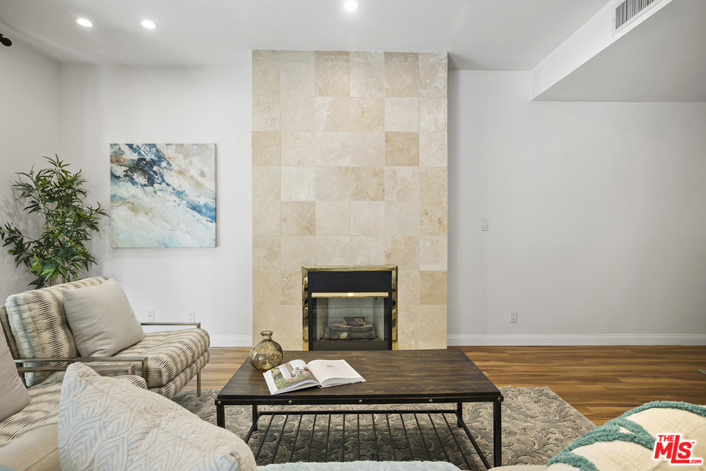Rarely available rear corner unit with beautiful greenery views. Freshly painted this completely remodeled 2 bedroom 2.5 bath unit offers custom cabinetry and hard surface flooring throughout, recessed lighting, full size stacking washer/dryer in unit, stainless steel appliances and gas fireplace in living room. Double pane sliding glass doors lead to the tiled floor patio. The master suite has leaded glass French doors and a massive walk-in closet that could easily be used as a home office. Both bedrooms have ensuite bathrooms; the master bath has a separate soaking tub, double sink, and stone countertop. This 21 unit pet friendly building had a facade update completed earlier this year. The low HOA dues include earthquake insurance, DirectTV, high speed internet and camera security system. There are two convenient ground level parking spaces and large storage cabinet in the gated garage. The 405 & 10 freeways, Century City, Google campus, Westwood Village, UCLA & Beverly Hills are mere minutes away.