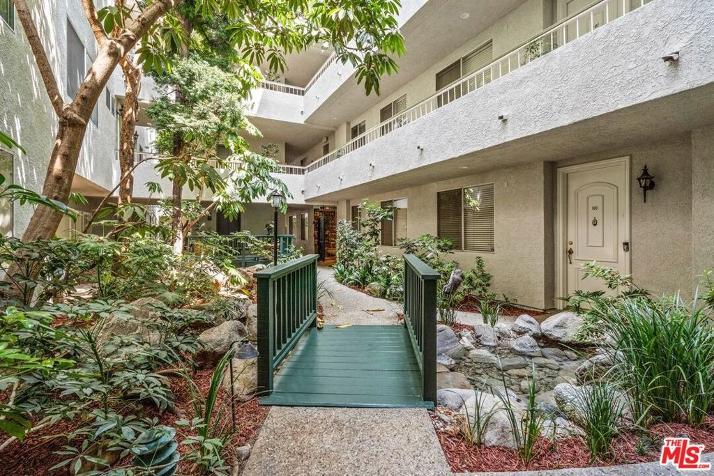 Sensational Opportunity! Priced for Multiple Interest! Extensively updated and modernized single level condo in tranquil, verdant courtyard complex, in prime Westwood location. Rear corner unit with only one common wall and beautiful arbor-esque outlooks. The home features good natural light, high ceilings, crown moldings, new paint, new carpet, new recessed lighting in the kitchen and in the public rooms. The living and dining areas feature fireplace, contemporary lighting and open onto a lovely, oversized balcony. The kitchen features stainless-steel appliances, gas cooktop, double oven, and good counter, cupboard & workspace. Pleasing verdant outlooks, breakfast nook and laundry closet complete the kitchen area. The bedrooms are bright and voluminous with high ceilings, crown moldings and Venetian blinds. The master features a HUGE walk-in closet and lovely bath with new paint and hardware. Kelton Place is a one-of-a-kind complex with a very Zen, open, center-courtyard design; complete with lush landscaping and running stream. The complex also features a sunny pool, spa, gym, sauna, rec room and security cameras. Superbly located close to everything that Westwood has to offer.
