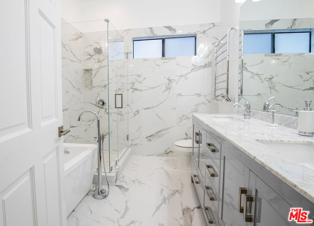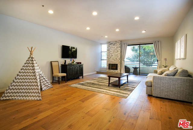 Brand newly renovated 2BR / 2BA, 1st floor unit (two units per floor) with multiple private entries. Open floor plan with 7" wide European white oak floors, high ceilings (18 feet in master bedroom suite), recessed LED lighting, brand new kitchen with quartz countertops, Whirlpool s/s appliances and white shaker style cabinets with soft close hinges, two brand new baths including Carrera Stone Master bath featuring Starphire Ultra-Clear Glass shower, stand-alone Ove tub, double vanity and Moen polished chrome fixtures. Solid wood doors with brushed nickel hardware, Alaska Gray Stacked Stone wood burning fireplace, 2 balconies with black slate including cabana drapes and private rear patio off master bedroom, brand new all wood blinds, updated security and fire suppression systems. Located on a quiet street moments away from UCLA, Holmby Hills, Beverly Hills, Century City and Westwood Village as well as within the Westwood Charter Elementary school district. Zillow Walking Score: 87