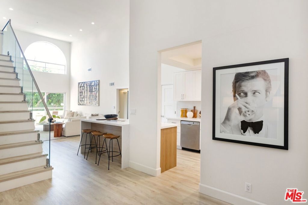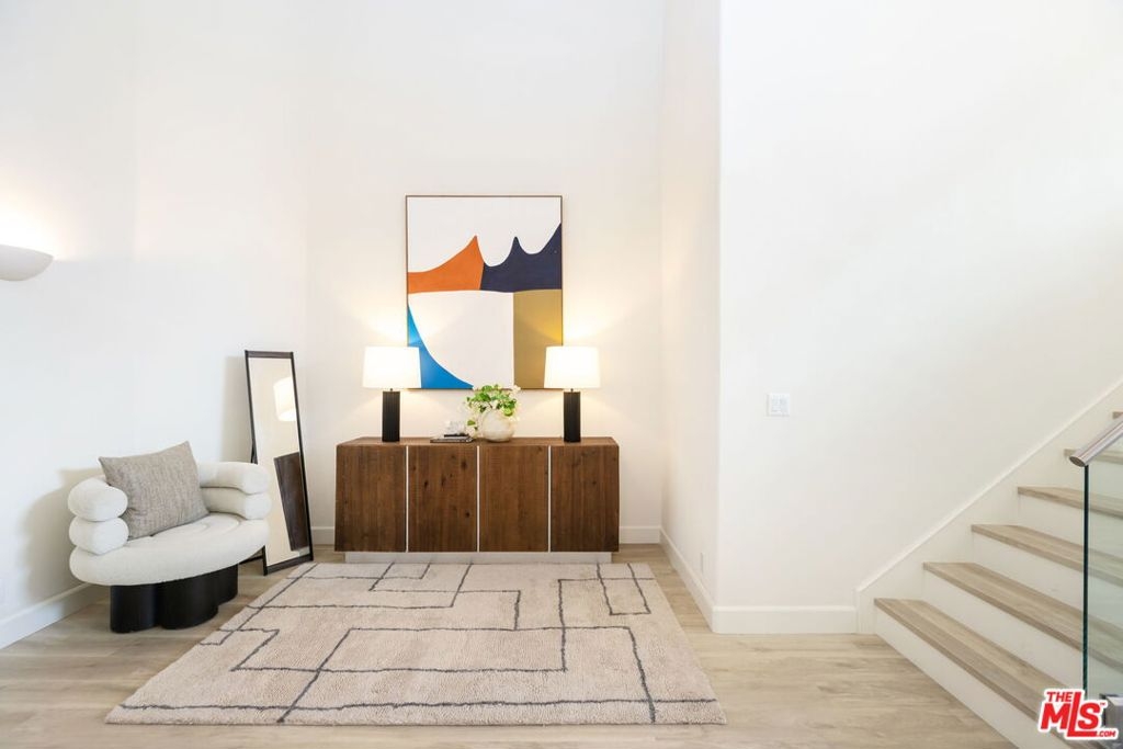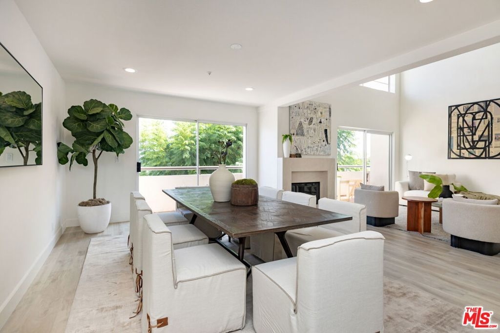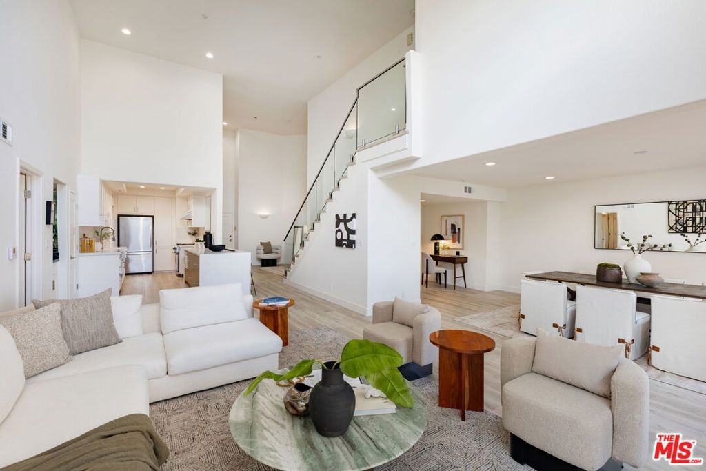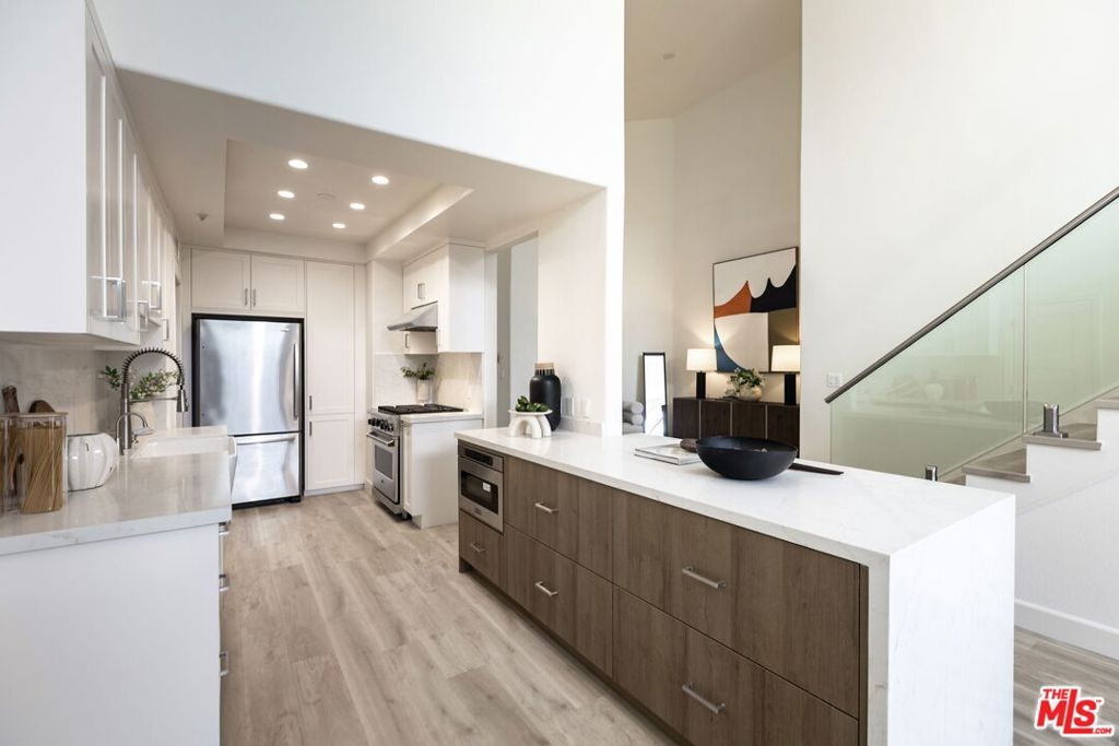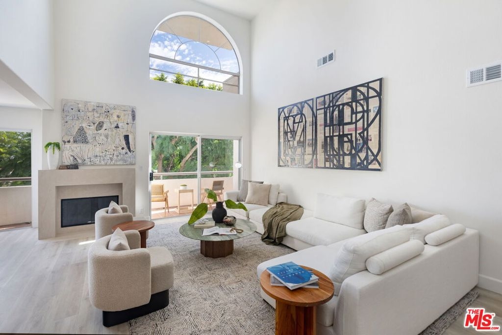 Sophisticated Two-Story Penthouse with Soaring 18-Foot Ceilings and Rooftop PatioExperience luxury living in this remodeled 2-bedroom, 3-bath penthouse with dramatic 20-foot ceilings, full southern exposure, and abundant natural light. The open floor plan features a formal entry, wood-burning fireplace, dining area with balcony, and a versatile flex space that can easily serve as a home office, den, or be converted into a 3rd bedroom. A beautifully finished guest bath with quartz and designer tile completes the main level.The chef's kitchen boasts a waterfall-edge quartz island, Viking range/oven, Bosch dishwasher, stainless steel appliances, custom pantry, wet bar, and full laundry room with built-in cabinetry. The main-level primary suite includes two closets, balcony access, and a spa-inspired bath with dual vanities, soaking tub, and separate glass shower. Upstairs, a contemporary glass staircase leads to the secondary bedroom with en-suite bath and access to a private rooftop patio with sweeping city and treetop views.Additional highlights: three private balconies, new flooring, new interior doors and hardware, two secured tandem parking spaces, and building amenities including an indoor pool, rooftop spa, and earthquake insurance included in HOA dues. Located in the highly sought-after Westwood Charter School district, near Century City, UCLA, Westfield Mall, and major freeways.