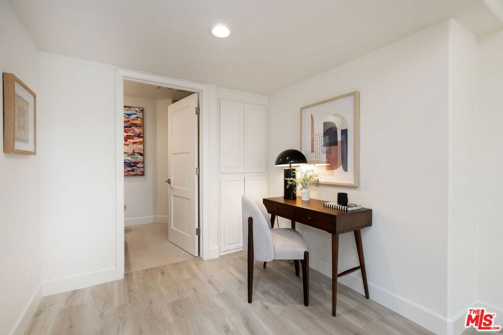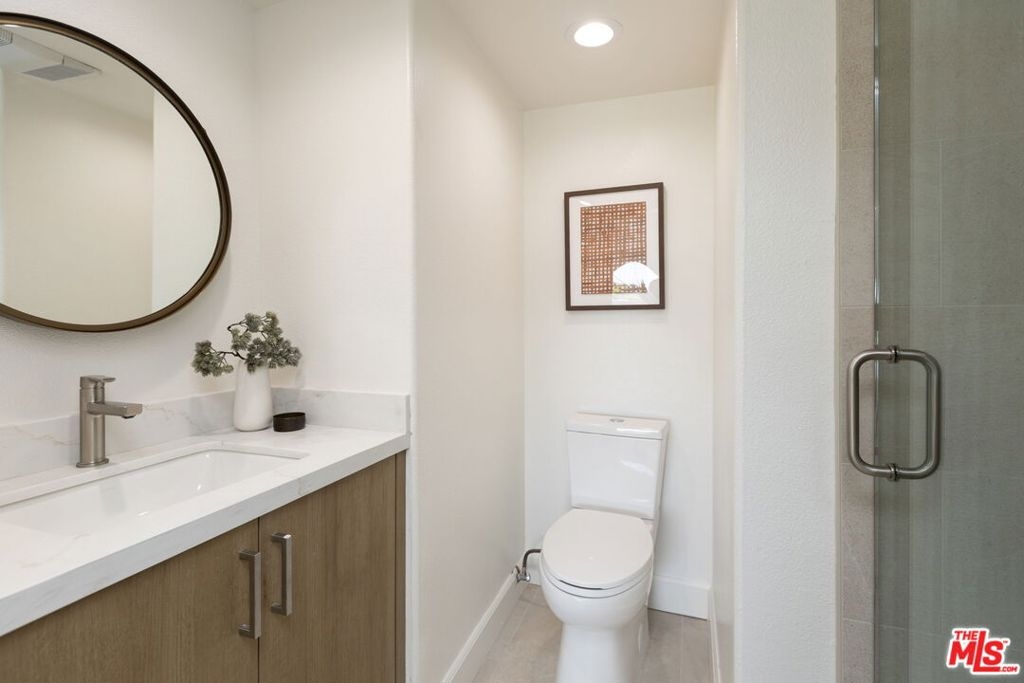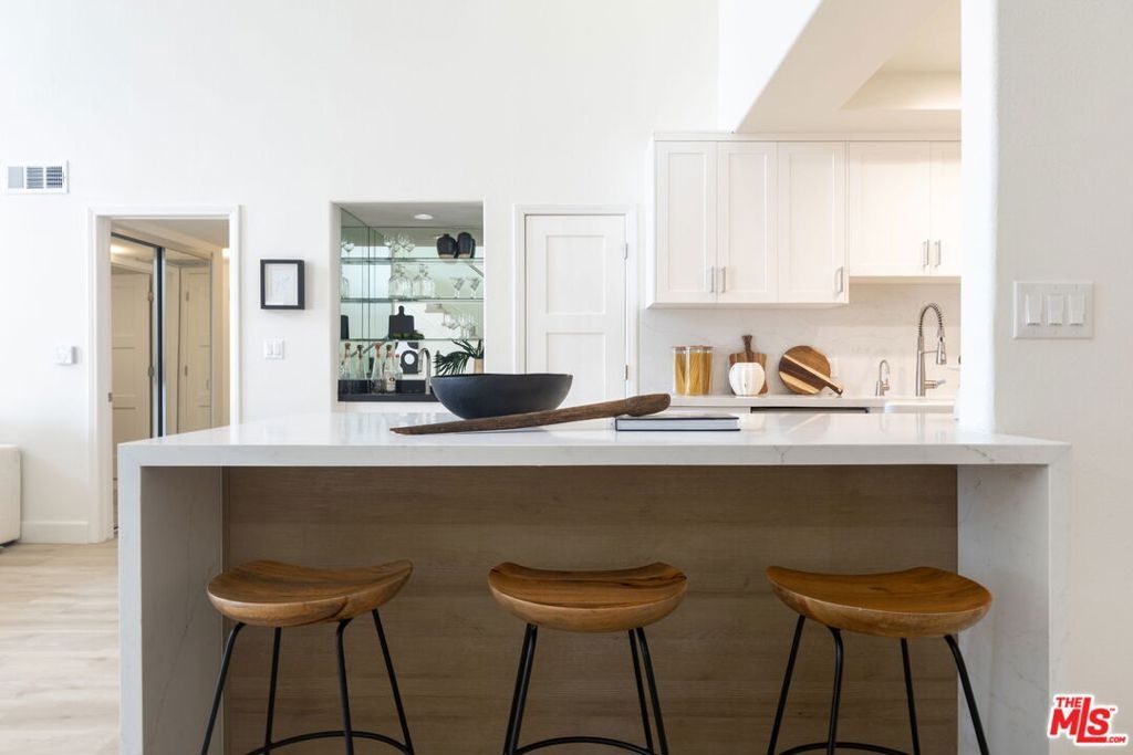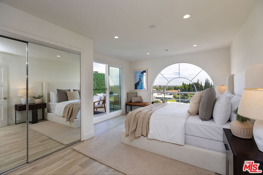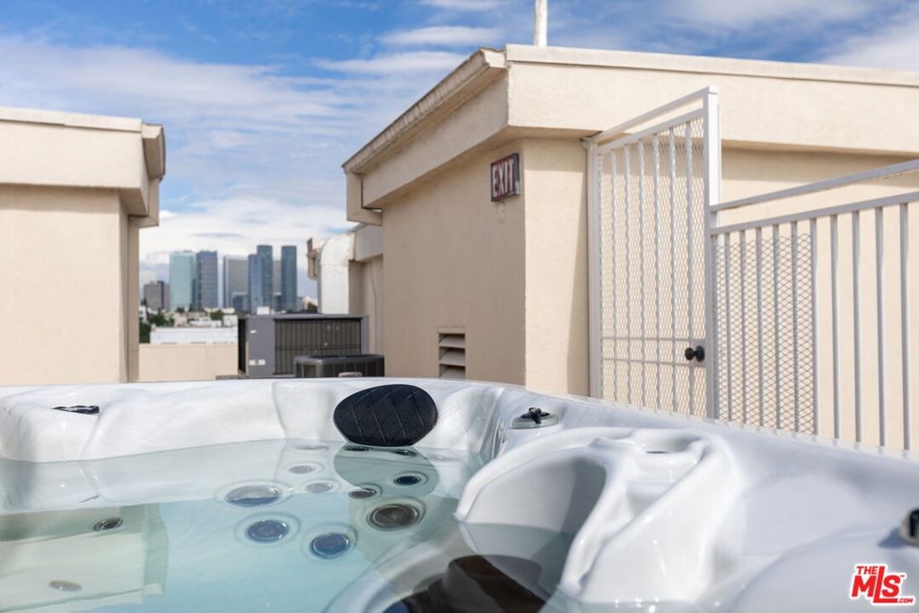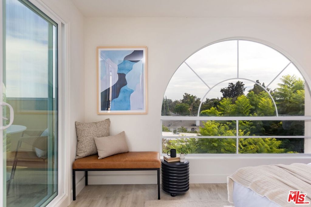 Sophisticated Two-Story Penthouse with Soaring 18-Foot Ceilings and Rooftop PatioExperience luxury living in this remodeled 2-bedroom, 3-bath penthouse with dramatic 20-foot ceilings, full southern exposure, and abundant natural light. The open floor plan features a formal entry, wood-burning fireplace, dining area with balcony, and a versatile flex space that can easily serve as a home office, den, or be converted into a 3rd bedroom. A beautifully finished guest bath with quartz and designer tile completes the main level.The chef's kitchen boasts a waterfall-edge quartz island, Viking range/oven, Bosch dishwasher, stainless steel appliances, custom pantry, wet bar, and full laundry room with built-in cabinetry. The main-level primary suite includes two closets, balcony access, and a spa-inspired bath with dual vanities, soaking tub, and separate glass shower. Upstairs, a contemporary glass staircase leads to the secondary bedroom with en-suite bath and access to a private rooftop patio with sweeping city and treetop views.Additional highlights: three private balconies, new flooring, new interior doors and hardware, two secured tandem parking spaces, and building amenities including an indoor pool, rooftop spa, and earthquake insurance included in HOA dues. Located in the highly sought-after Westwood Charter School district, near Century City, UCLA, Westfield Mall, and major freeways.