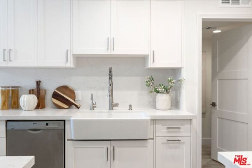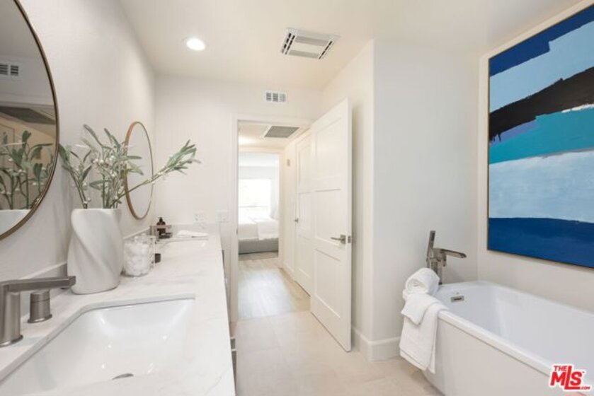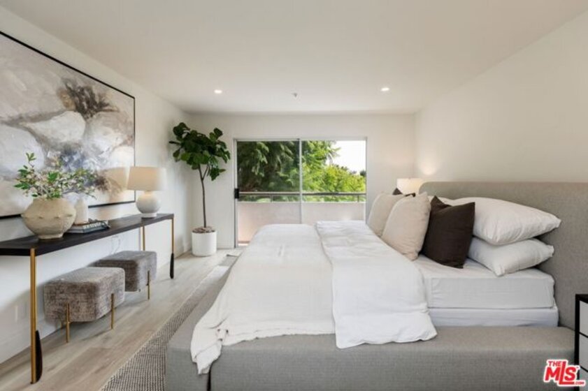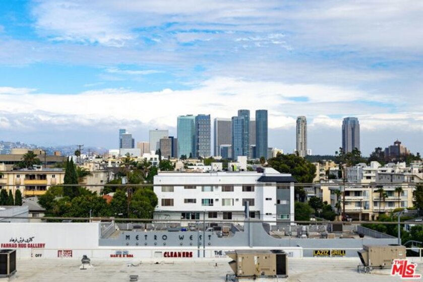 Sophisticated Two-Story Penthouse with Soaring 18-Foot Ceilings and Rooftop PatioExperience luxury living in this remodeled 2-bedroom, 3-bath penthouse with dramatic 20-foot ceilings, full southern exposure, and abundant natural light. The open floor plan features a formal entry, wood-burning fireplace, dining area with balcony, and a versatile flex space that can easily serve as a home office, den, or be converted into a 3rd bedroom. A beautifully finished guest bath with quartz and designer tile completes the main level.The chef's kitchen boasts a waterfall-edge quartz island, Viking range/oven, Bosch dishwasher, stainless steel appliances, custom pantry, wet bar, and full laundry room with built-in cabinetry. The main-level primary suite includes two closets, balcony access, and a spa-inspired bath with dual vanities, soaking tub, and separate glass shower. Upstairs, a contemporary glass staircase leads to the secondary bedroom with en-suite bath and access to a private rooftop patio with sweeping city and treetop views.Additional highlights: three private balconies, new flooring, new interior doors and hardware, two secured tandem parking spaces, and building amenities including an indoor pool, rooftop spa, and earthquake insurance included in HOA dues. Located in the highly sought-after Westwood Charter School district, near Century City, UCLA, Westfield Mall, and major freeways.