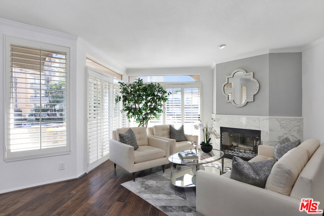 Beautiful chic designer 2 bed/2.5 ba + den 2nd-floor unit w/ updates thruout in smaller 8-unit building. Living room w/ 2 largesliding glass doors w/ step out balcony filling room with natural light, fireplace & wet bar. Dining area with soffit ceiling opens to kitchen w/granite countertops and new s/s appliances including gas range/oven. Den w/ built-ins & powder rm w/ newly installed vanity & lighting.Spacious 2nd bedroom w/ large closet and large master suite w/ door to back balcony & master bathroom w/ dual basins & separate bath& shower. Features include dark hardwood flooring, plantation shutters in living & dining room, newly installed Central ac/heat, laundry inunit,newly painted interior, newer lighting fixtures & newer carpet in bedrooms. Pets ok, 2-secured tandem parking & EQ insurance included.Close proximity to Westwood Charter School, Westwood Blvd retail, coffee shops & restaurants, UCLA, Westfield Century City Mall & thefuture Google Campus. Move-in ready!