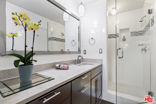 Beautifully updated designer chic front-facing end unit in prime Westwood neighborhood. Open floor plan with spacious living room opens to front balcony with sliding door, gas fireplace & bonus work space area/storage w/ built-in desks & dining room w/ large window. Totally remodeled kitchen with quartz countertops w/ under cabinet lighting, glass-tile backsplash & stainless steel appliances. Large master suite with custom built walk-in closet, 2nd closet w/ sliding door & built-ins. Stunning updated master bathroom w/ dual basins & separate bath/shower. Features include hardwood flooring throughout, central ac/heat, 2 remodeled bathrooms. Current HOA building improvements include elevator & new carpet in common areas. Pets ok, free community laundry, large extra storage closet in garage & secured 2 SIDExSIDE parking. Low $385/mo HOA dues. Ideally close to Westwood Blvd, shops, grocery, restaurants/coffee, Westwood Village theaters, UCLA & Westfield Mall. Fairburn Elem. Move-in ready!