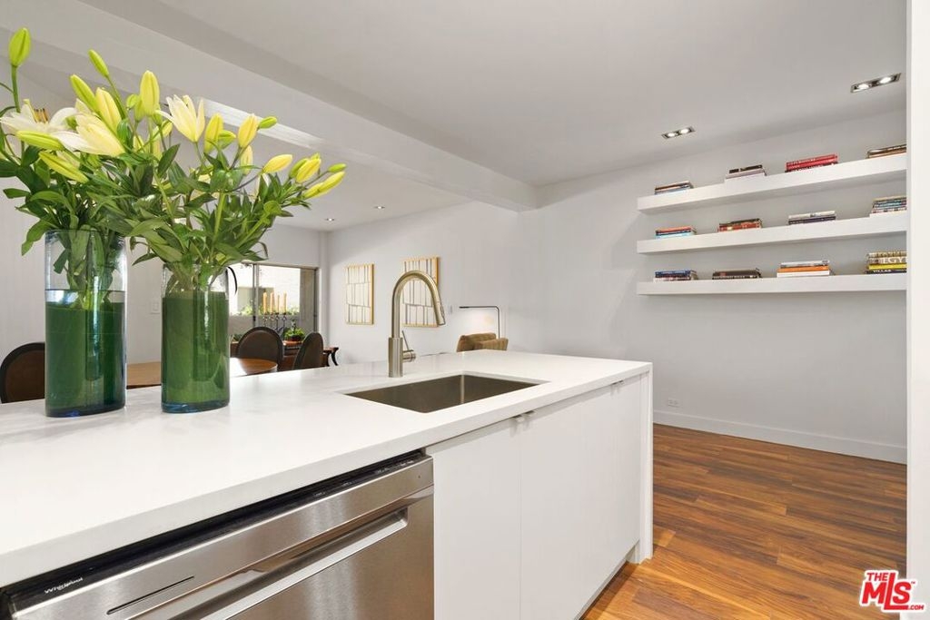 Recently renovated from top to bottom with high-end finishes, this stunning condo is a curated blend of modernism and sophisticated traditional aesthetics. The wide-open floorplan inspires casual living and spontaneous entertaining. Cook gourmet meals or share stories standing around the gorgeous open kitchen with sleek lines, glossy modern kitchen cabinets, stainless steel appliances and white quartz counters that waterfall down to the engineered hickory wood-style floors. Flow effortlessly from the kitchen to the dining area, through the living room and out to your own patio. Start your mornings sipping your favorite cappuccino among the tranquil and lush courtyard setting. Luxury bathroom amenities include white Carrara marble counters, herringbone tile flooring and a roman-style tub/shower enclosure. Other features include custom closet built-ins, gallery-style recessed lighting and Lutron dimming switches. This beautiful resort-style building feels more like a boutique hotel. Quarantine or not, it's like you're on vacation every day with luxury amenities including a 24-hour security guard, an on-site manager, a fitness center with a steam room and a sauna, a conference room and a party room with a kitchen. Imagine yourself relaxing outdoors among lush landscaping, waterfalls, koi ponds and turtles or dipping into the pool and spa. Enjoy a large park conveniently located across the complex. All this and you are just moments away from UCLA, Westwood Village and the upcoming purple line subway station. EV car charging is available onsite. HOA includes utilities and EQ ins.