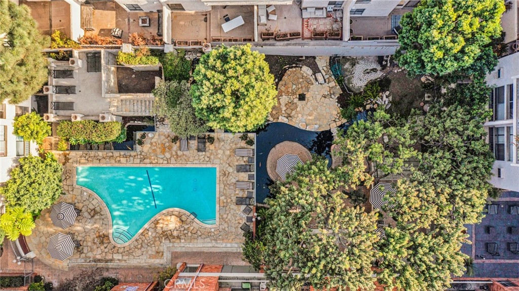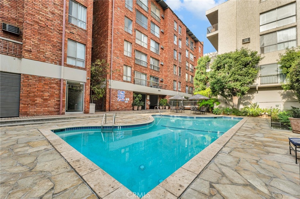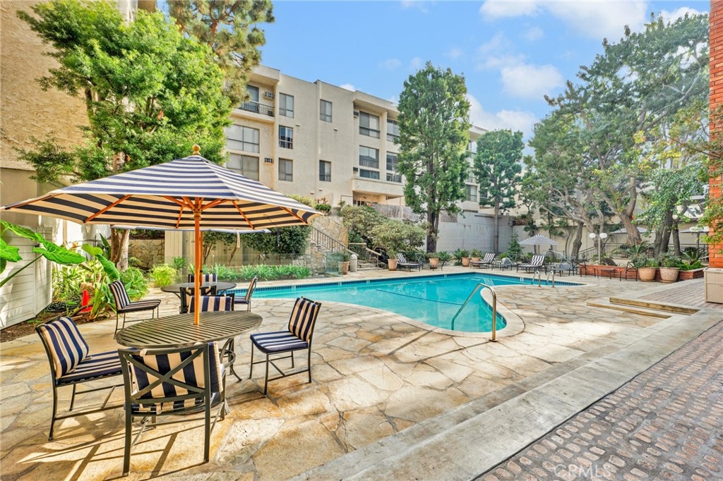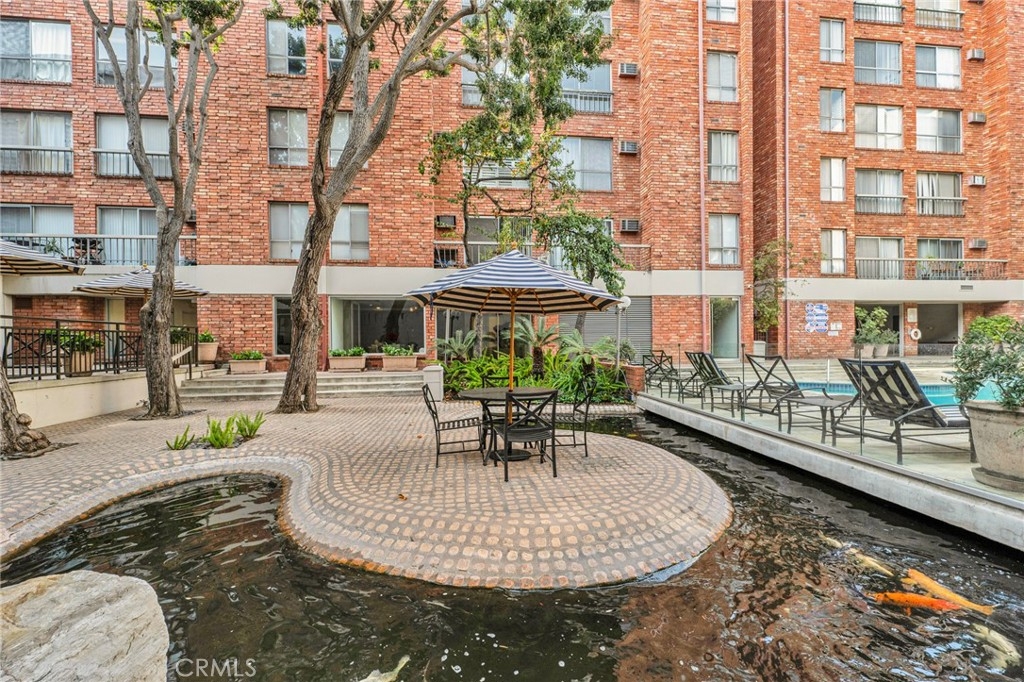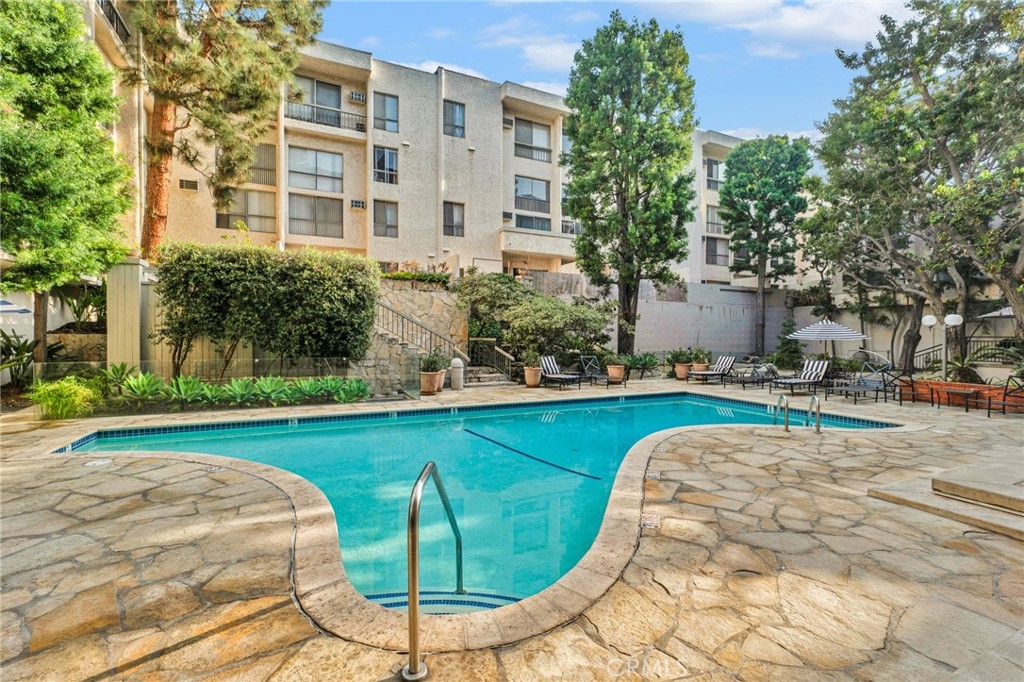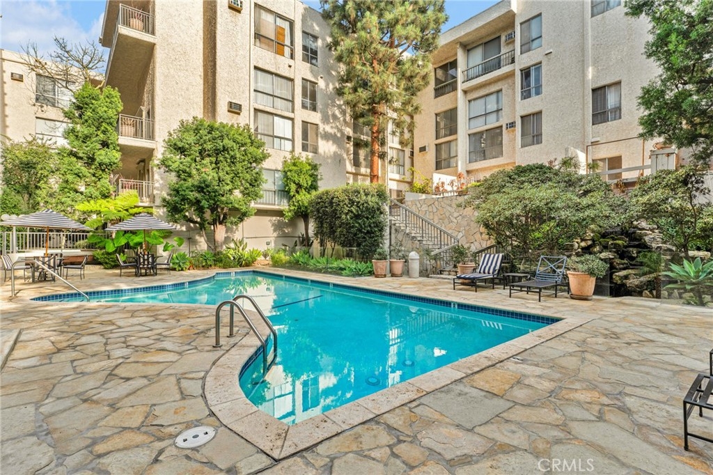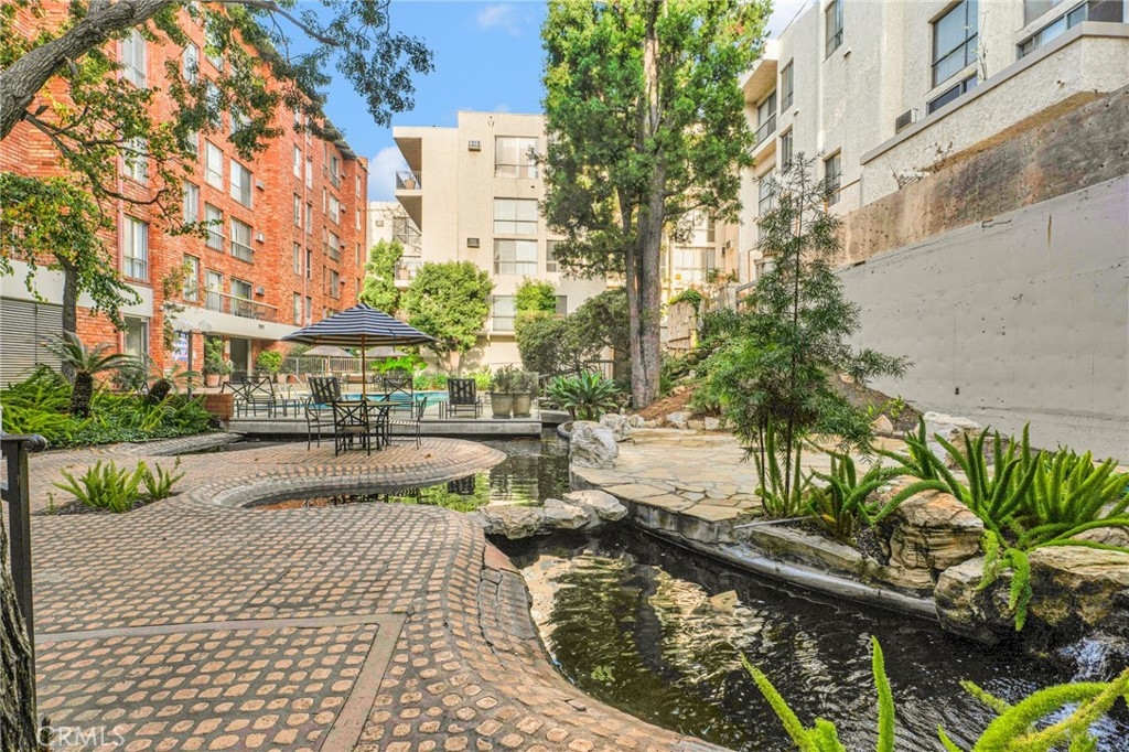 Discover this rare and exceptional 2-story featuring 2 en-suite bedrooms in a resort-style Westwood building offering an extraordinary blend of comfort and sophistication. Unique to this unit, the upper-level bedroom is fully enclosed, offering an expanded layout featuring a spacious walk-in closet with secondary closet space, and a lavish en-suite bathroom. A main level boasts another well-appointed bedroom with dual closets and its own en-suite bathroom. The kitchen has a breakfast bar and is adjacent to the dining area. A seamless flow opens to a bright and airy living room highlighted by a large floor to ceiling picture window, while a spiral staircase adds a sophisticated touch. This condo is one of the few in the building with in-unit laundry, equipped with a stackable washer and dryer. The building itself offers 24-hour security and luxurious amenities, including a full gym with Peloton and Precor equipment, steam room, sauna, conference room, recreation room with a kitchen, spa, and an inviting inground pool surrounded by lush tropical landscaping, a meandering koi pond with turtles, and a cascading rock waterfall. Dues cover electricity, trash, water, earthquake insurance, and one garage parking space. Situated across from Westwood Park with sports courts, walking paths, and a dog park, this prime location is minutes from UCLA, Westwood Village, and the 405 freeway, combining a refined lifestyle and convenience in the heart of the city.