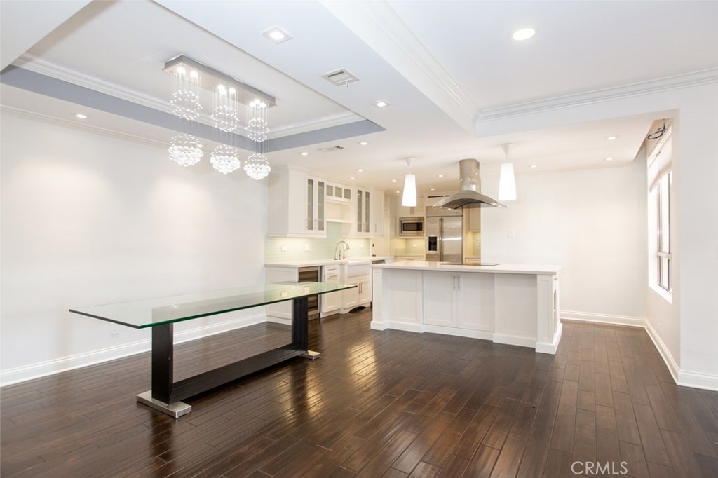 Beautifully redone 2+2 prime Westwood Condo. This spacious unit boasts & open floor plan, lots of natural light high ceilings & designer touches throughout. Double door entry invites you through the foyer to large open floor plan & treetop views from almost every room. The formal dining room & Living room are illuminated by inlaid ceiling lighting, elegant chandelier & recessed lighting to accent the crown molding, recessed ceiling, fireplace & dark wood floors. Kitchen offers large center island, stainless steel appliances, touch technology faucet, wine refrigerator, tiled back splash, granite counter tops and service entrance. Nice size 2nd BR w/both hall entry closet & walk in closet. The over-sized master suite features large walk-in closet, spa like master bath with beautiful tiled back splash glass shower and luxurious separate spa tub. Gated, side-by-side parking. Amenities include paid water, pool, sauna, earthquake insurance.
