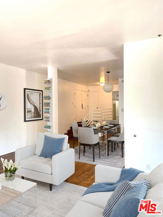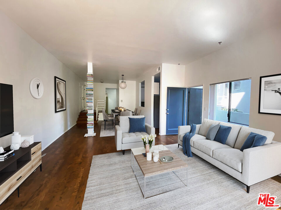 Beautiful light & bright 2bd/2ba front corner unit is move-in ready! With nearly 10ft high ceilings, the open floor concept is an impressive space within this intimate 12 unit architectural building in prime Westwood. This unit feels like a home with lovely hardwood floors, a fireplace, great entertaining flow, and no shared walls. The kitchen is open to the living and dining spaces and is complete with stainless steel appliances. Two separate unit entrances are ideal to either entertain formally, with double door entry and sitting area, or the patio entry for everyday convenience. The spacious primary suite is a restful retreat with high ceilings, a deep walk-in closet, and a double sink vanity in the en suite bathroom. The second bedroom features a generously sized closet, and hardwood flooring is allowed in both bedrooms! Create your indoor/outdoor entertaining experience to gather with family and friends, or just take in the California weather on the large wrap-around patio. Other features include; sxs washer/dryer, HVAC installed 2020, 2-car parking, and a dedicated storage space. Building has EQ ins. This sought-after walkable neighborhood within the Fairburn School District, is a perfect owner user or investment property. Everyday errands and shopping are close at hand: Bristol Farms, Sprouts, UCLA, Century City, and moments away is the anticipated Google campus. Furnishings are virtually staged.