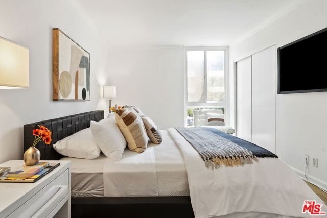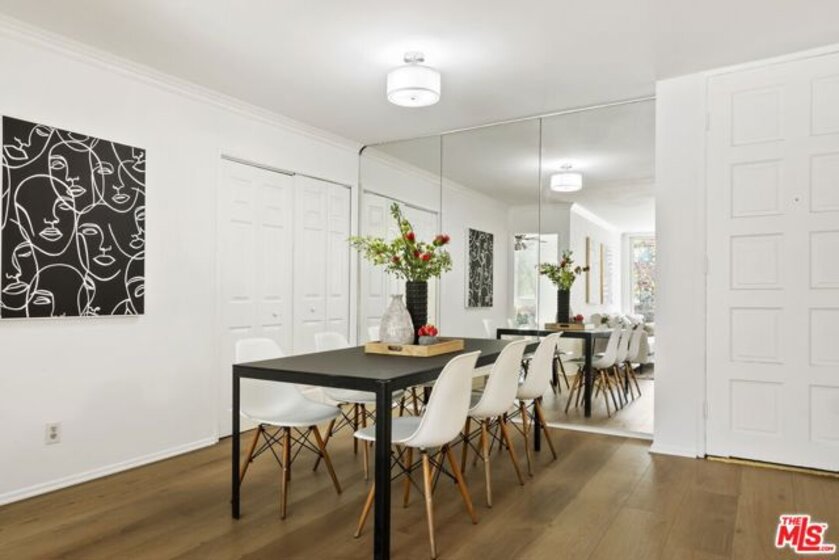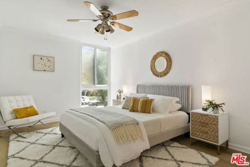 The perfect 2 bed/2 bath front facing condo with light and bright open floor plan in charming courtyard Traditional style building. Located in prime Westwood, this condo includes beautiful newly installed contemporary wood-like flooring throughout and newly painted interior. Spacious living room with crown molding, fireplace and dual pane sliding door to front-facing balcony. Dining room with mirrored wall and large closet that opens to living room and kitchen. Desired floor plan with 2 bedrooms each with ensuite bathrooms on opposite sides of unit. Both bathrooms updated with granite countertops, built-in linen cabinets and tile finishes. Pets ok, Earthquake Insurance included in HOA dues, 2 secured tandem parking spaces with storage. Building features include common area laundry room on each floor, sparkling pool, sauna and fitness room. Close proximity to UCLA, Westwood Blvd. restaurants and retail, Westfield Century City Mall, Beverly Hills and 405 & 10 freeways. Westwood Charter School. Move-in ready!