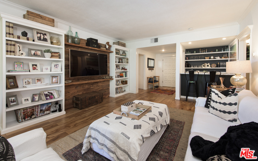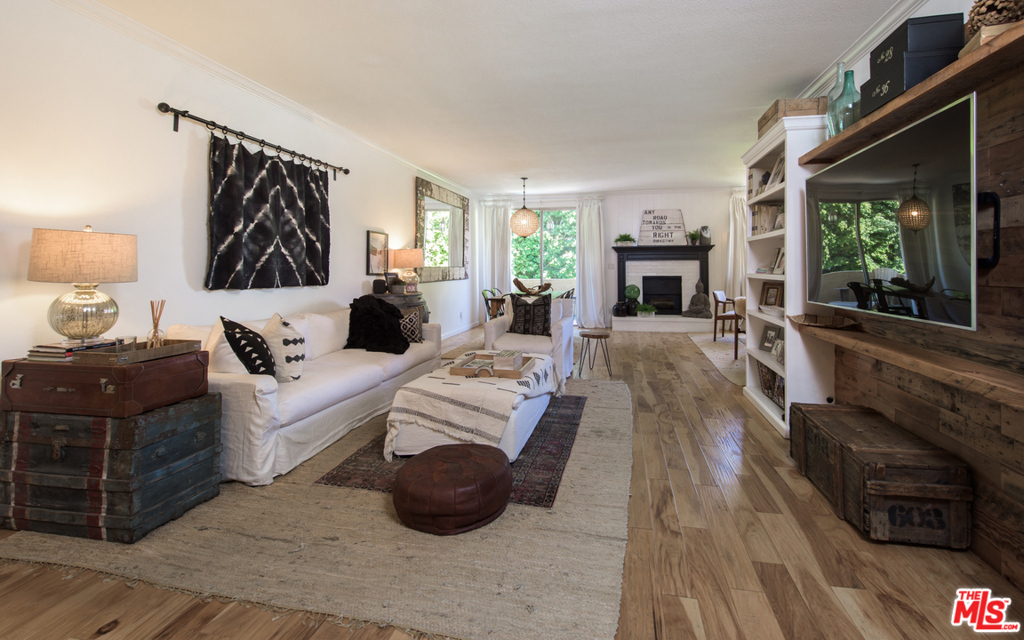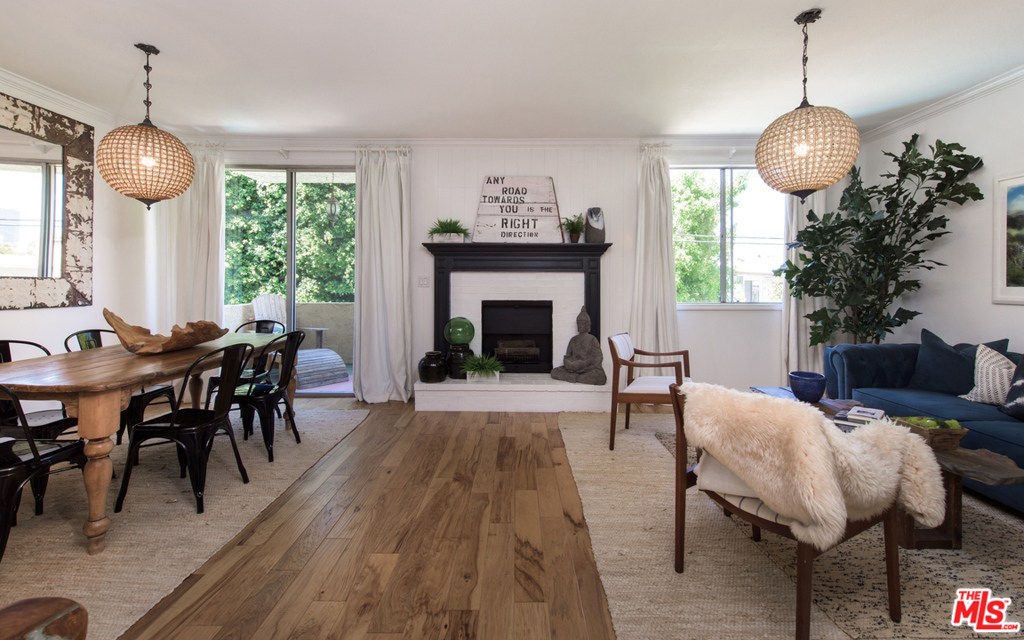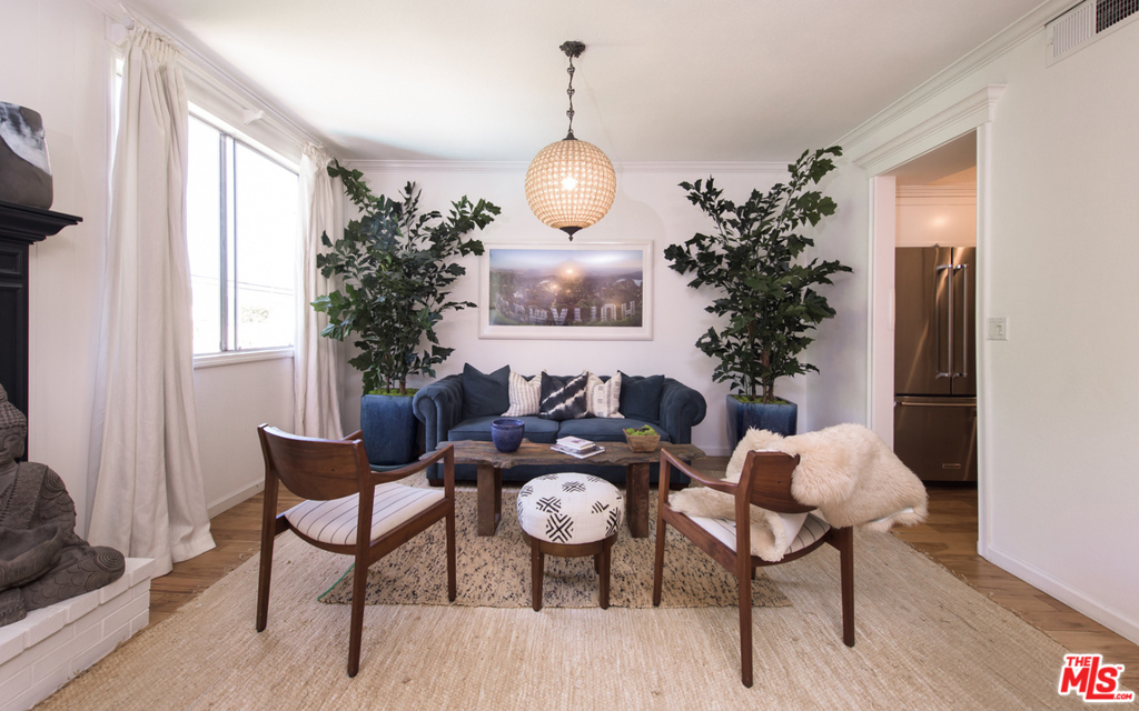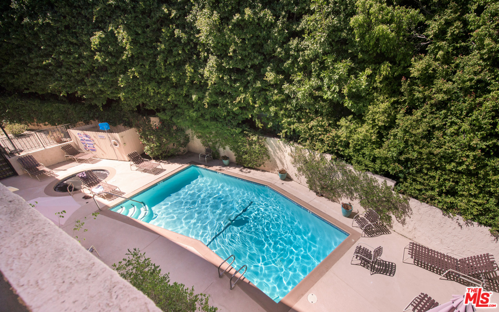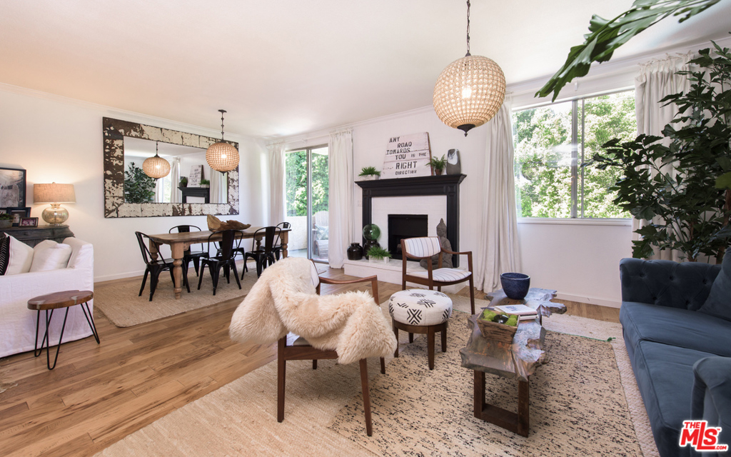 Stunning two bedroom/two bath condo done to perfection with designer finishes and details throughout. Graciously spacious with over 1,700 square feet of living space featuring hardwood floors, custom built-ins, exquisite light fixtures and exposed wood beams. The complete unit offers everything from a fireplace, wet bar, walk-in closets, vanity, dressing area, large soaking tub and side by side laundry. Beautiful lush green tree views from every window with endless amounts of natural light. Large balcony overlooks the pool. Additionally, you will find two parking spaces and garage storage. Incredible location on a quiet street with easy access to prime Westwood shopping and dining.