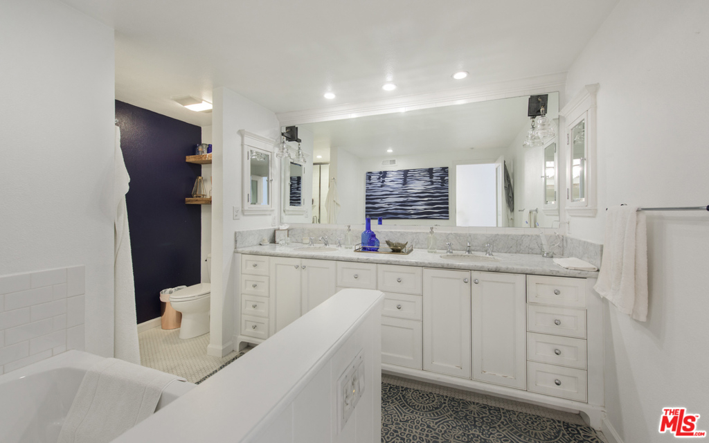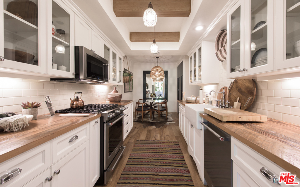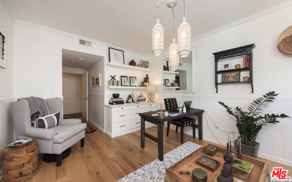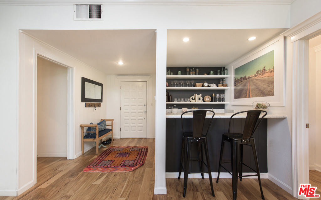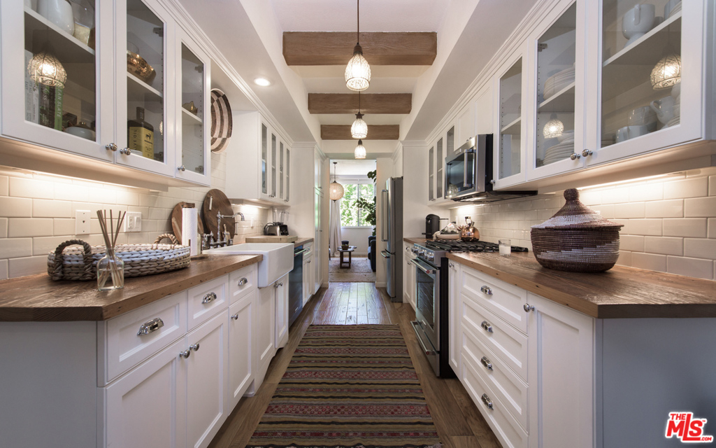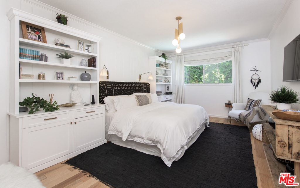 Stunning two bedroom/two bath condo done to perfection with designer finishes and details throughout. Graciously spacious with over 1,700 square feet of living space featuring hardwood floors, custom built-ins, exquisite light fixtures and exposed wood beams. The complete unit offers everything from a fireplace, wet bar, walk-in closets, vanity, dressing area, large soaking tub and side by side laundry. Beautiful lush green tree views from every window with endless amounts of natural light. Large balcony overlooks the pool. Additionally, you will find two parking spaces and garage storage. Incredible location on a quiet street with easy access to prime Westwood shopping and dining.