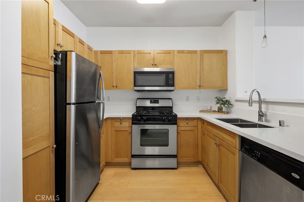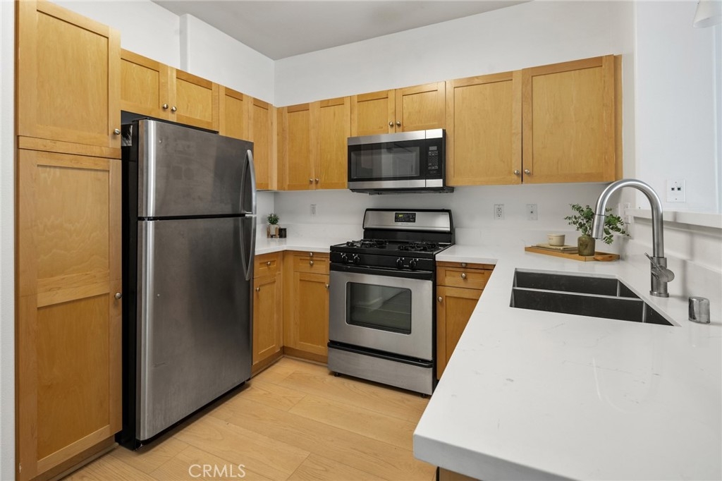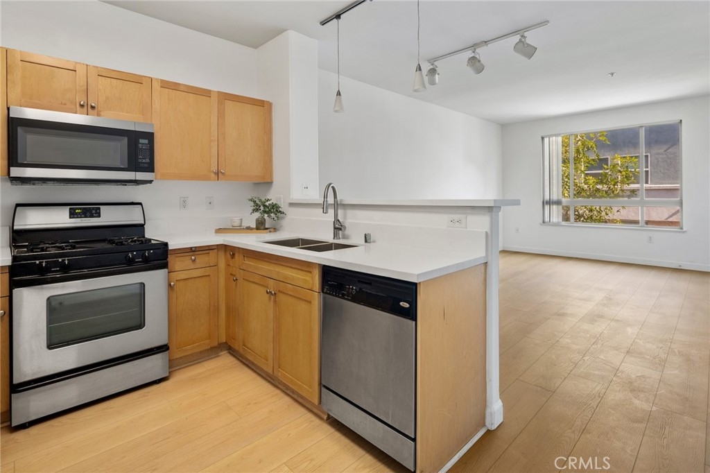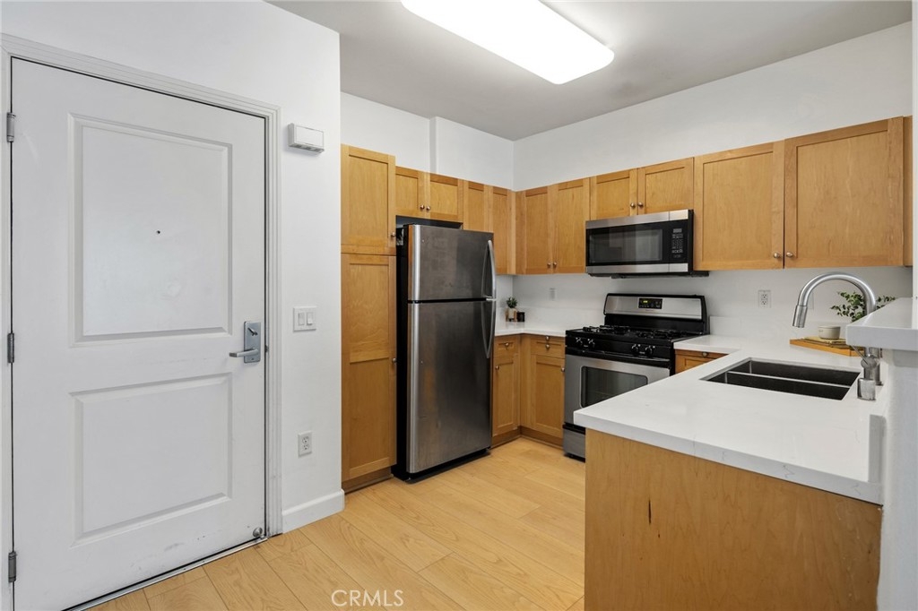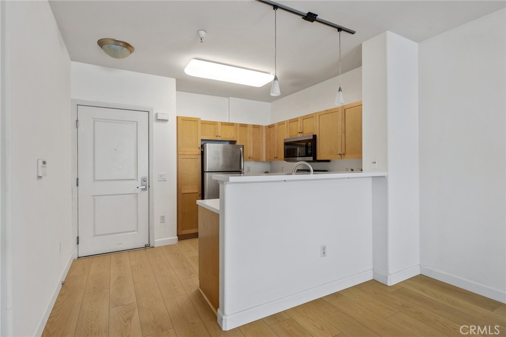 Nestled between the DTLA Arts District and Little Tokyo, this newly renovated 1-bedroom, 1-bathroom condo offers a contemporary and light-filled living space, including a private exterior balcony. This gorgeously refreshed unit features brand-new flooring throughout, custom-cut Carrera quartz countertops, new plumbing and lighting, modern fixtures and sinks, and plentiful storage space. The open-concept chef’s kitchen includes upgraded stainless steel appliances and a breakfast bar that leads into the bright and generous living room. The spacious bedroom includes a walk-in closet with built-ins. A large bathroom with upgraded washer/dryer completes the floor plan. The highly-coveted Savoy complex provides resort-style living with manicured courtyards and a plethora of amenities: take a dip in the sparkling pool, unwind in the spa, stay active in the state-of-the-art fitness center, or host meetings in the business center. The community also features a 24-hour attended lobby, guest parking, BBQ grills, a screening room, a rooftop deck with skyline views, and a sports café, all perfect for hosting and socializing. Located within walking distance from the Metro Station, a variety of restaurants, breweries, shops, and the vibrant energy of DTLA, this condo offers the perfect blend of modern comfort and convenience. Don’t miss the opportunity to make this urban oasis your new home!