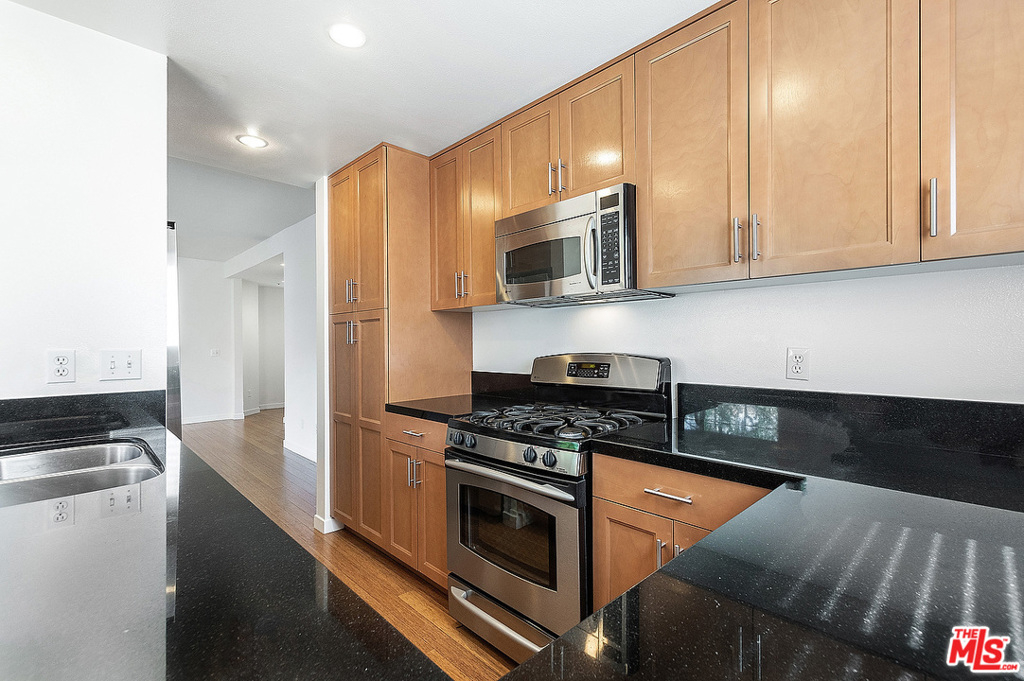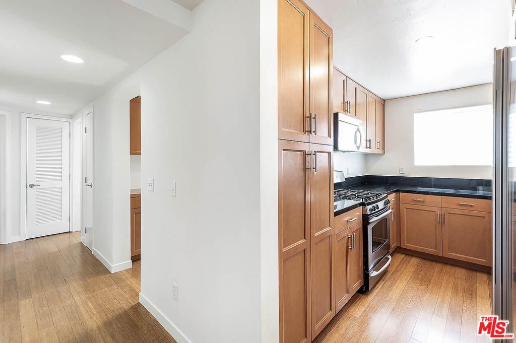 Gorgeous 2 BR & 2 BA condo on a quiet street in Westwood with 3 private balcony/patios and treetop views! Newly painted with bamboo floors! Large windows provide natural light on 4 sides of the unit! Open floorplan features living room with fireplace, dining area and beautiful granite kitchen! Loads of closets and storage. This unit has a PRIVATE SIDE ENTRANCE so you don't have to access thru lobby or elevator. Elevator only stops on this floor for this unit with a key. Security entrance and garage. Full size side-by-side laundry in the unit. Bldg has only 7 units, and has EQ insurance and a storage room and surveillance system. This is the gem you have been looking for that is ready to move-in right now! No investors, owner/users only.