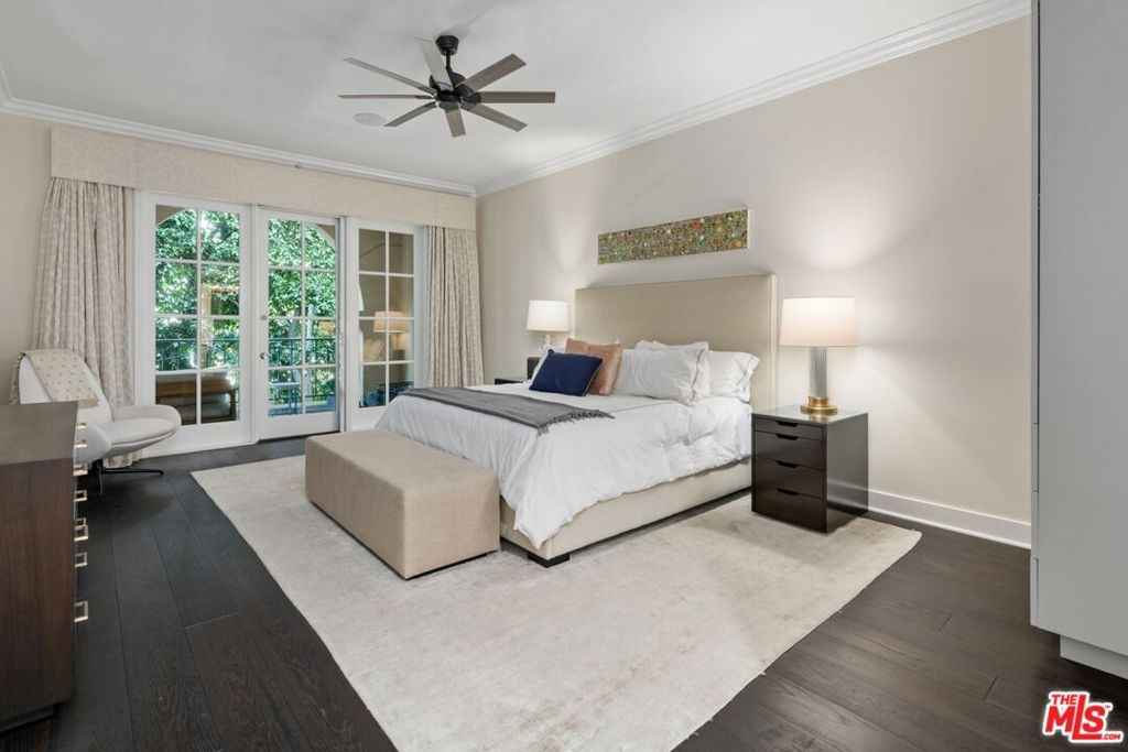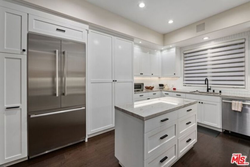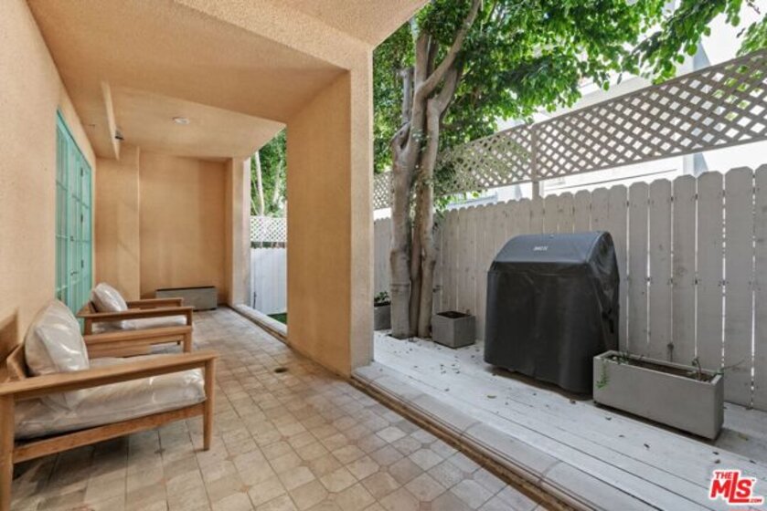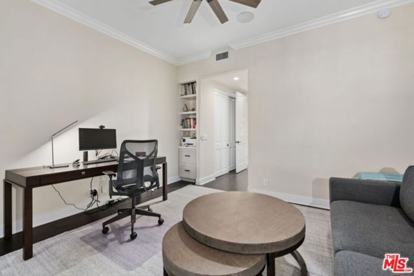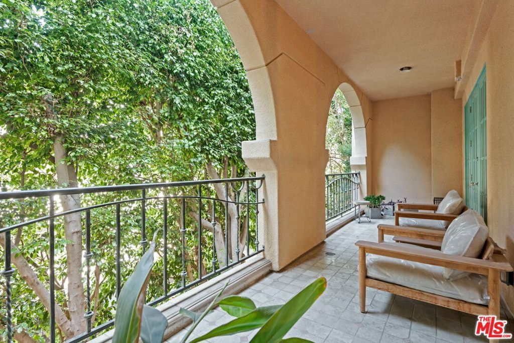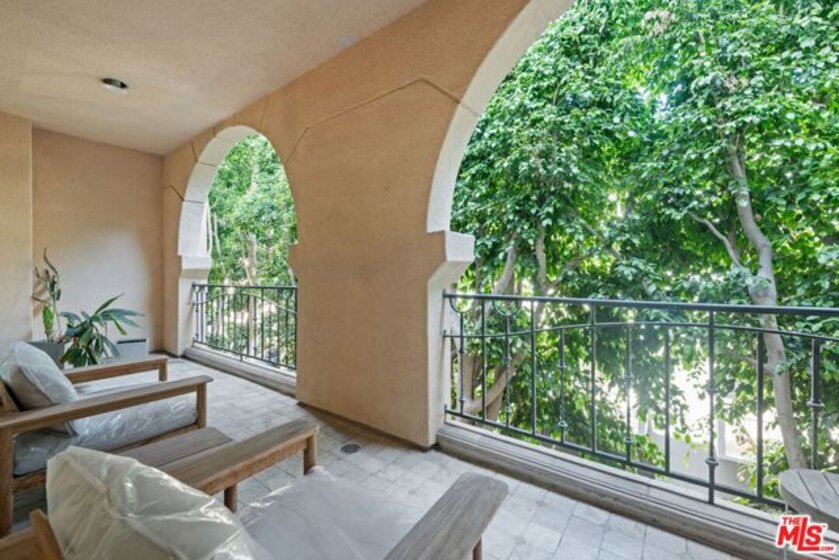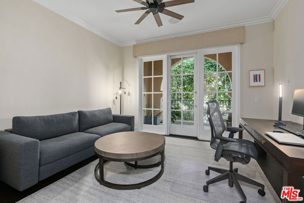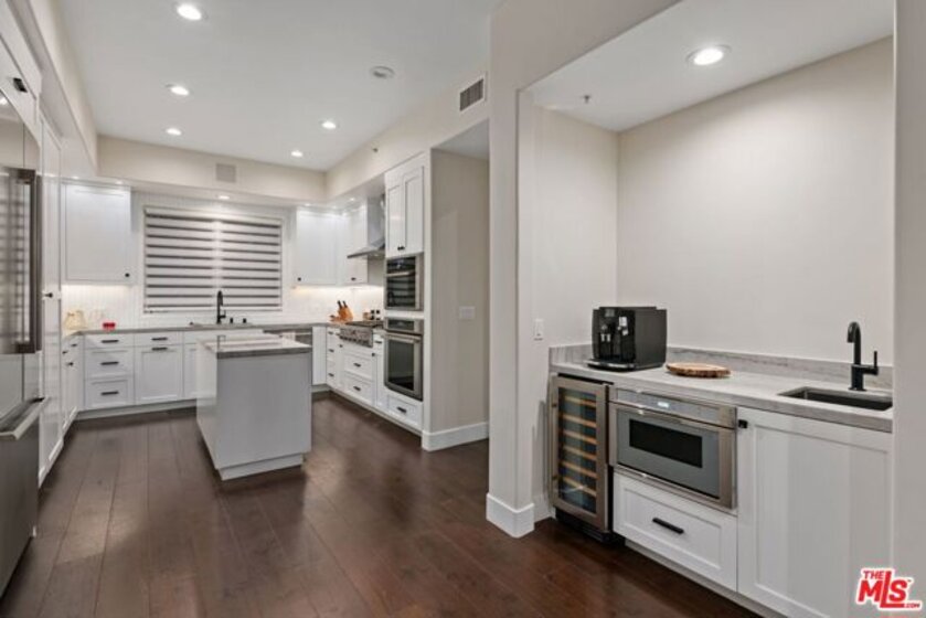 Elegant and spacious two-story residence in The Brentwood, one of the Westside's premier full-service buildings. Approx. 2,400 sqft with high ceilings, wide-plank hardwood floors, and a gracious living room with fireplace. French doors open to a private patio from both living and dining rooms. Remodeled chef's kitchen features Thermador appliances, center island, and built-in desk. Upstairs offers two ensuite bedrooms including a luxurious primary suite with dual sinks, vanity, walk-in closet, and balcony access. Upstairs laundry, side-by-side parking, and private storage. Building amenities include rooftop pool/spa with panoramic views, fitness center, concierge, valet, and on-site management. Prime Brentwood location near shops and dining.
