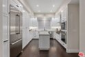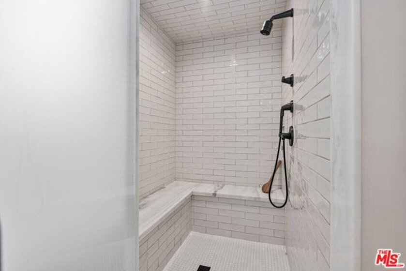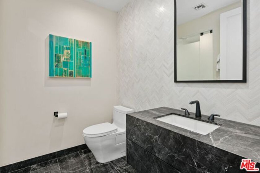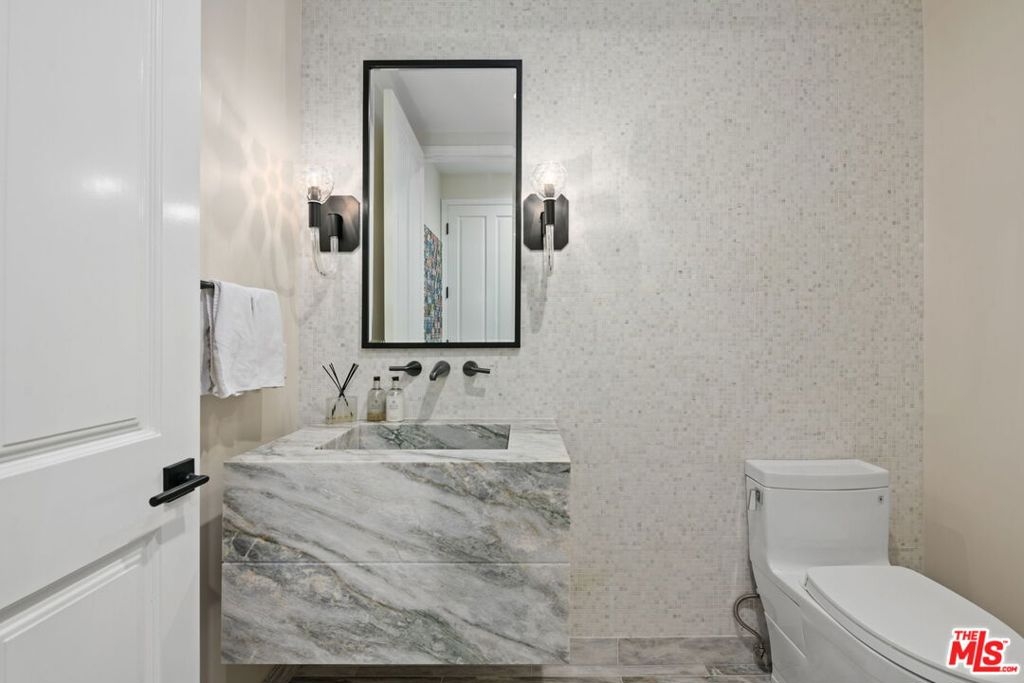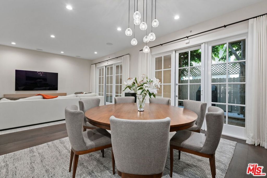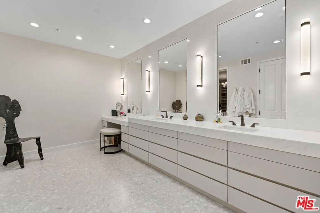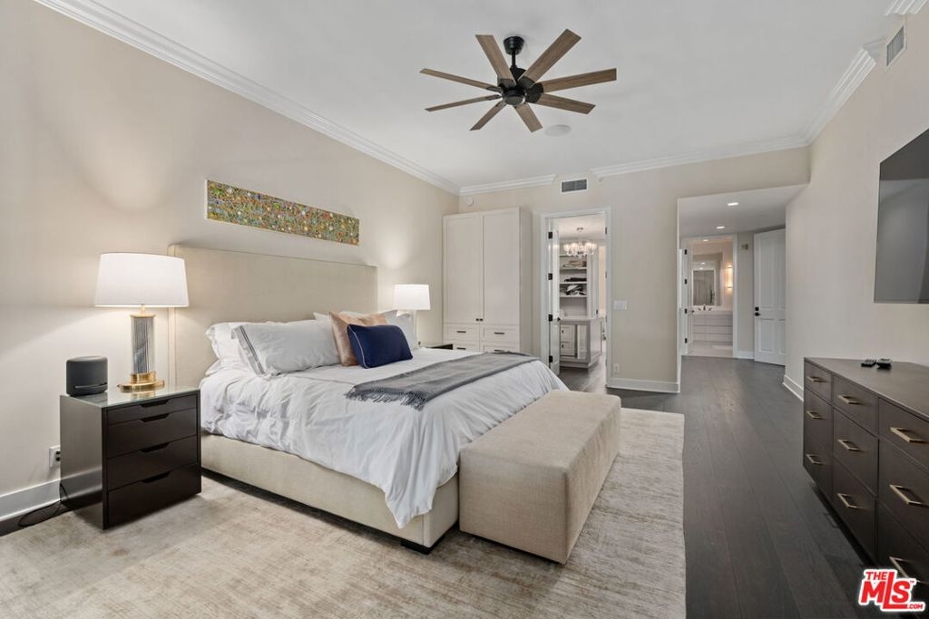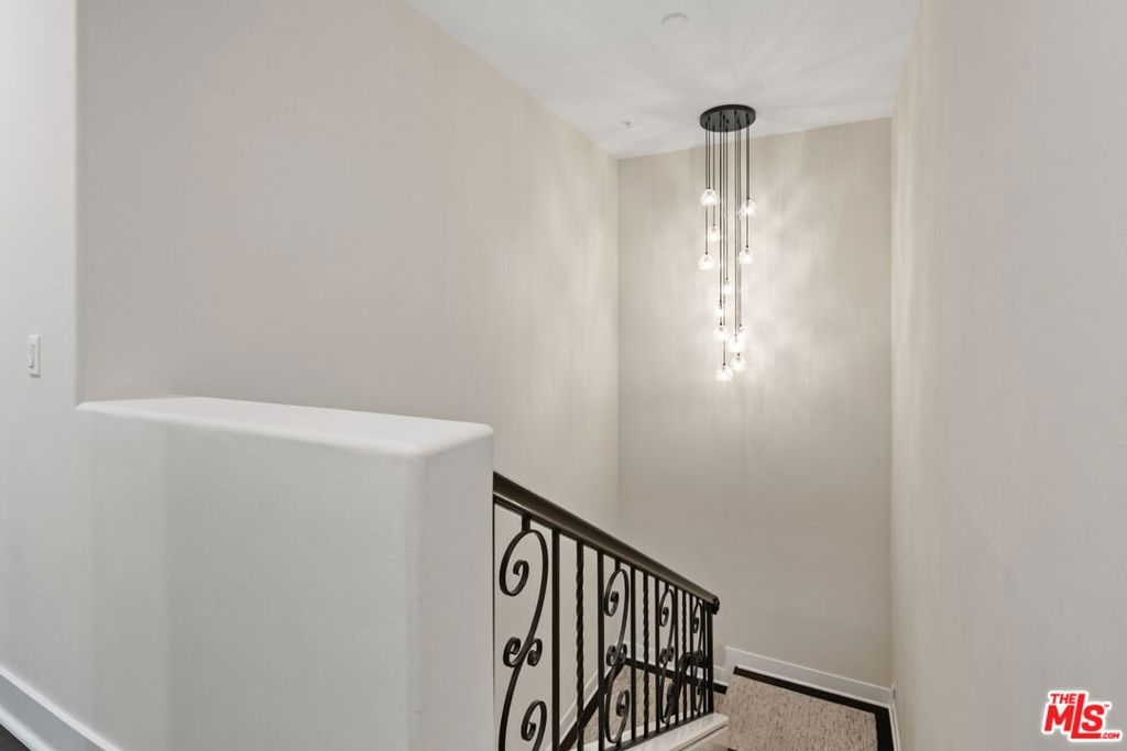 Elegant and spacious two-story residence in The Brentwood, one of the Westside's premier full-service buildings. Approx. 2,400 sqft with high ceilings, wide-plank hardwood floors, and a gracious living room with fireplace. French doors open to a private patio from both living and dining rooms. Remodeled chef's kitchen features Thermador appliances, center island, and built-in desk. Upstairs offers two ensuite bedrooms including a luxurious primary suite with dual sinks, vanity, walk-in closet, and balcony access. Upstairs laundry, side-by-side parking, and private storage. Building amenities include rooftop pool/spa with panoramic views, fitness center, concierge, valet, and on-site management. Prime Brentwood location near shops and dining.