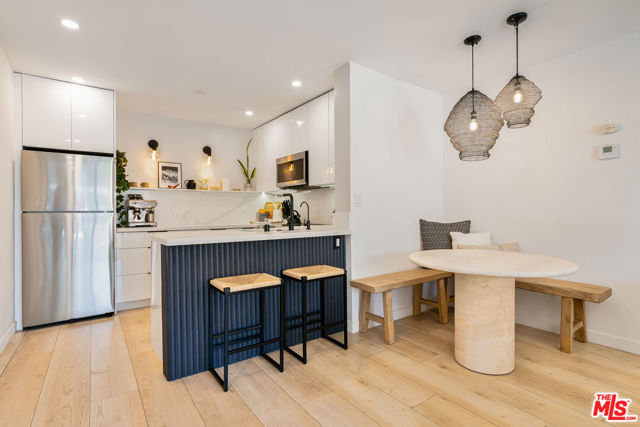 Set in one of Brentwood's most coveted neighborhoods, this top-floor condo has been beautifully remodeled for turnkey modern living. Offering 1 bedroom, 1 bathroom, and a spacious balcony, the residence was fully updated in August 2023. Inside, blonde hardwood floors, recessed lighting, and a refreshed bathroom with new tub, shower, and vanity create a polished look. The kitchen impresses with custom cabinetry, stone countertops and backsplash, and premium appliances, including a stove with air fryer setting. The expansive, turfed balcony extends the living space for outdoor dining or lounging while enjoying views of the Getty Museum. Community amenities include a heated pool and sun deck, sauna, renovated gym, secured entry, guest parking, rooftop patio with panoramic views, and convenient shared laundry. Just moments from the Brentwood Farmers Market, neighborhood cafs, and boutique shopping, this home combines modern comfort with an unbeatable location.