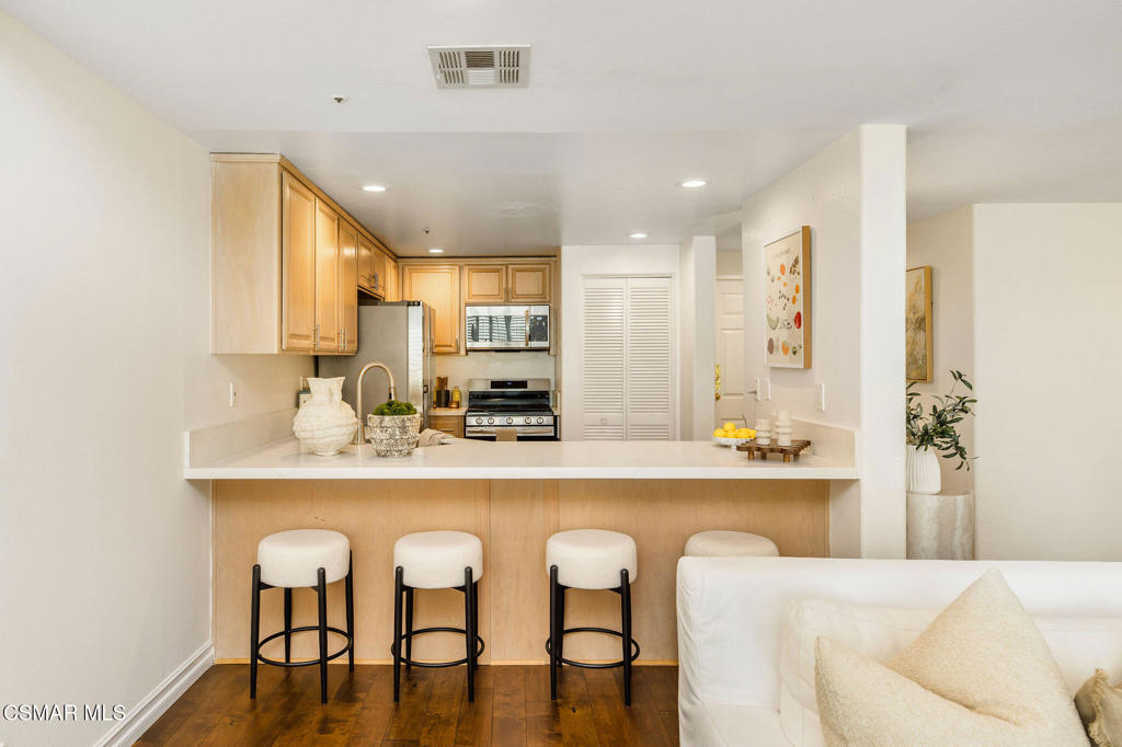 Sophisticated, private, and serene, this updated second-floor Brentwood condo offers 2 bedrooms, 2.5 baths, and 1,244 sq ft in a secure boutique building of just nine units. The open living space features engineered hardwood floors, a fireplace, a stylish dry bar, and flexible space for dining. The recently updated kitchen includes new quartz countertops, a breakfast bar, new stainless steel appliances, and abundant cabinetry.A powder room for guests, in-unit washer and dryer, and central A/C and heat provide everyday comfort and convenience. Both bedrooms are spacious with ensuite bathrooms, while the primary retreat features a fireplace, walk-in closet, and a spa-like bath with a soaking tub and separate shower.With gated, fully covered parking, thoughtful updates, and a prime Brentwood location near top restaurants, shops, grocery stores, and popular yoga, Pilates, and cycling studios, this condo is move-in ready and the perfect blend of comfort and style.