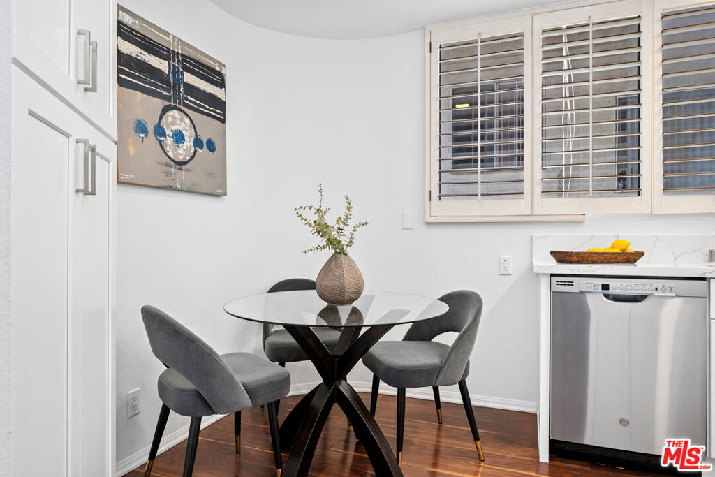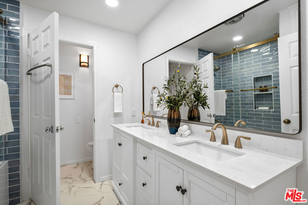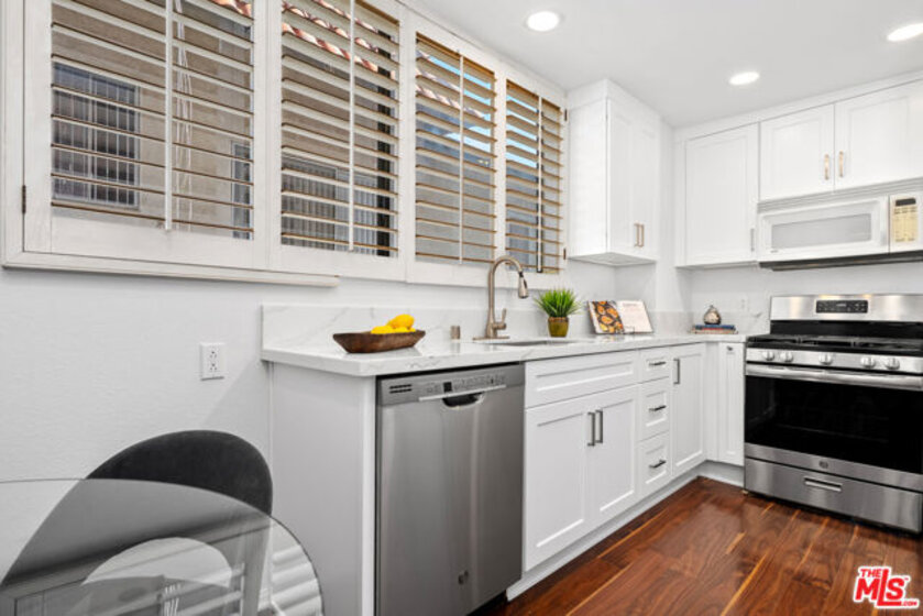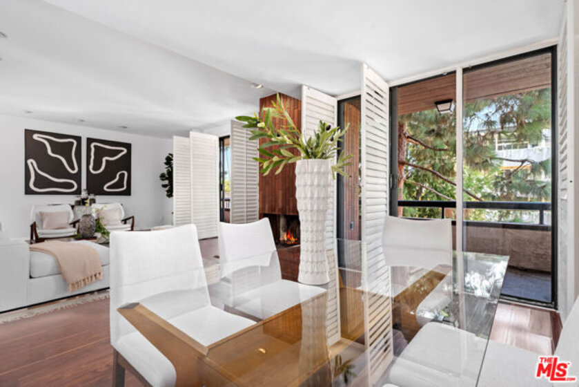 Stylish living awaits! Single level 2 bedroom + 2 bath condominium well located between Wilshire and San Vicente just East of Bundy in Brentwood. Front facing second floor unit opens to living room + dining room with gas fireplace and doors that lead to private terrace. Large living area opens to recently updated kitchen with breakfast area. Primary suite boasts a large walk-in closet and newly remodeled en-suite bathroom accented with glass tile and gleaming fixtures. Second bedroom, hallway bath and laundry closet with full size side by side W/D complete the unit's floor plan in 1,371 SqFt. Brand new HVAC and ducting completed within the last year. Outside entry into the single level unit. The 1982 building is located on a quiet tree lined block. Wood laminate flooring featured predominantly throughout the living space with bedrooms carpeted. Storage options abound with extra closet in the foyer entry and a private storage closet located within the building. 2 parking spaces, one within the garage and one located directly behind the building. Building is well maintained with many upgrades completed within the last two years, making it a solid investment. HOD includes EQ insurance, water and gas utilities.