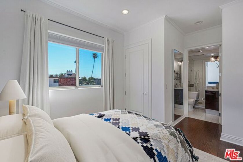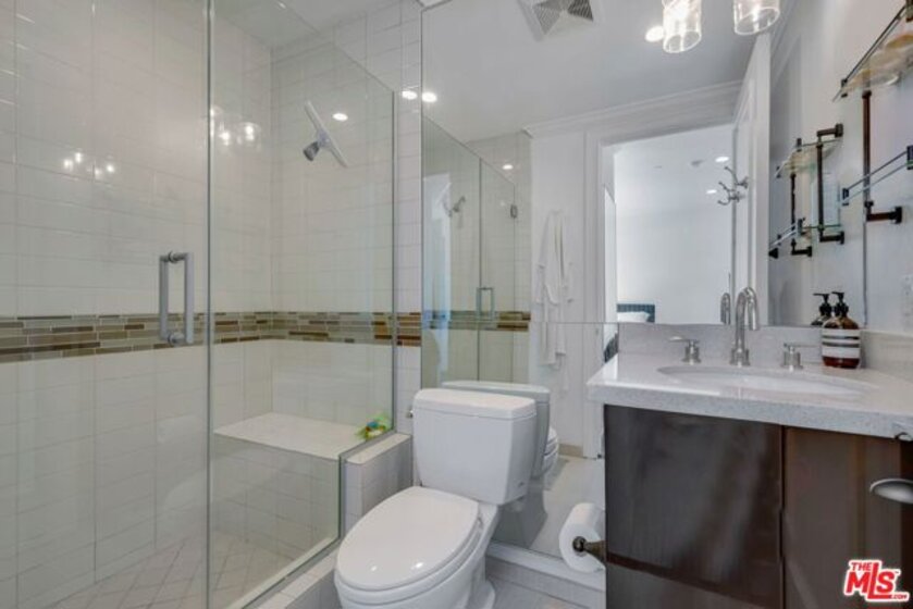 Prime WLA location. Brentwood/Santa Monica adjacent. Spectacular TOP FLOOR CONER UNIT, HIGH CIELINGS w/ balcony. No common walls. Quiet and Private. Two ensuite generously sized bedrooms. Two Door entry, with hall powder room in newer building. High ceilings throughout with recessed lighting and private balcony that leads to a wonderful North-East exposure with views from Brentwood to Century City. Primary suite includes dual walk-in closets and a large spa like bathroom, complete with a separate shower and deep soaking tub. The second bedroom features an en-suite bathroom with a glass-enclosed shower. Kitchen Bosch stainless steel appliances, custom cabinets, Caesar stone counters and Greystone floors. Laundry is in unit with washer and dryer hook-ups. Garage controlled access building w/ gated parking for 2 cars tandem. Located in a small, 7-unit. Front entrance has an "ADA-compliant ramp," "curb ramp" compliance. 2 Garage controlled access designated disabled person garage parking in building for residents. *Balcony inspection approved December 2024. *Romantic fireplace gives off considerable heat. "Fireplace" is to be considered decorative only.