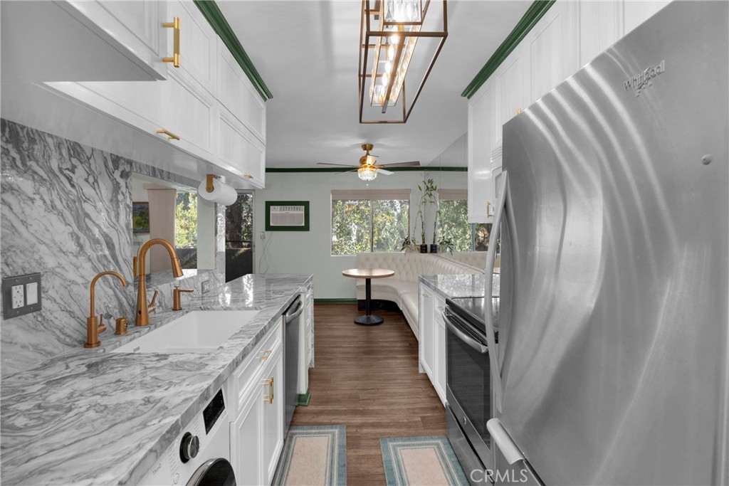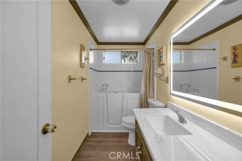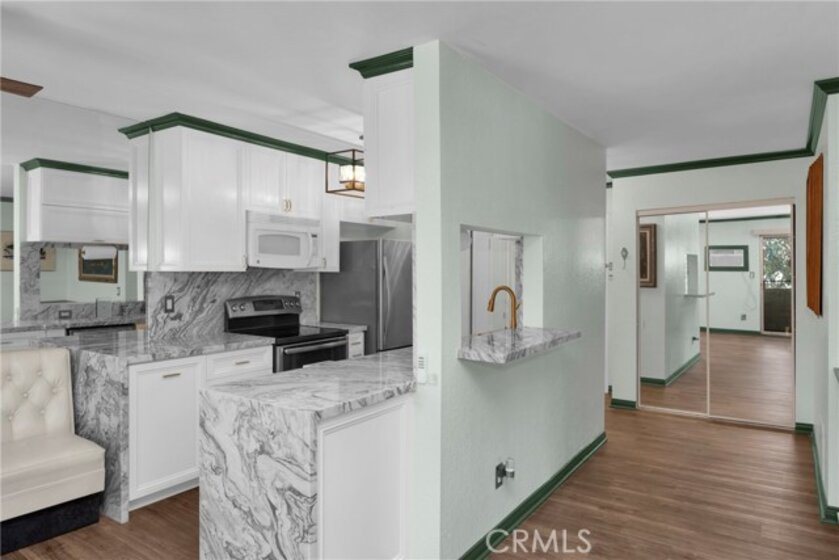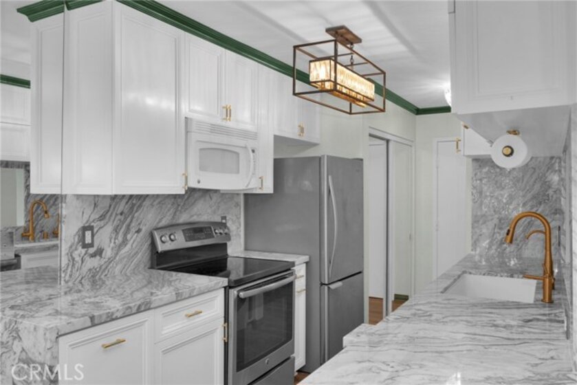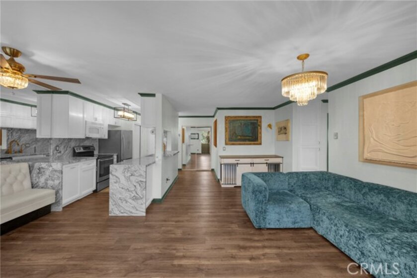 Perched on the top floor, this single-story 2-bedroom, 2-bath corner residence equipped with 2 private balconies and a private washer and dryer inside the home offers an unmatched level of convenience and exclusivity. Flooded with natural east-facing light, the home features elegant chandelier lighting, expansive windows, and two private balconies overlooking lush greenery for a tranquil Hollywood retreat. Over $50,000 in thoughtfully curated upgrades elevate the space, including an enlarged chef’s kitchen with stainless steel appliances, custom italian marble countertops and backsplash, and sleek modern finishes. Both bathrooms have been newly renovated to showcase luxurious onyx and Italian marble countertops, delivering a spa-inspired experience. Year-round comfort is ensured with a brand-new AC and heating system, while ample custom storage enhances everyday functionality. The residence includes three total parking spaces, featuring secure gated tandem parking for two plus an additional dedicated spot. Located moments from the Hollywood Bowl, theaters, dining, shopping, and major freeways, this sophisticated home offers the perfect balance of peaceful living and iconic Hollywood energy.