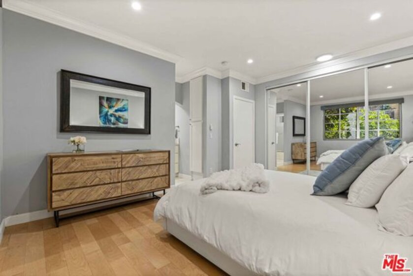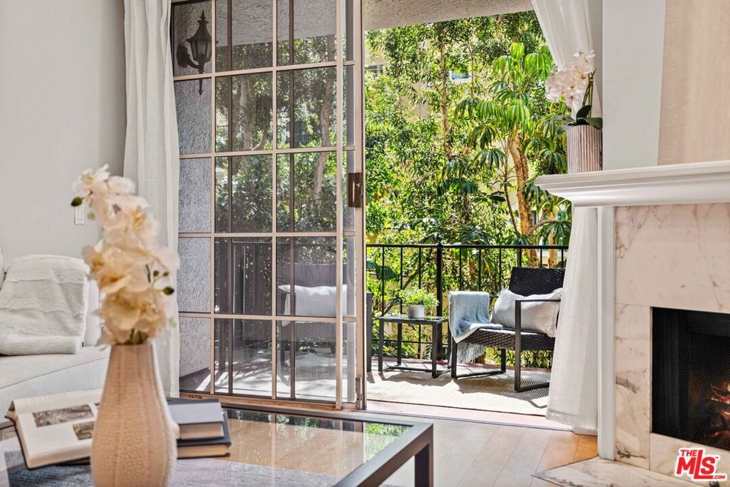 Exquisite and spacious updated one bedroom with west facing windows framing lush greenery views. The living room opens seamlessly to a sunny private patio, perfect for afternoon coffee or evening relaxation. A marble fireplace, built-in bar, recessed lighting and lovely dining area add warmth and sophistication. Gorgeous kitchen with stainless steel appliances, brand-new refrigerator, white quartz countertops, and abundant cabinet storage. The serene master bedroom includes generous closet space, updated shower/ tub and separate vanity area. Throughout the home, beautiful wood floors and crown molding create a timeless, cohesive aesthetic. This quiet home provides private laundry - including stacked washer/dryer; central A/C - new HVAC system installed in 2025; and two parking spaces. Extra storage and guest parking spaces available in the gated security garage. This exceptional community offers a charming landscaped courtyard with running stream, outdoor pool, spa, and gym. Located on a quiet street in the most desirable Westwood neighborhood, this home is just moments away from shopping, restaurants, parks and the UCLA campus.