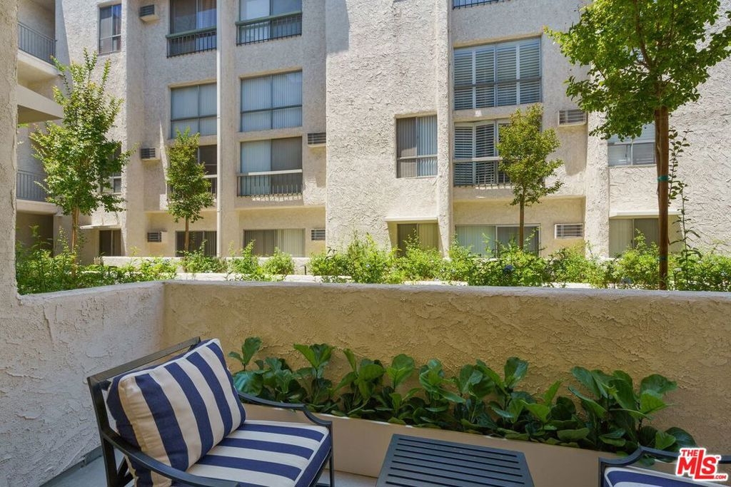 Recently renovated from top to bottom with high-end finishes, this stunning condo is a curated blend of modernism and sophisticated traditional aesthetics. The wide-open floorplan inspires casual living and spontaneous entertaining. Cook gourmet meals or share stories standing around the gorgeous open kitchen with sleek lines, glossy modern kitchen cabinets, stainless steel appliances and white quartz counters that waterfall down to the engineered hickory wood-style floors. Flow effortlessly from the kitchen to the dining area, through the living room and out to your own patio. Start your mornings sipping your favorite cappuccino among the tranquil and lush courtyard setting. Luxury bathroom amenities include white Carrara marble counters, herringbone tile flooring and a roman-style tub/shower enclosure. Other features include custom closet built-ins, gallery-style recessed lighting and Lutron dimming switches. This beautiful resort-style building feels more like a boutique hotel. Quarantine or not, it's like you're on vacation every day with luxury amenities including a 24-hour security guard, an on-site manager, a fitness center with a steam room and a sauna, a conference room and a party room with a kitchen. Imagine yourself relaxing outdoors among lush landscaping, waterfalls, koi ponds and turtles or dipping into the pool and spa. Enjoy a large park conveniently located across the complex. All this and you are just moments away from UCLA, Westwood Village and the upcoming purple line subway station. EV car charging is available onsite. HOA includes utilities and EQ ins.