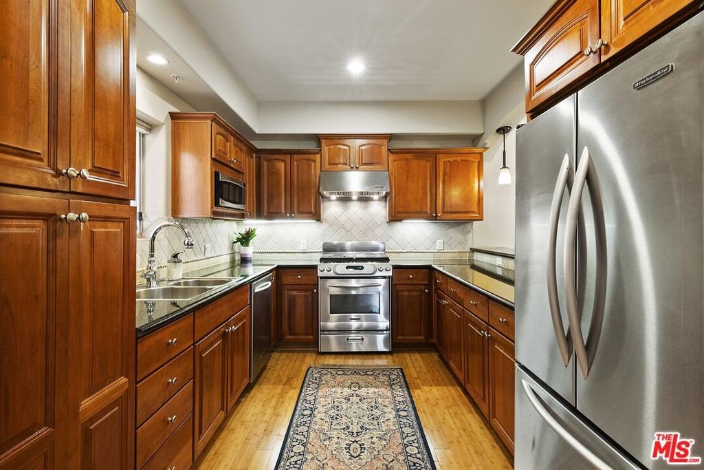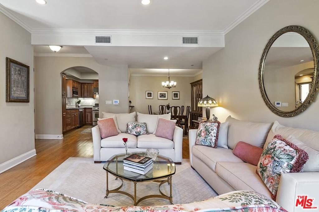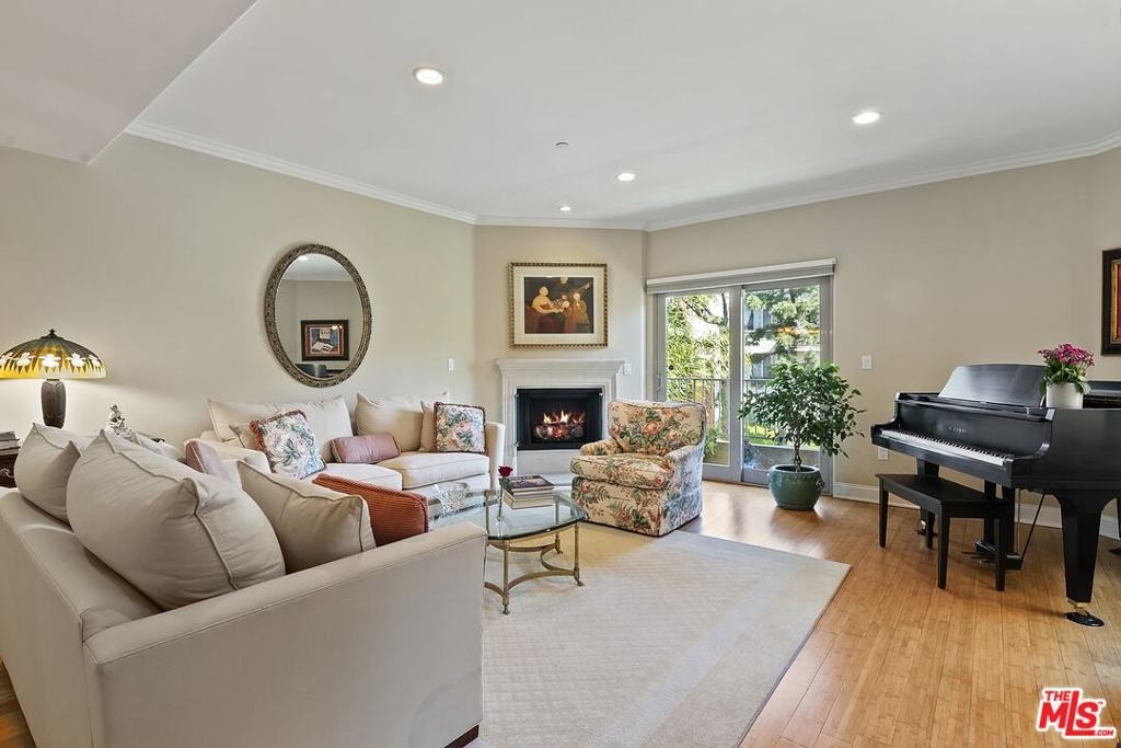 Sophisticated front facing 2 bed/2 bath corner unit filled with natural light & designer touches in immaculate 2006 built Contemporary Mediterranean 16-unit building in prime Westwood location. Entry with closet opens to sun-filled living room w/ crown molding, fireplace & sliding door to step-out balcony overlooking treetop views & greenery. Chef's kitchen w/ granite countertops, stainless steel appliances including gas range/oven, refrigerator, built-in microwave & breakfast bar opening to spacious dining room. Primary bedroom suite w/ no common walls includes walk-in closet, sliding door to large covered corner balcony ideal for morning coffee & relaxing. Primary bathroom w/ marble finishes, dual basins & separate bath & shower. 2nd bedroom w/ large closet currently used as den/office. 2nd full bathroom with marble finishes. Features include Bamboo flooring, archways, central ac/heat, ceiling fans in bedrooms, blinds in all rooms, side x side w/d laundry area w/ storage. Earthquake insurance included in HOA dues, 2-tandem secured parking w/ 2 storage units, guest parking, pets ok. Fabulous location close to fantastic Westwood Blvd. Zagat rated restaurants and markets including Bristol Farms, Sprouts & Whole Foods, UCLA Hospital/Medical Ctr/Campus, Sawtelle restaurants & Metro Expo Line. Fairburn Elementary. Move-in ready!