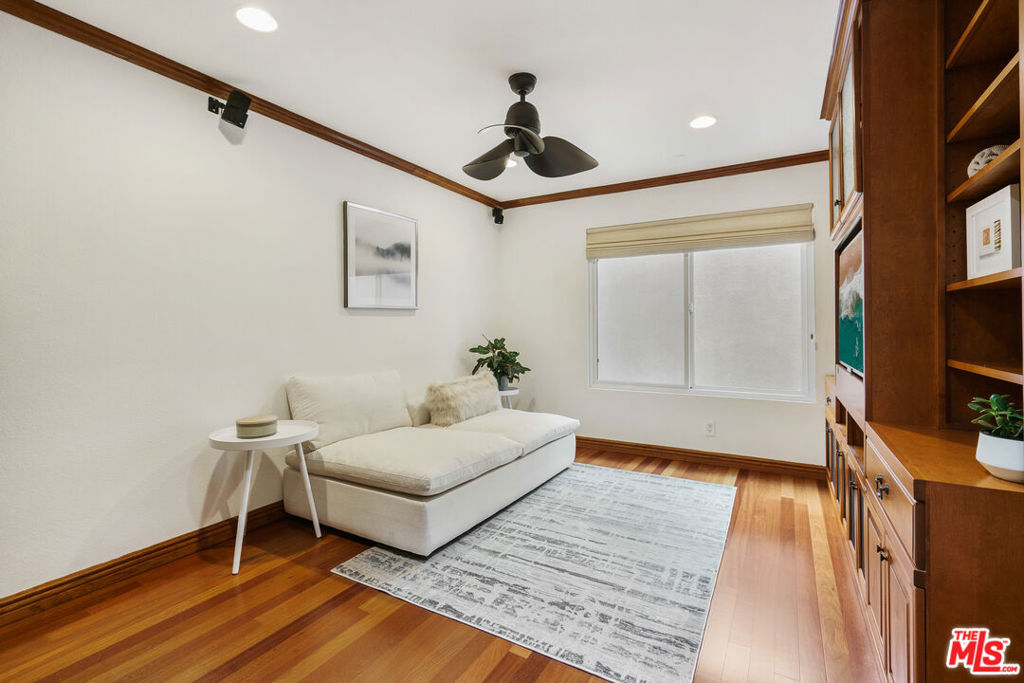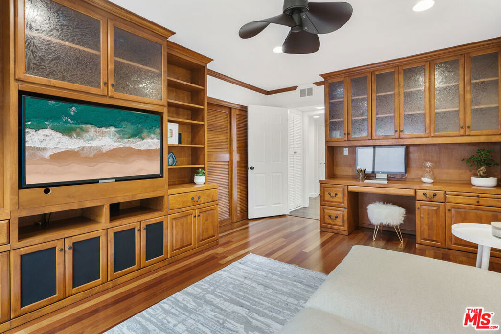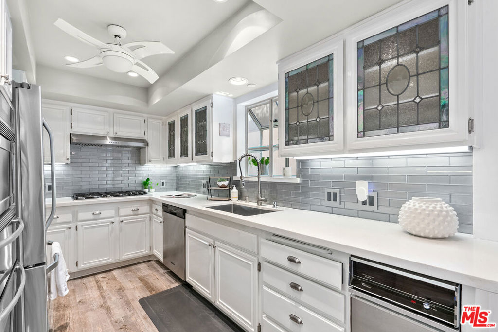 A quiet escape for the sophisticated city dweller. Rich, wood-style flooring runs throughout a bright and spacious living and dining area. Unwind by the fireplace or on your private patio. Whip up a meal in your jaw-dropping gourmet kitchen with top-notch, LG and Thermador appliances, Dacore Stovetop and Caesar stone counters. A spacious master bedroom suite features a large soaker jacuzzi tub. Versatile second bedroom can serve as a theater room and office. Dual-pane windows and additional storage in garage. A block away from the Century City Mall and minutes to all the Westside has to offer. Building is self-managed with healthy reserves and a low monthly HOA.