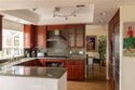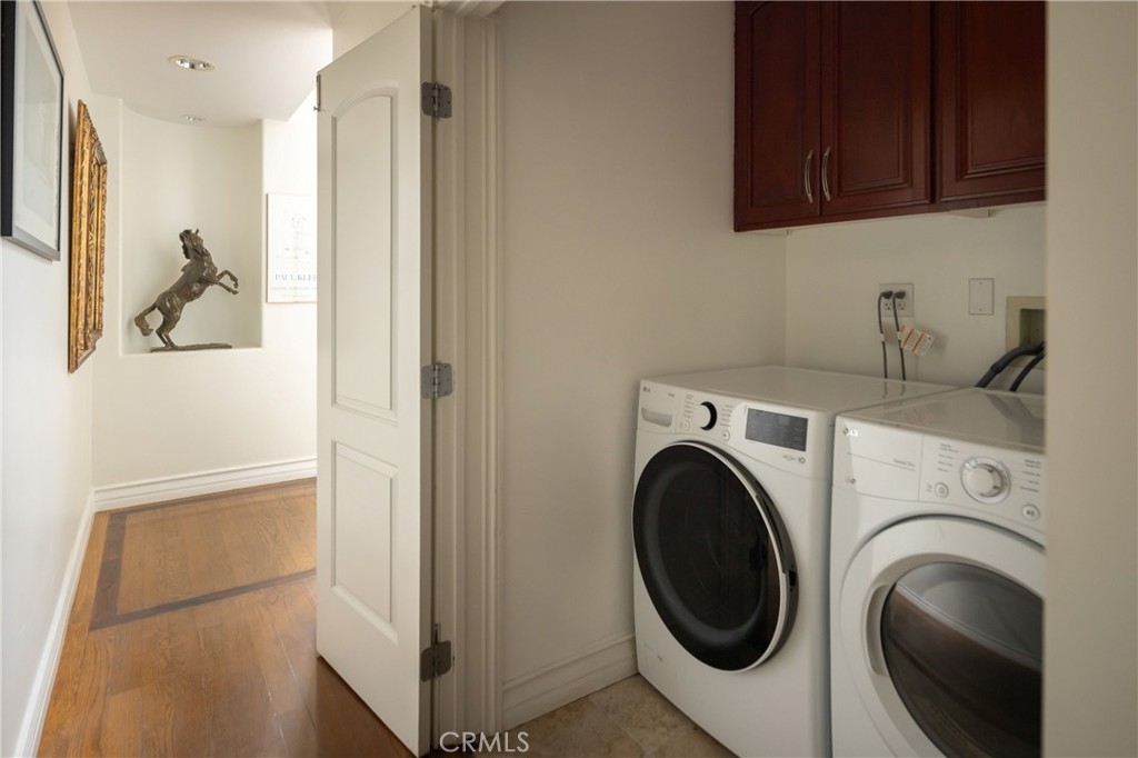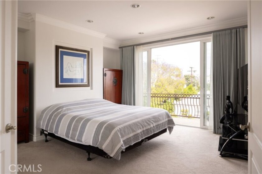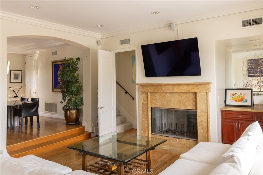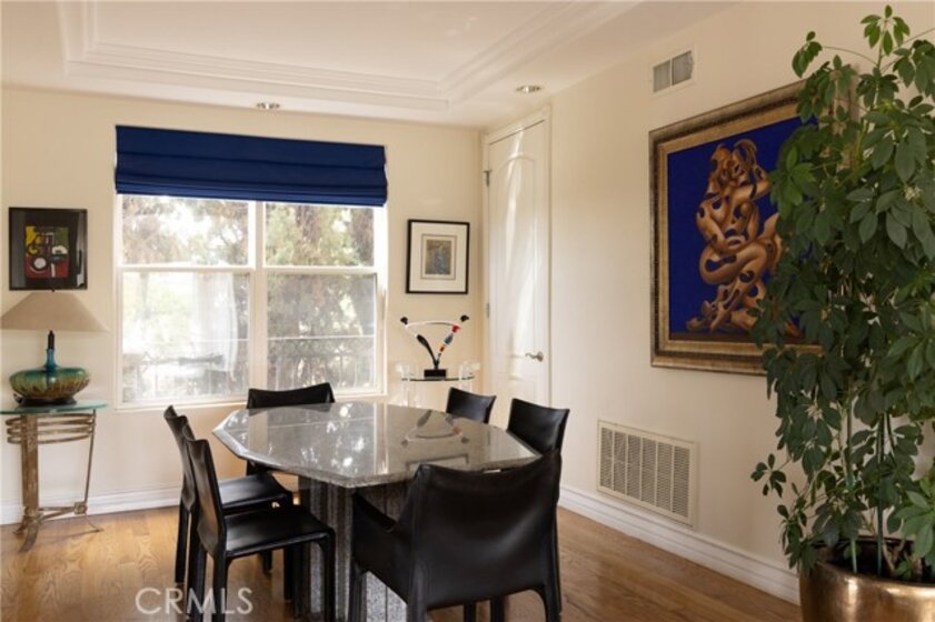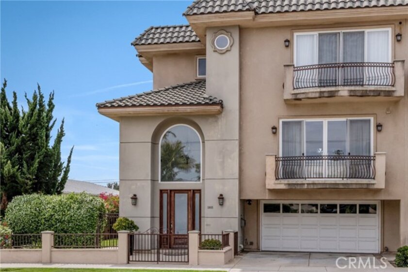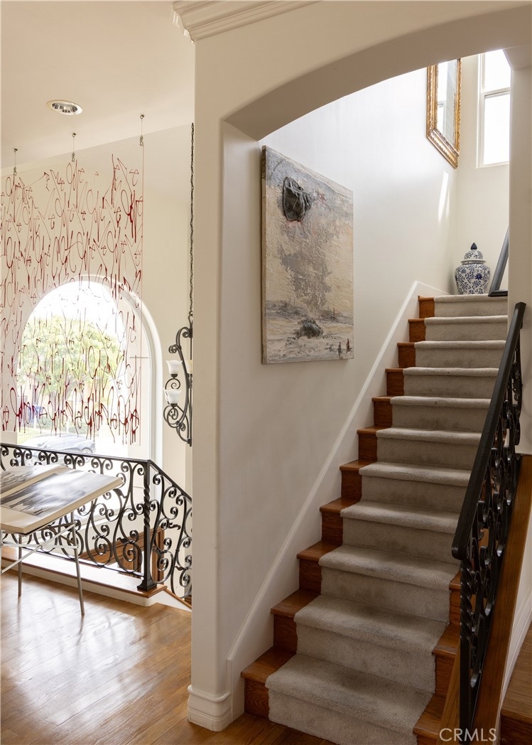 A dramatic two-story entry with a custom wrought iron staircase and rich hardwood floors makes an immediate impression. The formal living room is filled with natural light, featuring crown molding and custom drapery that flows into the dining room through an arched opening. A limestone fireplace anchors the sitting area, while the kitchen is outfitted with cherry cabinetry, honed granite, Viking appliances, and a bright island eating area with garden views. Upstairs, the primary suite offers a private balcony and a spa bath with double vanity, soaking tub, and separate shower. Three additional bedrooms are well-sized with updated baths, and laundry is conveniently located on the upper level. A private side yard, manicured landscaping, direct-access garage, and no HOA round out the package. Minutes from UCLA, Century City, Santa Monica, and the Sawtelle dining