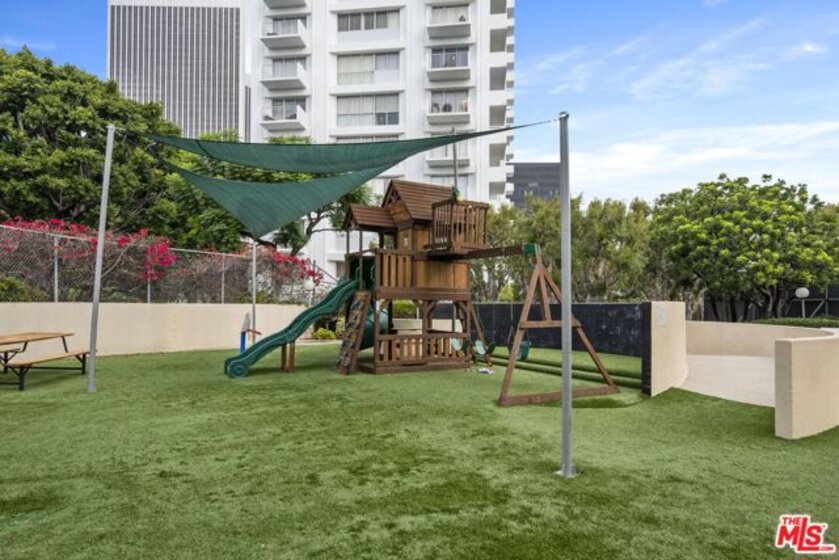 Located in one of Century City's most desirable buildings, this spacious 1 bed 1 bath ground floor unit offers an ideal combination of convenience, privacy, and outdoor space rarely found in condominiums in Los Angeles. The open concept living room and kitchen are designed for indoor outdoor living with floor to ceiling windows that open up to one of the largest private patios in the building. Tucked away on a tranquil interior garden, the patio's position makes it the ideal retreat just a short distance from Century City shops and restaurants. The primary bedroom features large floor to ceiling windows that overlook mature trees and landscaping, continuing a sense of serenity and privacy throughout the unit. Bathroom includes separate shower and tub. Chef's kitchen is ideal for entertaining with built in bar, modern appliances, and ample cabinet space. Natural light is abundant throughout the unit and the open concept design makes for effortless condo living. Amenities include resort style pool lined by cypress trees, full gym, private dog park, tennis court, valet parking, 24/7 security staff, manicured gardens and walking paths, children's playground, storage unit, dedicated parking space. Building is very pet friendly.