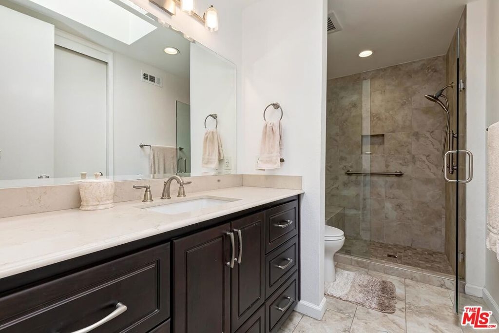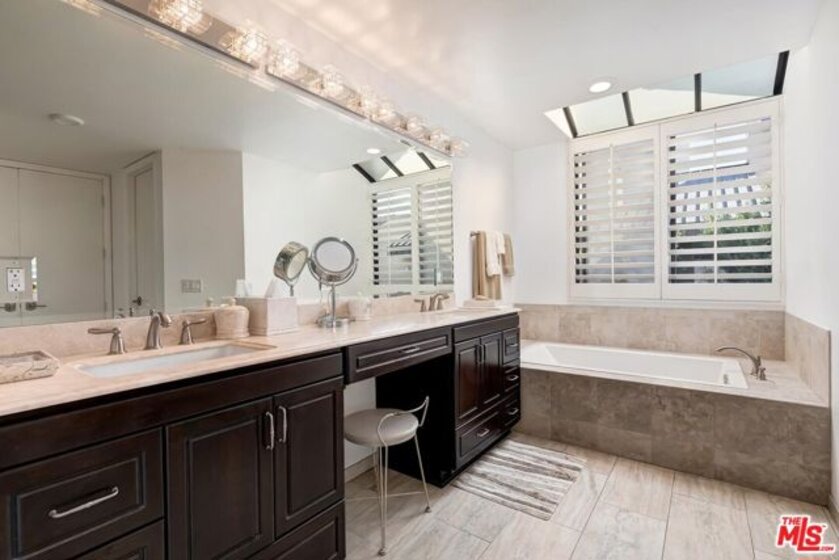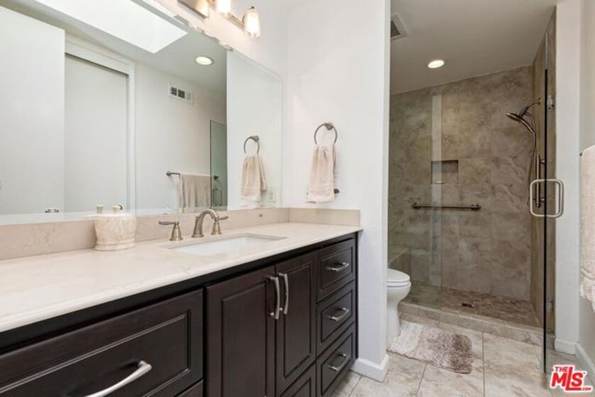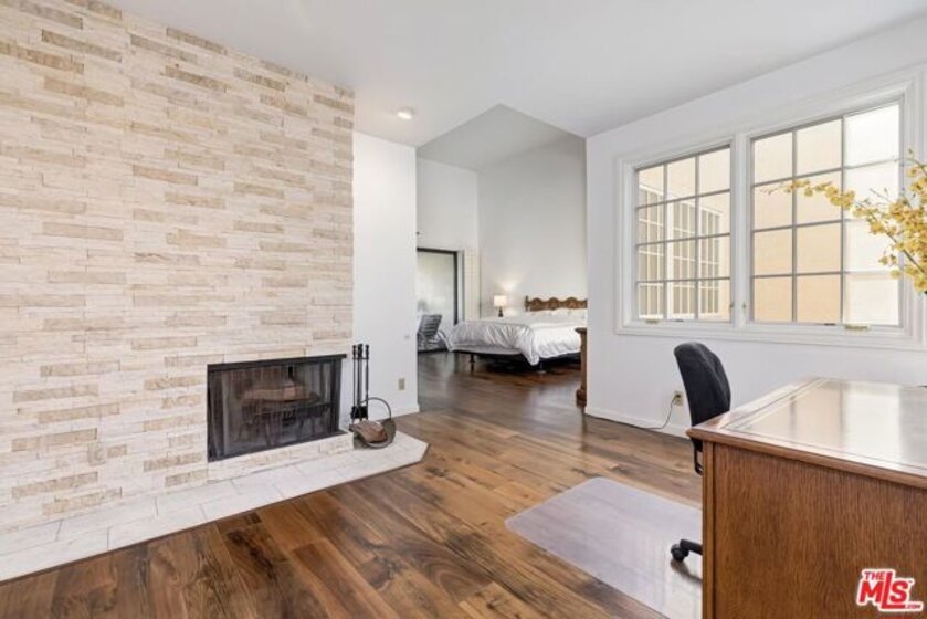 Welcome to 2435 Century Hill, a spacious south facing townhome-style remodeled residence with interior quiet location within the guard-gated Century Hill community in the heart of Century City. The gated entry opens through a large private patio to a generous living room flooded with natural light and a stone fireplace, recessed lighting, and room for a grand piano. The space flows naturally into the formal dining area, where a crystal chandelier hangs above French doors leading out to a private atrium area. Rich hardwood floors run throughout the main level, adding warmth and character. The remodeled kitchen features solid oak cabinetry, quartz countertops and stainless steel appliances. A built-in banquette nook off the kitchen provides a comfortable spot for dining. A separate half bath with pedestal sink and gold toned fixtures sits conveniently on the main level. The generous primary suite with vaulted ceilings, hardwood floors, a stacked stone fireplace, an adjoining office or den area, and sliding glass doors to a private balcony. The ensuite bath includes a glass-enclosed shower, dual vanity with a seated makeup area, walk in closets and a soaking tub. A second bedroom or office with built-in bookshelves and large windows offers flexibility. The home also includes an in-unit laundry room with full-size LG washer and dryer, and a private three car garage. Century Hill's 18-acre grounds include five swimming pools, tennis courts, a fitness center, and round-the-clock security. With Westfield Century City and Beverly Hills just minutes away, this is a rare chance to have luxury, privacy, and convenience all in one address.