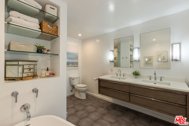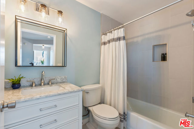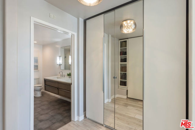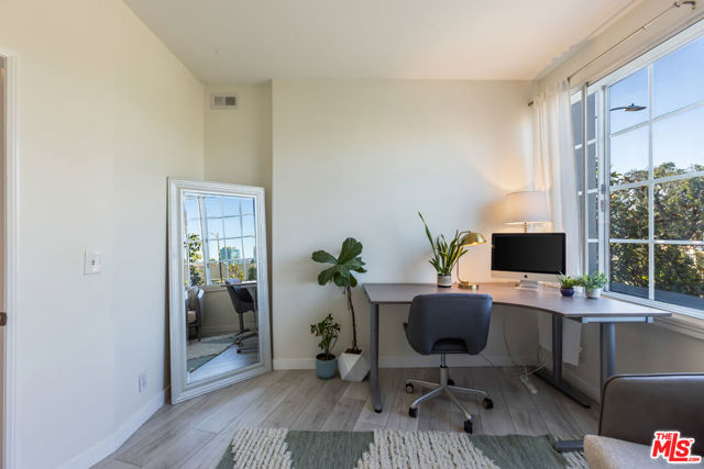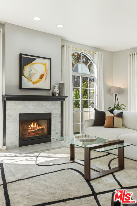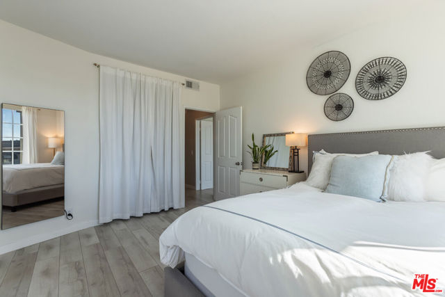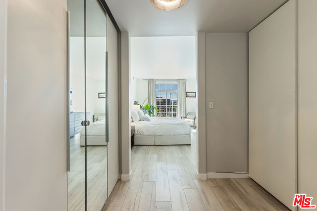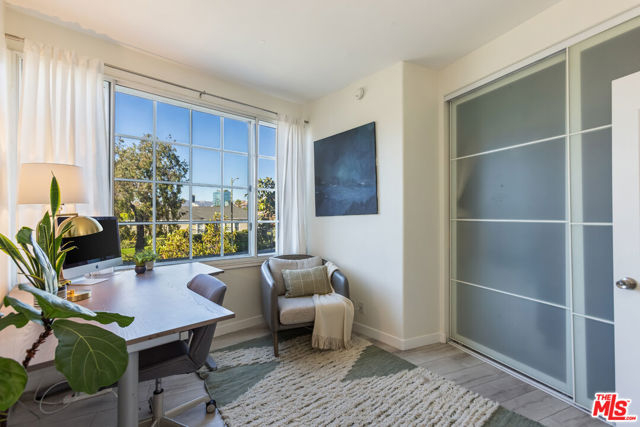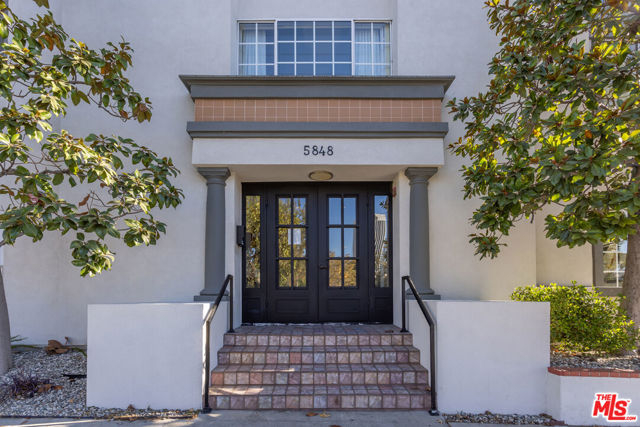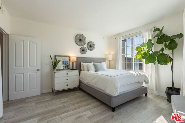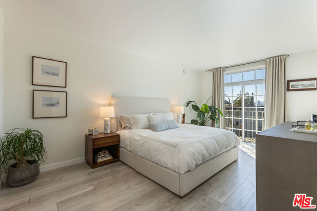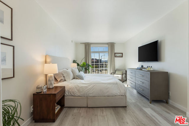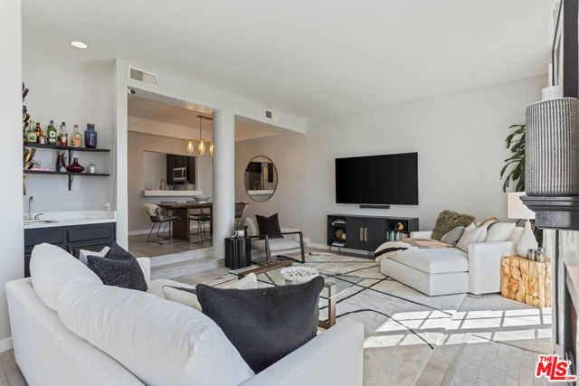 The one you have been waiting for. California casual sophistication defines this highly desired corner residence, showcasing gleaming plank flooring throughout, soaring ceilings, recessed lighting, and an abundance of natural light. Enter through the inviting foyer into the dedicated dining area, highlighted by an impressive tray ceiling and custom light fixture, which flows seamlessly into the expansive main living space. Here, an elegant marble fireplace with wood mantle, convenient wet bar with shelving, and dramatic floor-to-ceiling glass doors open to a collection of intimate balconies perfectly merging indoor and outdoor living. The well-appointed kitchen boasts considerable cabinetry, stainless steel appliances, and a wine refrigerator, while a chic powder room completes the main level. Upstairs, the serene primary suite offers a spacious bedroom, stylish closet, and dazzling ensuite bath with dual vanity, deep soaking tub, and separate shower. A comfortable sunlit second bedroom provides ample storage, while the third bedroom offers flexible potential as an office, den, or guest space. Both are serviced by a sizable hall bathroom with sleek vanity and tub-shower combination. A dedicated laundry room with full-size side-by-side washer and dryer, upper cabinetry, and additional hallway linen storage complete the second level. Perfectly situated near the Miracle Mile, LACMA, The Grove, Century City, Beverly Hills, and more, this residence places renowned dining, shopping, and entertainment right at your doorstep.