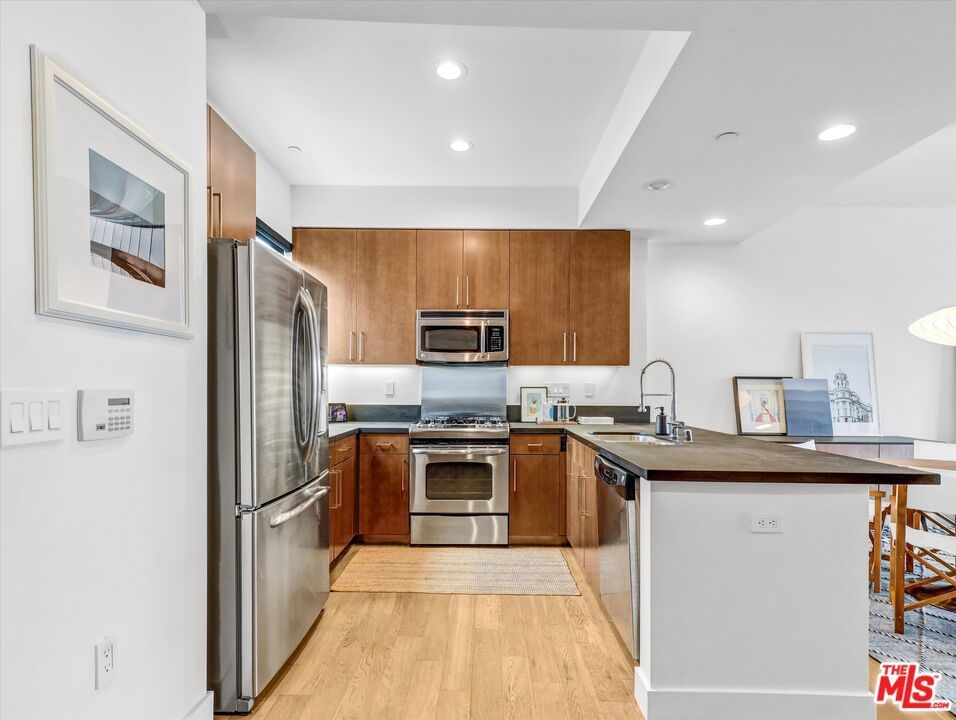 Introducing Unit 410 at the exclusive Metropol Hollywood. This rare and coveted one bedroom penthouse residence embodies the finest elements of elevated modern design. Greeted by nine-foot ceilings, the loft-inspired layout is framed by expansive windows that capture unobstructed east-facing views stretching from the iconic Griffith Observatory to the innovative Netflix campus. With over 900 sqft of living space, this vibrant, light-filled home offers dedicated spaces for dining, relaxing, and working. The kitchen features European cabinetry, granite countertops, stainless steel appliances, and provides abundant storage and prep space for any culinary endeavor. An adjacent office nook with a storage closet completes the entry area. The spacious en suite bedroom easily accommodates a king-size bed and enjoys the same sweeping Hollywood views. The spacious bathroom features Italian ceramic tile, a dual vanity with polished Carrara marble countertops, and an expansive walk-in wet room with a rain shower and soaking tub and then an adjacent walk-in closet designed by CA closets. The unit also features a washer/dryer. Metropol amenities include a recently remodeled fitness center, lounge deck, individual EV chargers, and 20 dedicated guest parking spaces.Located on a quiet residential street in close proximity to Hollywood Blvd, Netflix, Paramount and Sunset-Gower studios, Pantages and Fonda theaters, the Hollywood Palladium, Emerson LA as well as shopping conveniences, trendy cafes, boutique hotels and freeway access.