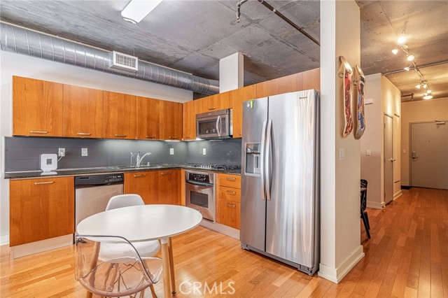 Discover the best value loft in Downtown Los Angeles at Market Lofts. This modern one-bedroom, one-bath residence offers approximately 600 square feet of open living space filled with natural light and city views. As one of the lowest-priced homes in the building, this loft combines style, location, and value rarely found in DTLA. The spacious layout features newly installed waterproof engineered plank flooring, high ceilings, and a contemporary kitchen with stainless-steel appliances and a large peninsula perfect for dining or entertaining. A generous walk-in closet and private balcony complete this beautifully designed urban retreat. Market Lofts is one of Downtown Los Angeles’s most popular residential communities, offering resort-style amenities including a swimming pool, spa, fitness center, private screening room, community lounge, and a 24-hour attended lobby. Secure parking and controlled access ensure comfort and convenience. Ideally located in the vibrant South Park neighborhood, residents enjoy immediate access to Ralphs grocery store, LA Live, Crypto.com Arena, Whole Foods, fine dining, coffee shops, and public transit—all just moments from your door. This move-in ready loft is perfect for professionals, creatives, and first-time buyers seeking an upscale yet affordable home in DTLA, as well as investors looking for strong rental demand in a premier location. With its modern finishes, unbeatable amenities, and lowest price in the complex, this is your opportunity to own a true downtown Los Angeles loft at exceptional value.