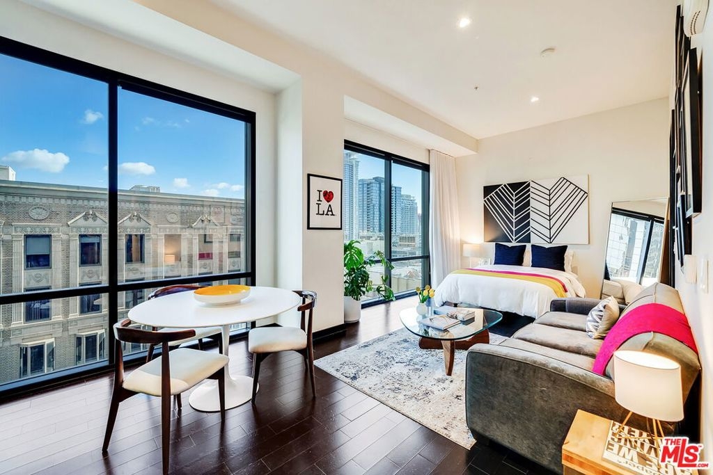 Downtown LA is set to be the center of the universe with the 2026 World Cup & 2028 Olympics coming soon! Experience the finest urban living in the heart of the LA Financial District. Hope Street Lofts is a boutique art deco condo building with only 80 units. Nestled on the 12th floor, the highly desirable end unit is a harmonious blend of modern elegance and urban sophistication. True urban dwelling with views of the bustling city down below. The open floor plan loft boasts floor-to-ceiling glass walls, 10-foot ceilings and warm dark hardwood floors. Natural light emanates throughout. The sleek kitchen features chocolate color cabinetry, granite countertops, stainless steel appliances with 5-burner gas cooktop. Upgraded lighting & a spacious walk-in closet and in suite washer/dryer are included! The building is protected by around-the-clock on-site security & includes a residence community center with pool table to unwind or entertain in. The building amenities include a wow-factor rooftop which provides breathtaking 360-degree panoramic views, sundeck, barbecue, a chic wet bar, a resident club room, gym with state of the art equipment and a helicopter pad. A true walker's paradise, where you won't be needing a car! Conveniently located directly above the 7th Street metro station with access to Hollywood, Culver City, Santa Monica & now Little Tokyo! This prime location is within steps from world class entertainment centers such as the Crypto.com Arena and LA Live. Across the street is shopping at the BLOC and Alamo Draft House Cinema! Culinary treats such as Bottega Louie and Little Sister are just a stone's throw away. The best shopping, dining & entertainment Downtown are within easy reach by foot or a quick subway ride away! Parking will never be an issue, as the unit comes with one unassigned parking space in an attached secure access garage. Downtown LA is undergoing an exciting redevelopment boom of luxury high-rise residences and hotels. Take advantage of living in one of the most coveted locations in Downtown LA!