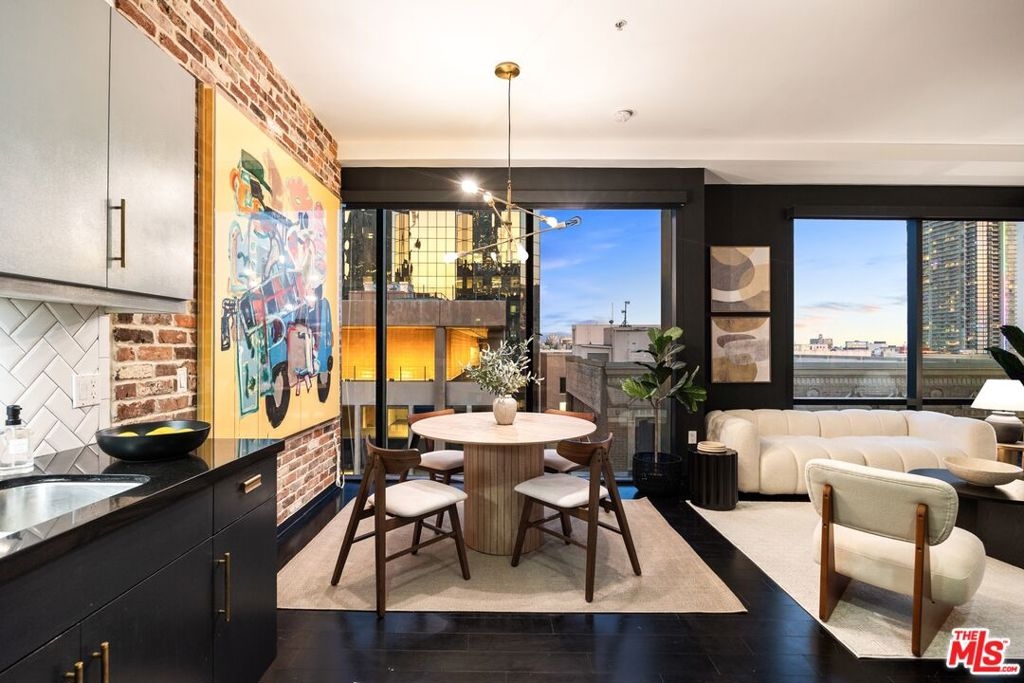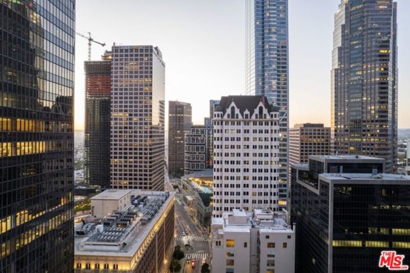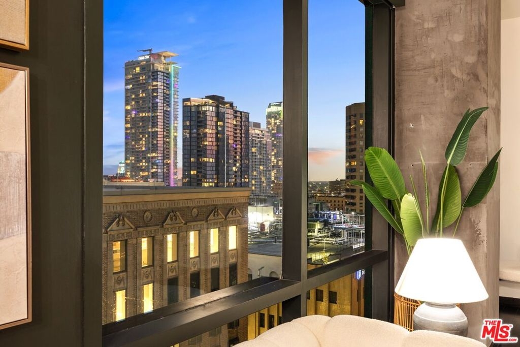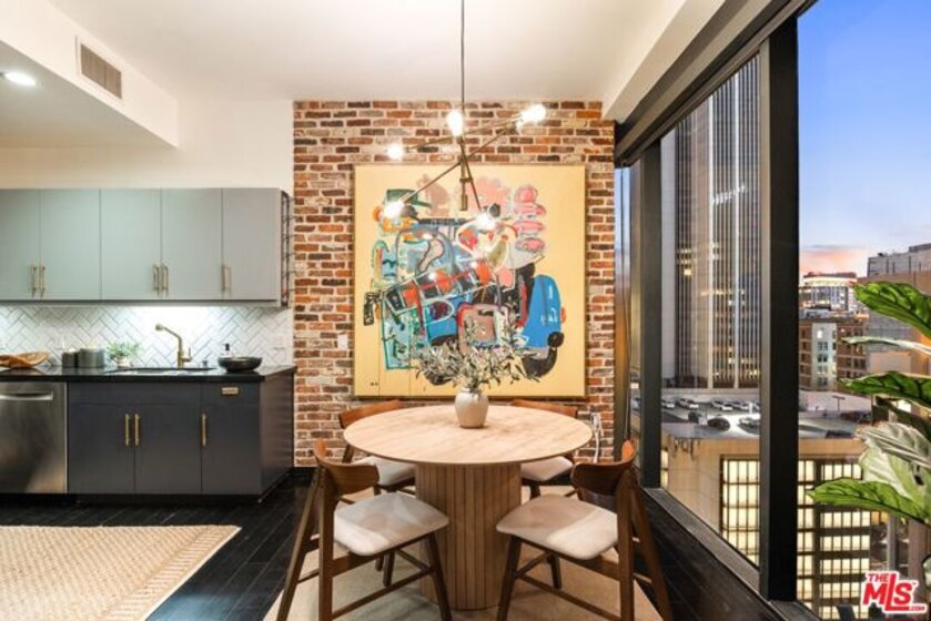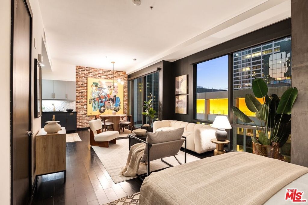 Nestled high on the 14th floor, the highly desirable end unit is a harmonious blend of modern elegance and urban sophistication. True urban dwelling with views of the bustling city down below. The open floor plan loft boasts floor-to-ceiling glass walls, tall gallery walls, 12-foot ceilings and warm dark hardwood floors. 2 unique brick accent walls and an East facing wall painted black. Natural light emanates throughout. The sleek kitchen features blue color cabinetry, white backsplash, granite countertops, stainless steel appliances and a new Bosch dishwasher. The bathroom features a soaking tub. Washer/dryer are included! 1 unassigned parking space included in the parking garage - exclusive to the Hope Street Lofts, with an elevator bank giving direct access to the 14th floor and the lobby. Hope Street Lofts is a boutique art deco condo building with only 80-units. Building amenities include 24/7 security, front desk concierge, a fitness center, game room, a rooftop with panoramic Downtown views, a helicopter pad, sundeck, barbecue grills and a chic wet bar. The rooftop was recently redone and new furniture has been ordered. Located in the Financial District of Downtown L.A. and directly above the 7th Street Metro Station. Access the best of urban dwelling at your doorsteps! Enjoy the best of food and beverages at the trendy Javiers or Bottega Louie. Near michelin star restaurants, world class museums, concept coffee shops and endless entertainment options. Across the street from the Bloc and Joeys. Only 2 blocks from Whole Foods and the Broad Museum is a stone's throw away. Experience a night at the LA Opera or a concert at the Walt Disney Concert Hall - only 4 minutes away. Attend a Lakers game at Crypto Arena. Entertain family and friends at LA Live. Easy access to freeways and public transportation. Truly, the best location in Downtown L.A.