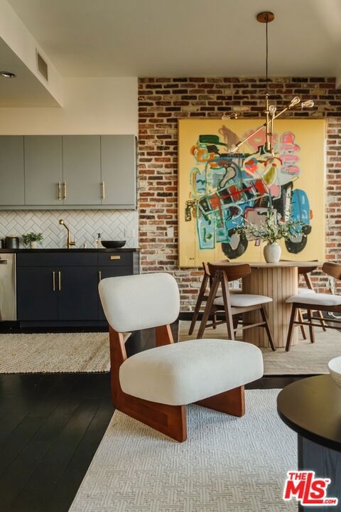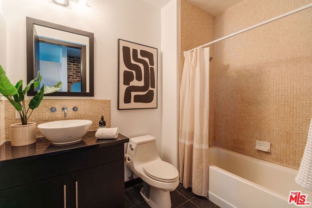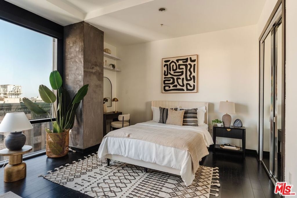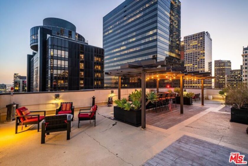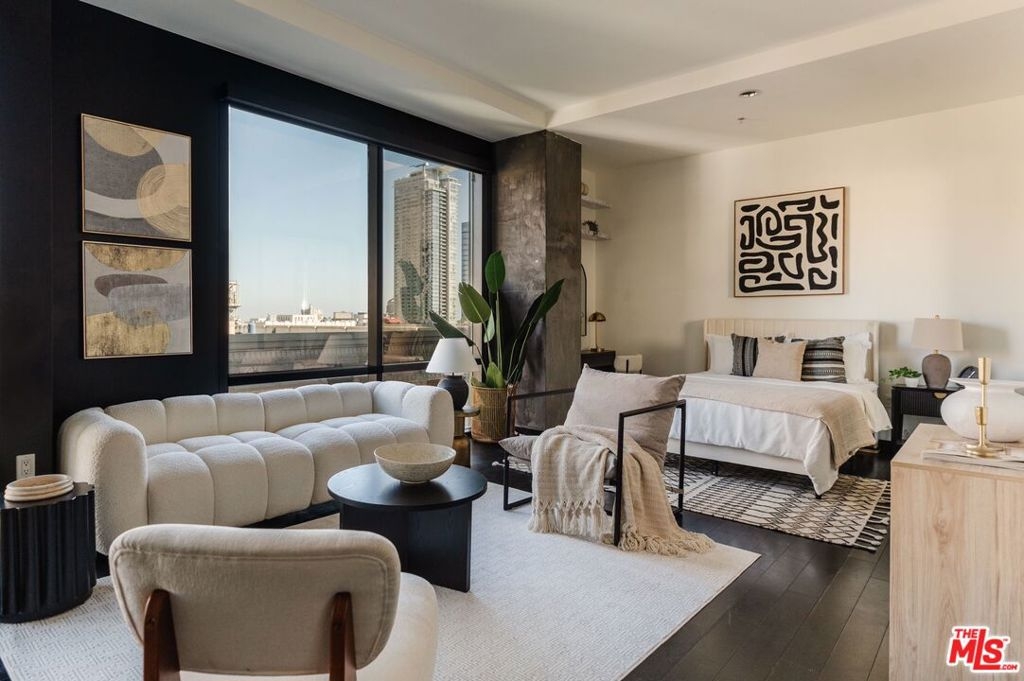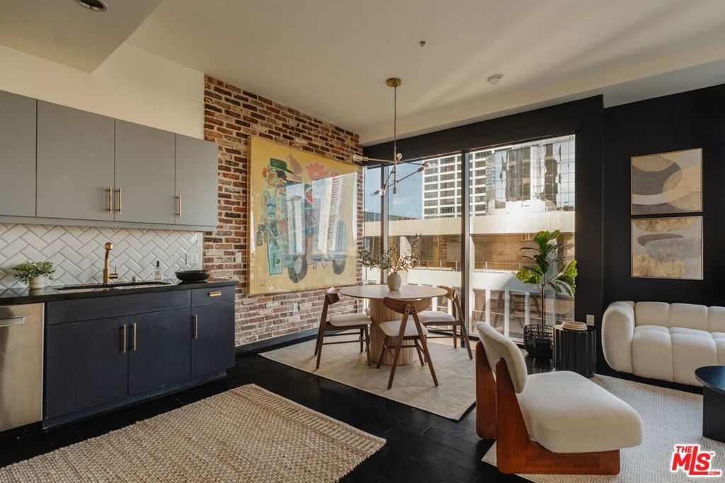 Nestled high on the 14th floor, the highly desirable end unit is a harmonious blend of modern elegance and urban sophistication. True urban dwelling with views of the bustling city down below. The open floor plan loft boasts floor-to-ceiling glass walls, tall gallery walls, 12-foot ceilings and warm dark hardwood floors. 2 unique brick accent walls and an East facing wall painted black. Natural light emanates throughout. The sleek kitchen features blue color cabinetry, white backsplash, granite countertops, stainless steel appliances and a new Bosch dishwasher. The bathroom features a soaking tub. Washer/dryer are included! 1 unassigned parking space included in the parking garage - exclusive to the Hope Street Lofts, with an elevator bank giving direct access to the 14th floor and the lobby. Hope Street Lofts is a boutique art deco condo building with only 80-units. Building amenities include 24/7 security, front desk concierge, a fitness center, game room, a rooftop with panoramic Downtown views, a helicopter pad, sundeck, barbecue grills and a chic wet bar. The rooftop was recently redone and new furniture has been ordered. Located in the Financial District of Downtown L.A. and directly above the 7th Street Metro Station. Access the best of urban dwelling at your doorsteps! Enjoy the best of food and beverages at the trendy Javiers or Bottega Louie. Near michelin star restaurants, world class museums, concept coffee shops and endless entertainment options. Across the street from the Bloc and Joeys. Only 2 blocks from Whole Foods and the Broad Museum is a stone's throw away. Experience a night at the LA Opera or a concert at the Walt Disney Concert Hall - only 4 minutes away. Attend a Lakers game at Crypto Arena. Entertain family and friends at LA Live. Easy access to freeways and public transportation. Truly, the best location in Downtown L.A.