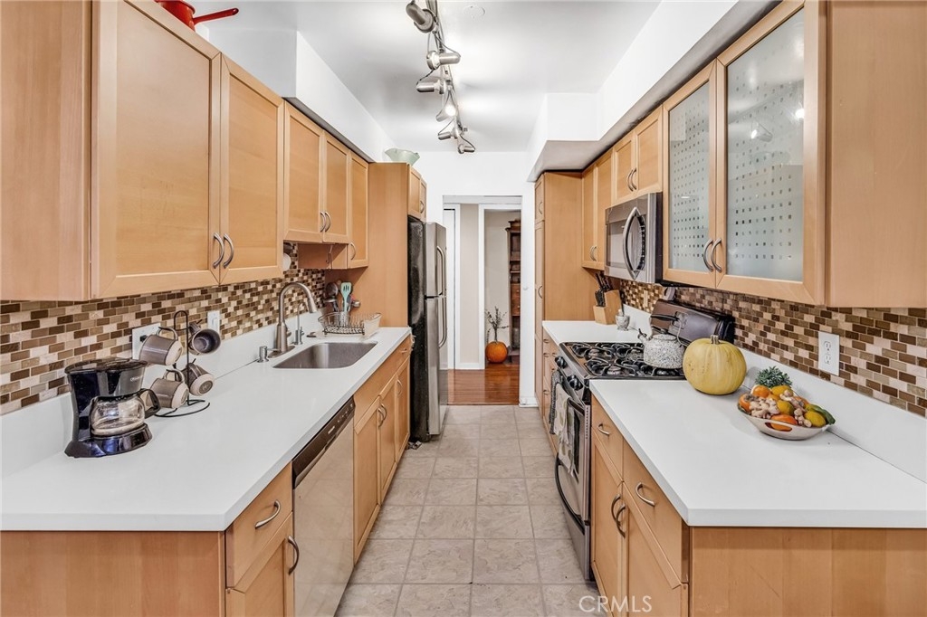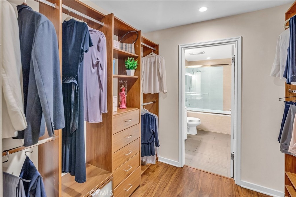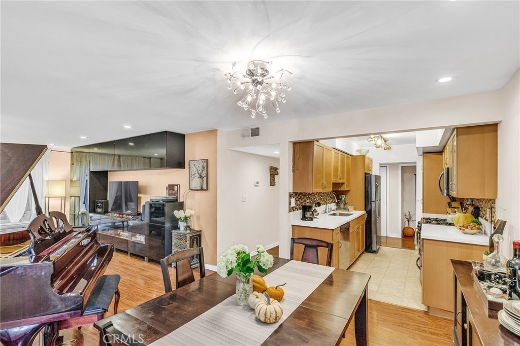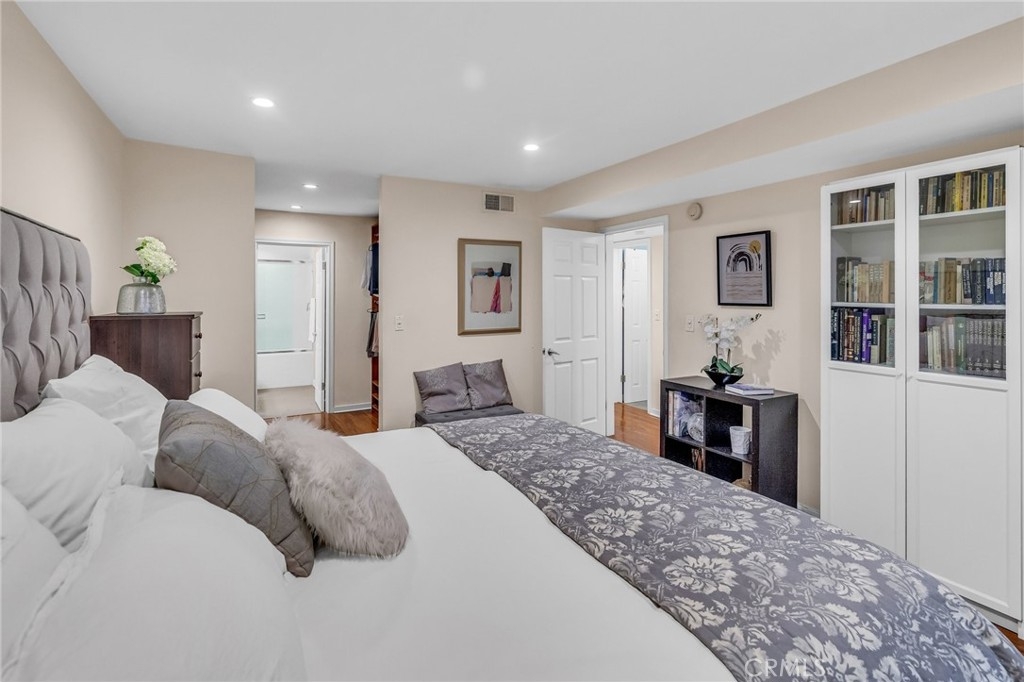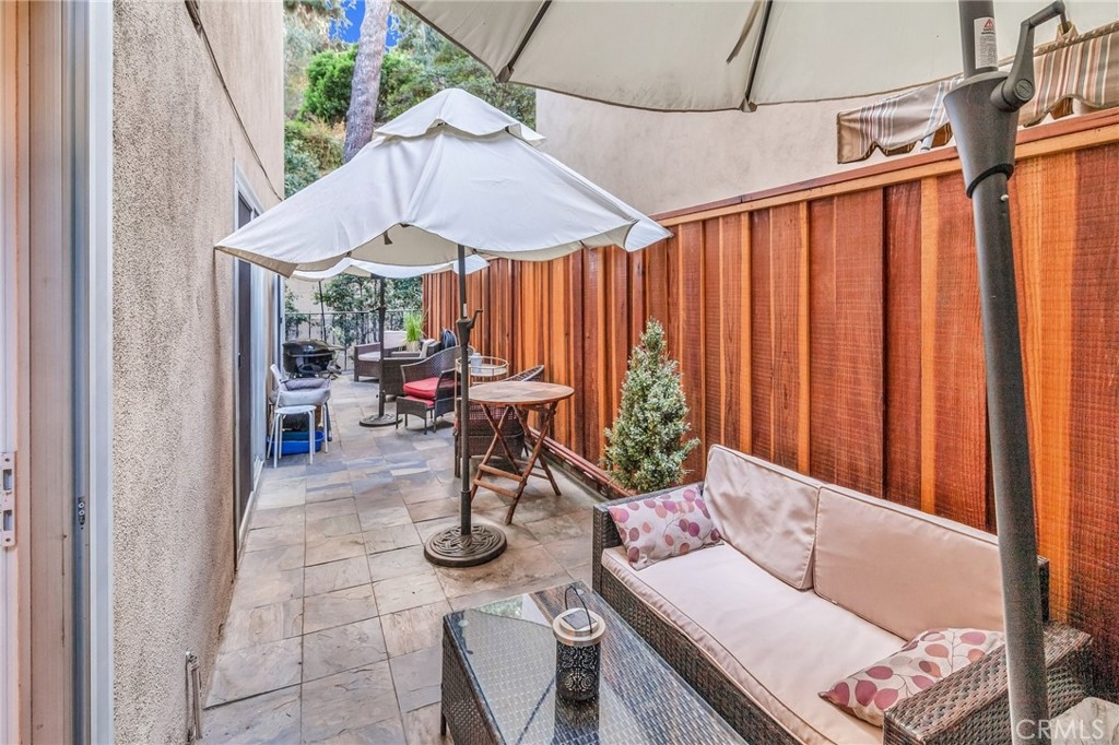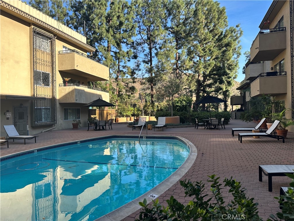 Discover this rare gem at The Highlands! Hollywood elegance and hillside serenity surround this rear facing unit. This home has 2 bedrooms and 2 bath rooms, with a spacious living room and an open floor plan which connects to the dining room. The kitchen has quartz countertops and sleek stainless steel appliances that offer a modern and sophisticated touch. The beautiful master suite has a custom closet space that leads to the ensuite bathroom. The 2nd bedroom has custom cabinets as well. Each room elegantly extends onto an extra large private patio, a unique feature that seamlessly blends the indoors with the world outside. There are two side-by-side parking spaces, and extra storage in the garage. The Highlands community was designed by the esteemed Mid-Century Architect Paul R. Williams, and offers a resort-like range of amenities including 2 pools, fitness room, tennis courts, hot tub, dog park area, and a large community room. Truly a woodland tranquil oasis, in the heart of the city. It's just a short walk to the Hollywood Bowl and trendy restaurants, shops, grocery stores, hiking trails and parks.