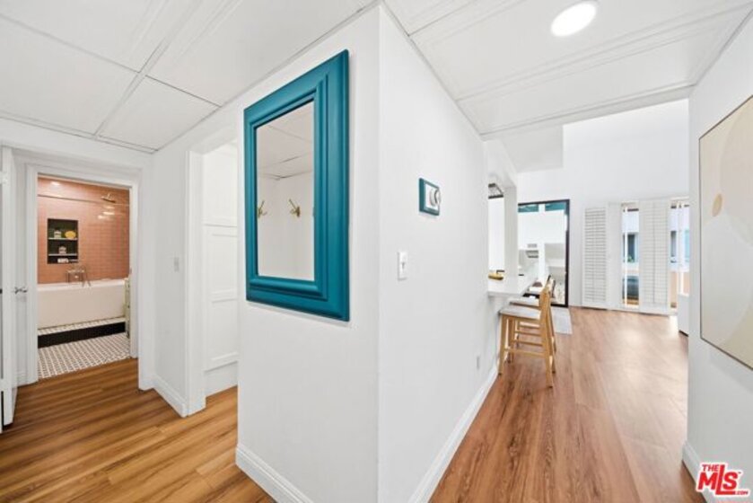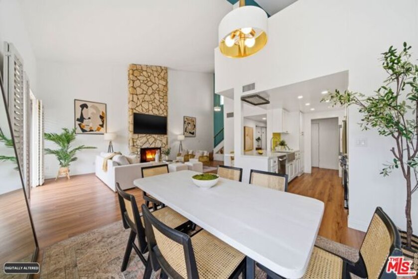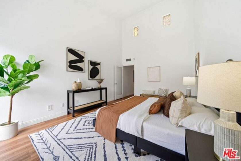 Two-story top floor penthouse with dramatic high ceilings with a large balcony off the living room and a rooftop deck off the spacious loft area. The kitchen & bathroom have both been remodeled and the primary bedroom has soaring high ceilings. Other features include a dramatic mid century style fireplace in the living room, Central AC, a walk-in closet, lots of storage and two parking spaces. Homeowners dues include water and earthquake insurance. This is the perfect location, walking distance to almost all of the best shops and restaurants in Brentwood.
