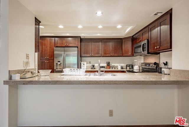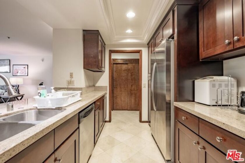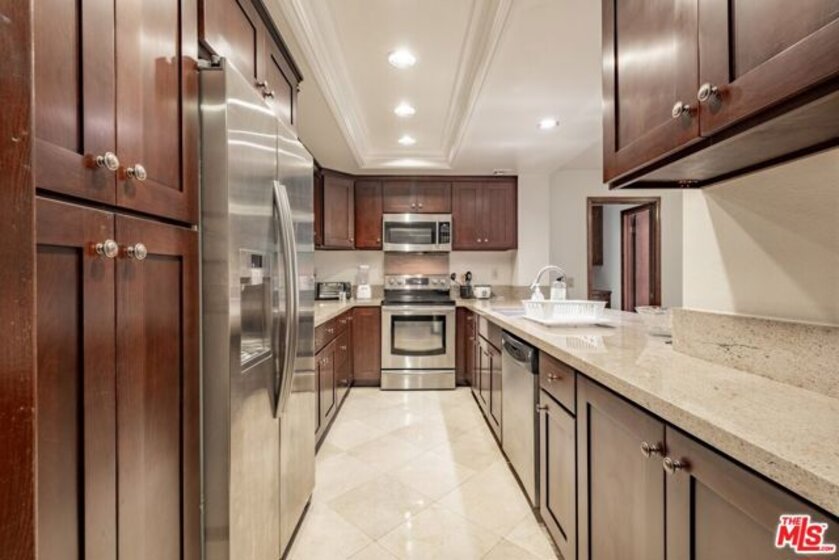 Discover this beautifully upgraded 2-bedroom, 2-bathroom condo at The Promenade West. Featuring an open floor plan, this 1,327-SqFt unit includes a patio and offers stunning views of city lights and treetops from the balcony. The completely remodeled kitchen boasts Caesarstone countertops, stainless steel appliances, designer cabinetry, recessed lighting, and stone tile flooring. The guest bathroom is elegantly renovated with a Caesarstone countertop and a luxurious glass-enclosed shower with stone tile. The spacious primary bedroom includes a large walk-in closet. Promenade West provides full-service luxury condominium living, with amenities such as ample guest parking, 24-hour security and concierge, a pool, spa, exercise room, sauna, on-site manager, basic cable TV, and earthquake insurance. The common areas feature an on-site dog park and lush green gardens with serene waterfalls. Convenient local stores and dry cleaners are just steps away. This unbeatable location is within walking distance of the Disney Concert Hall, Ahmanson Theater, Mark Taper Forum, Dorothy Chandler Pavilion, Grand Park, The Broad Museum, restaurants, courts, City Hall, and the upcoming Metro Regional Connector.